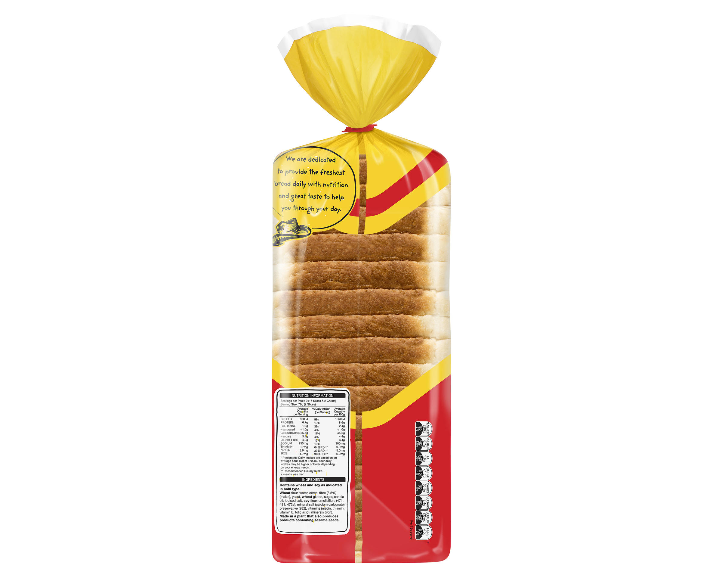 Wheat flour, water, cereal fibre (3.5%) (maize), yeast, wheat gluten, sugar, canola oil, iodised salt, soy flour, emulsifiers (471, 481, 472e), mineral salt (calcium carbonate), preservative (282), vitamins (niacin, thiamin, vitamin E, folic acid), minerals (iron).