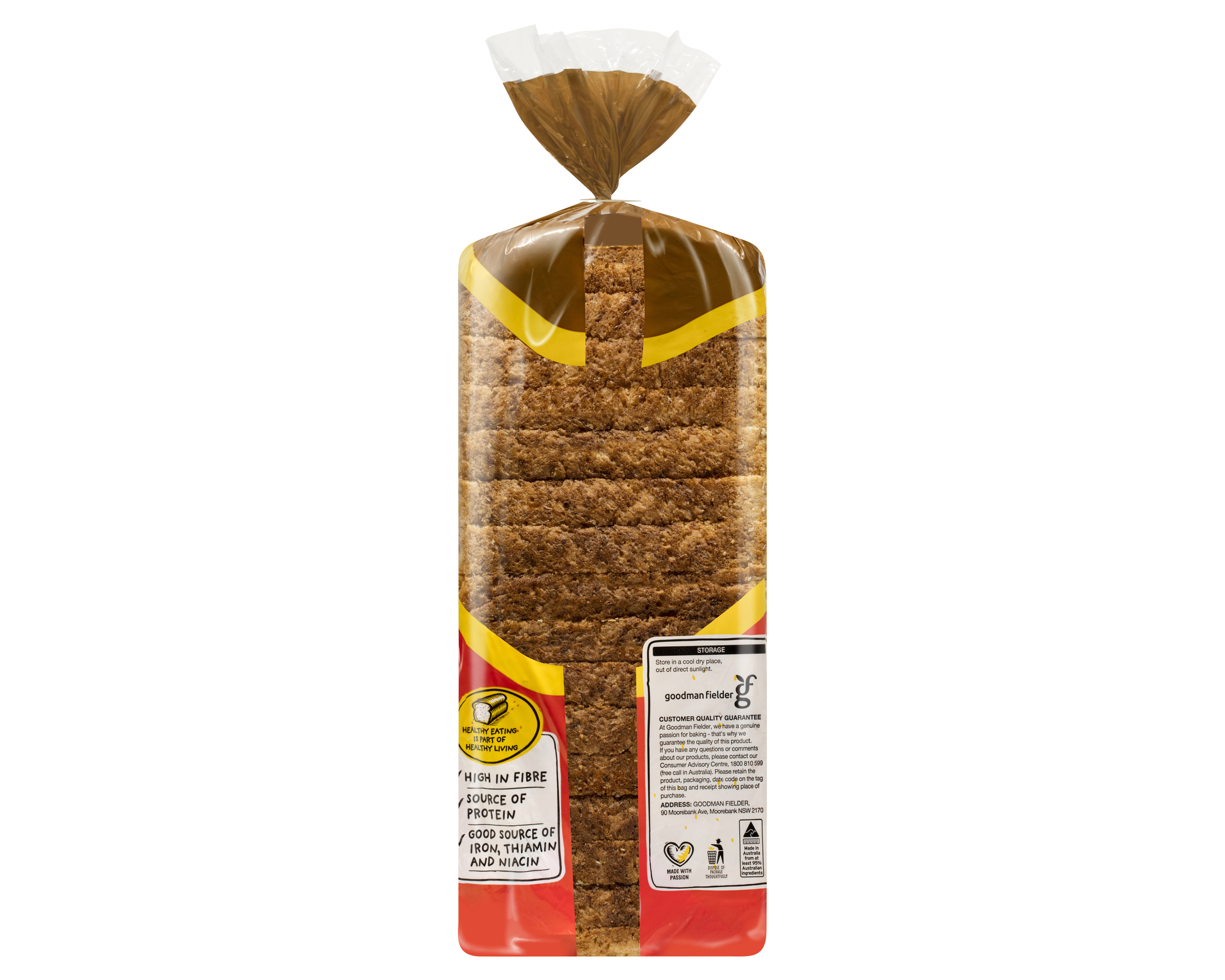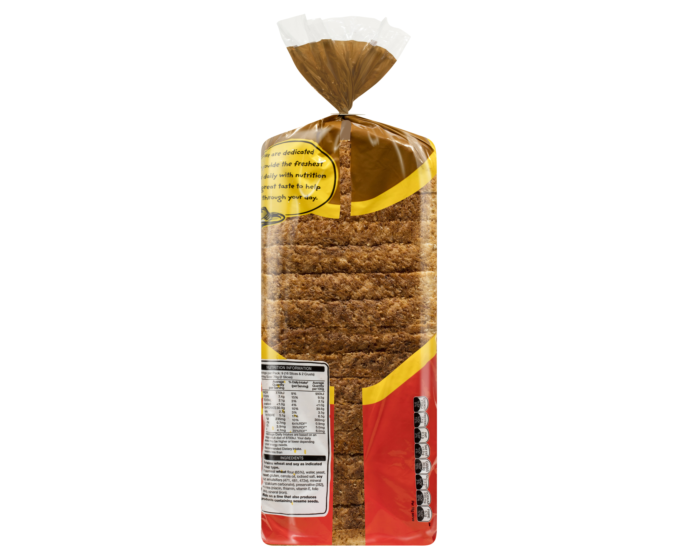 Wholemeal Wheat Flour (65%), Water, Yeast, Wheat Gluten, Canola Oil, Iodised Salt, Soy Flour, Emulsifiers (471, 481, 472e), Mineral Salt (Calcium Carbonate), Preservative (282), Vitamins (Niacin, Thiamin, Vitamin E, Folic Acid), Mineral (Iron).