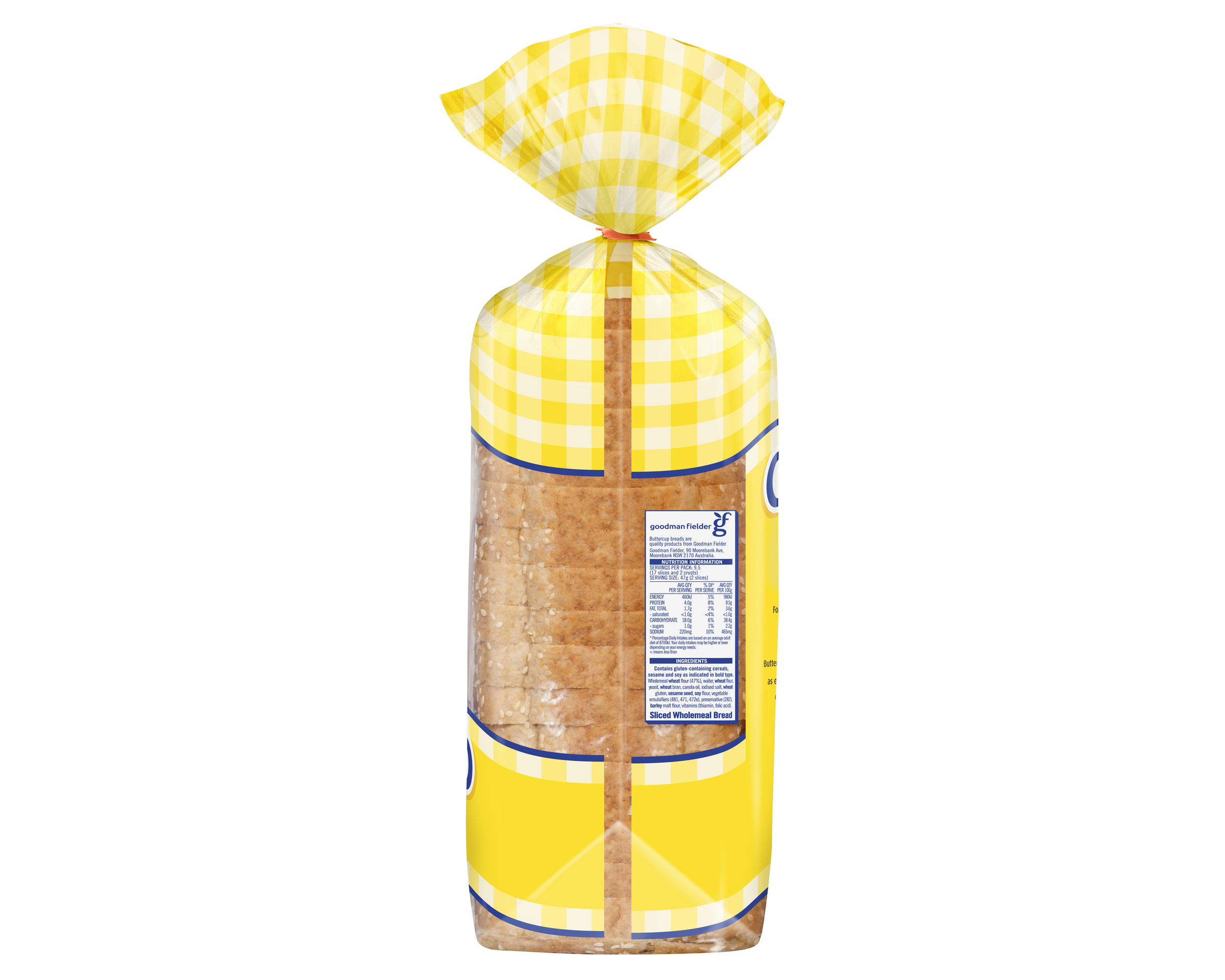 Wholemeal wheat flour (47%), water, wheat flour, yeast, wheat bran, canola oil, iodised salt, wheat gluten, sesame seed, soy flour, vegetable emulsifiers (481, 471, 472e), preservative (282), barley malt flour, vitamins (thiamin, folic acid).