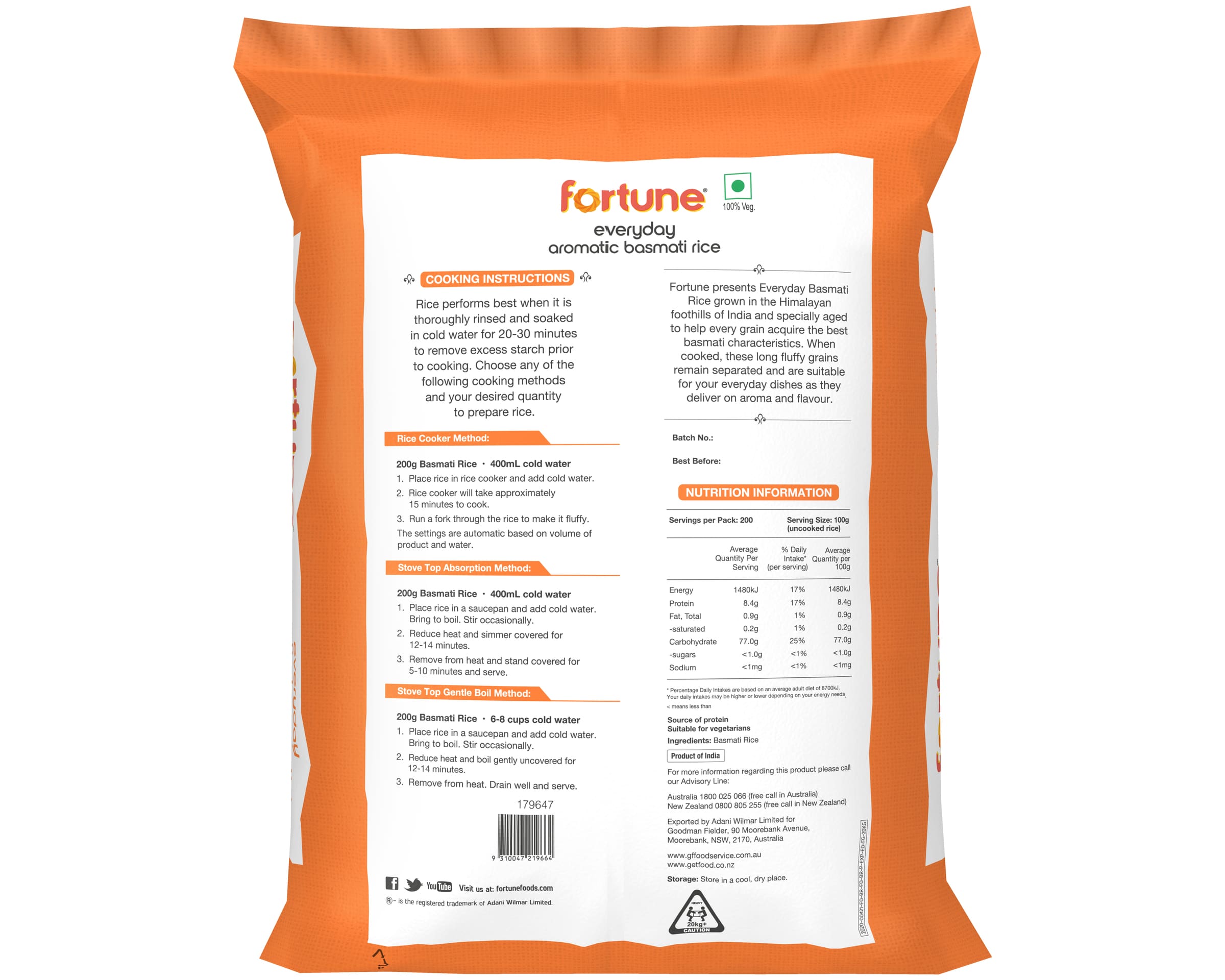 Fortune presents Everyday Basmati Rice grown in the Himalayan foothills of India and specially aged to help every grain acquire the best basmati characteristics. When cooked, these long fluffy grains remain separated and are suitable for your everyday dishes as they deliver on aroma and flavour. .