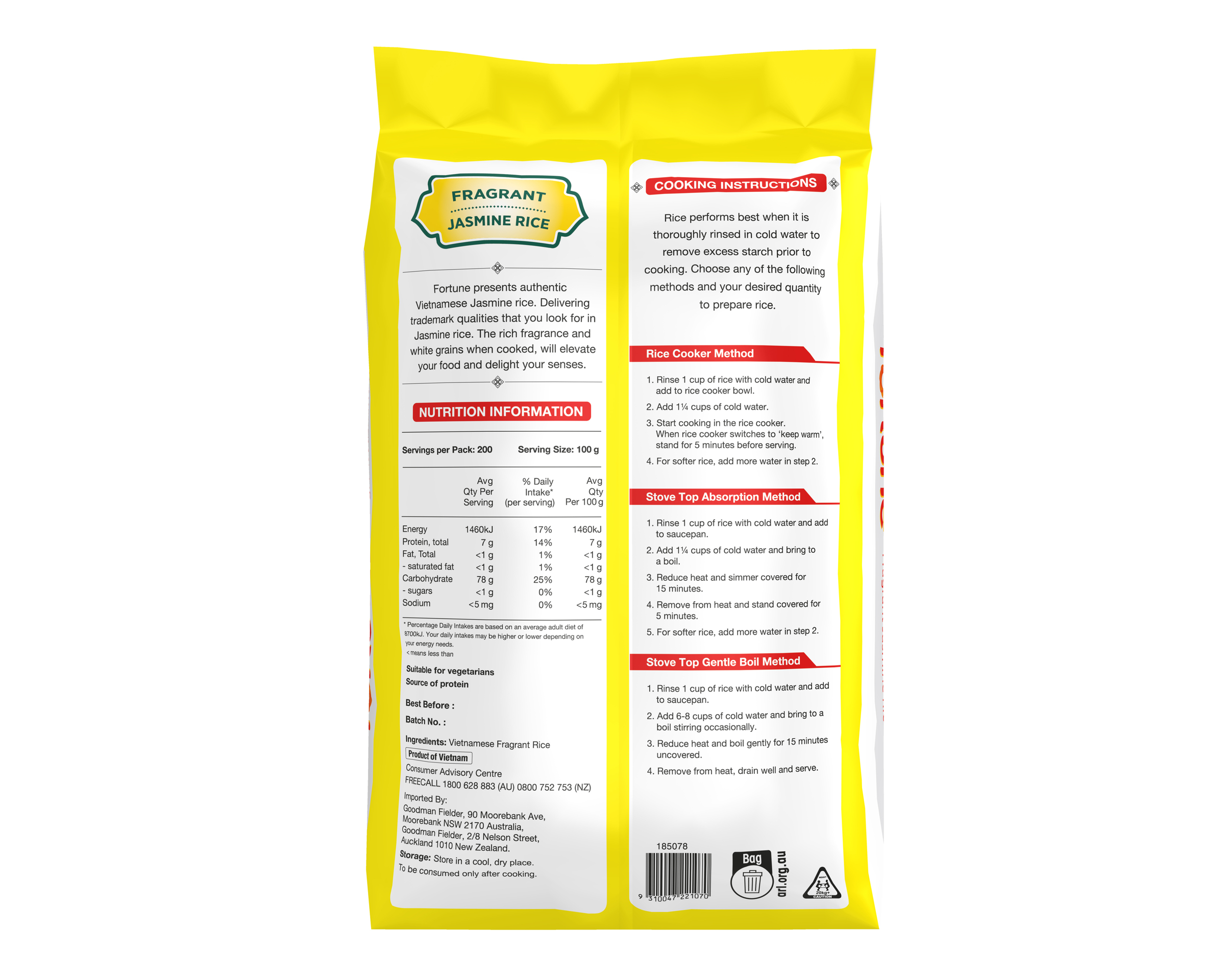 Fortune presents authentic Vietnamese Jasmine rice. Delivering trademark qualities that you look for in Jasmine rice. The rich fragrance and white grains when cooked, will elevate your food and delight your senses. .