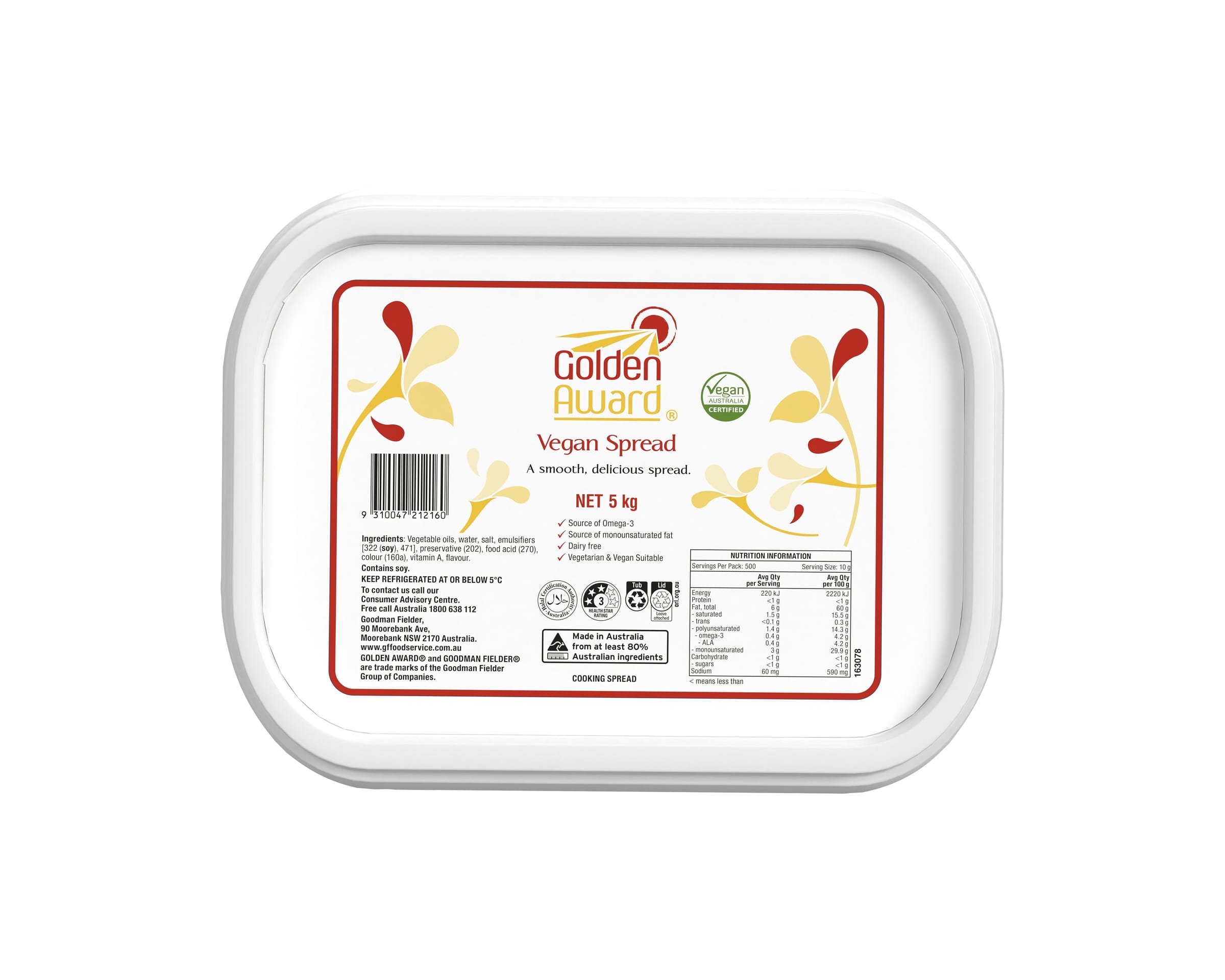 Golden Award Vegan Spread 1kg contains 49% less sodium than regular salted butter† and has a 3. 5 Health Star Rating, making it a healthier choice for modern menus appealing to today’s health focused customers.