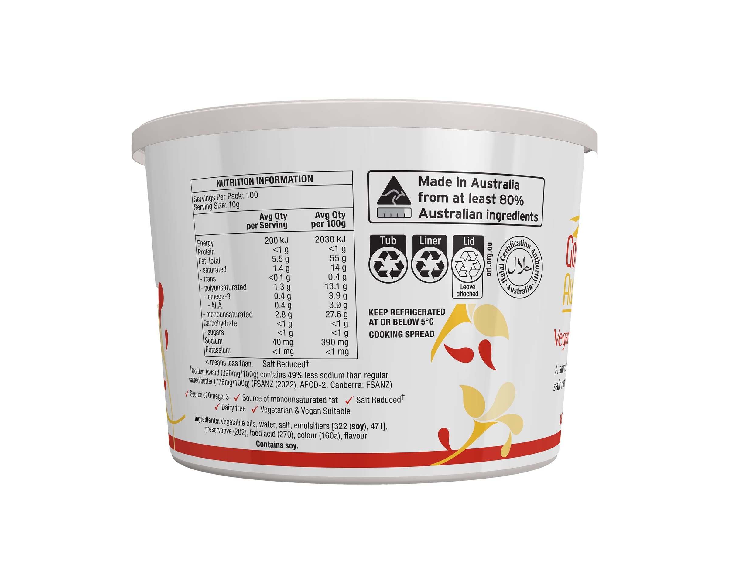 Golden Award Vegan Spread 1kg contains 49% less sodium than regular salted butter† and has a 3. 5 Health Star Rating, making it a healthier choice for modern menus appealing to today’s health focused customers.