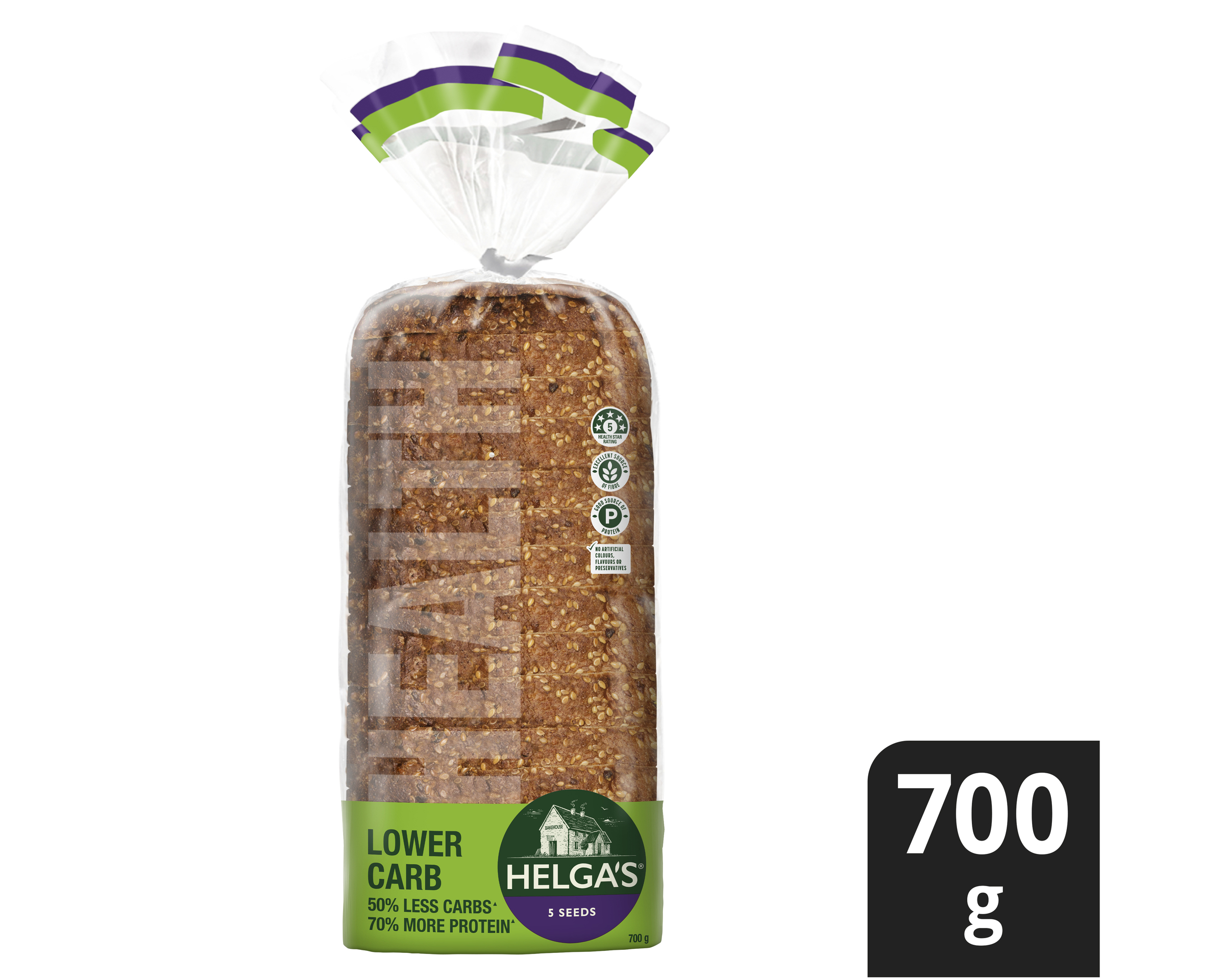 ^Helga’s Lower Carb 5 Seeds has 50% less carbohydrate (21. 2g/100g) and 70% more protein (14.