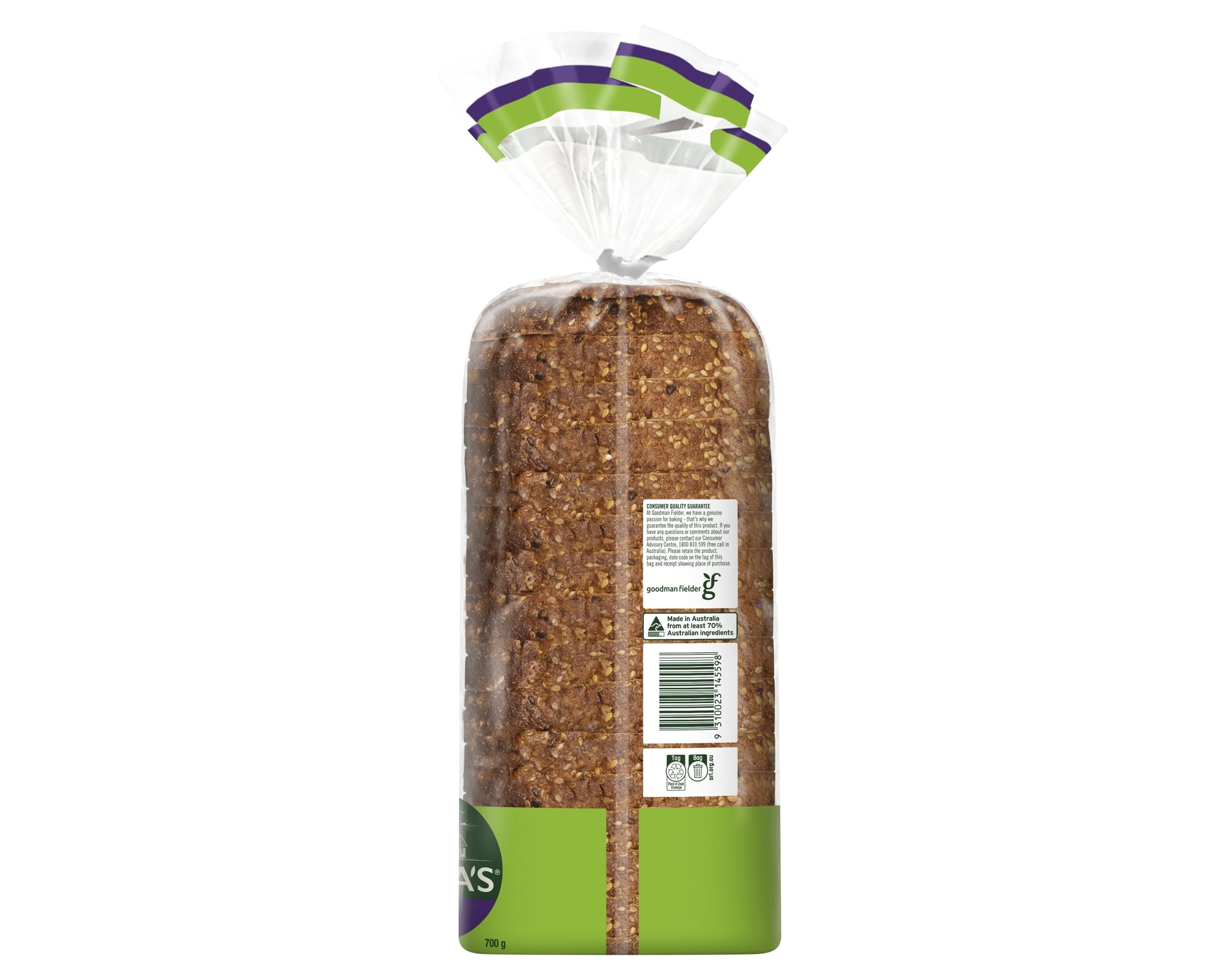 Water, Wheat Flour, Mixed Seeds (18%) (Sunflower Seeds, Brown Linseeds, Poppy Seeds, Psyllium Seeds, Golden Linseeds), Modified Wheat Starch (1413), Wheat Gluten, Defatted Soy Flour, Yeast, Bamboo Fibre, Soy Splits, Kibbled Soy, Vinegar, Canola Oil, Iodised Salt, Cultured Wheat Flour, Soy Flour, Vegetable Emulsifiers (471, 472e, 481), Vitamins (Thiamin, Folic Acid), Processing Aids (Wheat)