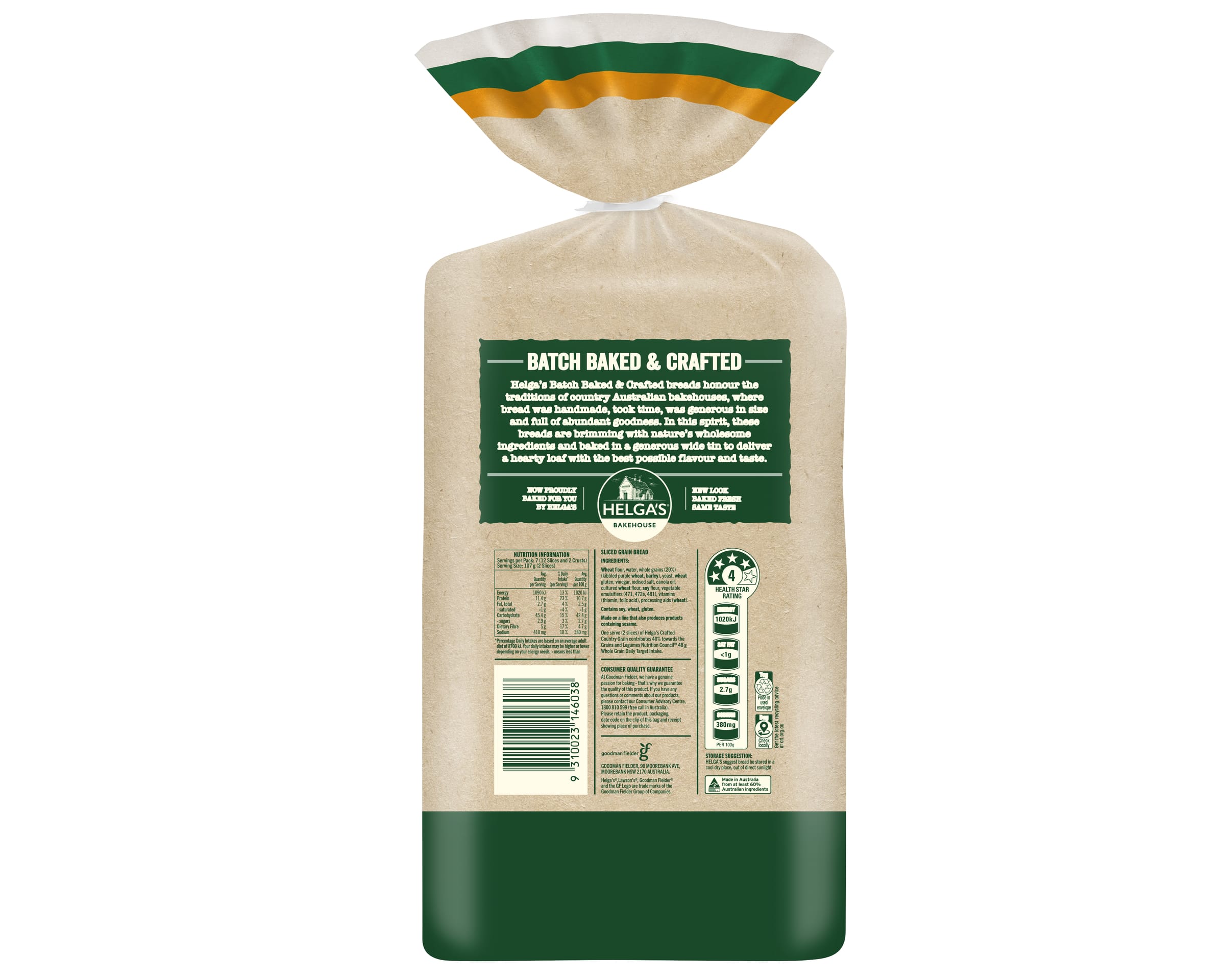 Helga’s Batch Baked & Crafted bread honour the traditions of country Australian bakehouses, where bread was handmade, took time, was generous in size and full of abundant goodness. In this spirit, these breads are brimming with nature’s wholesome ingredients and baked in a generous wide tin to deliver a hearty loaf with the best possible flavour and taste. .