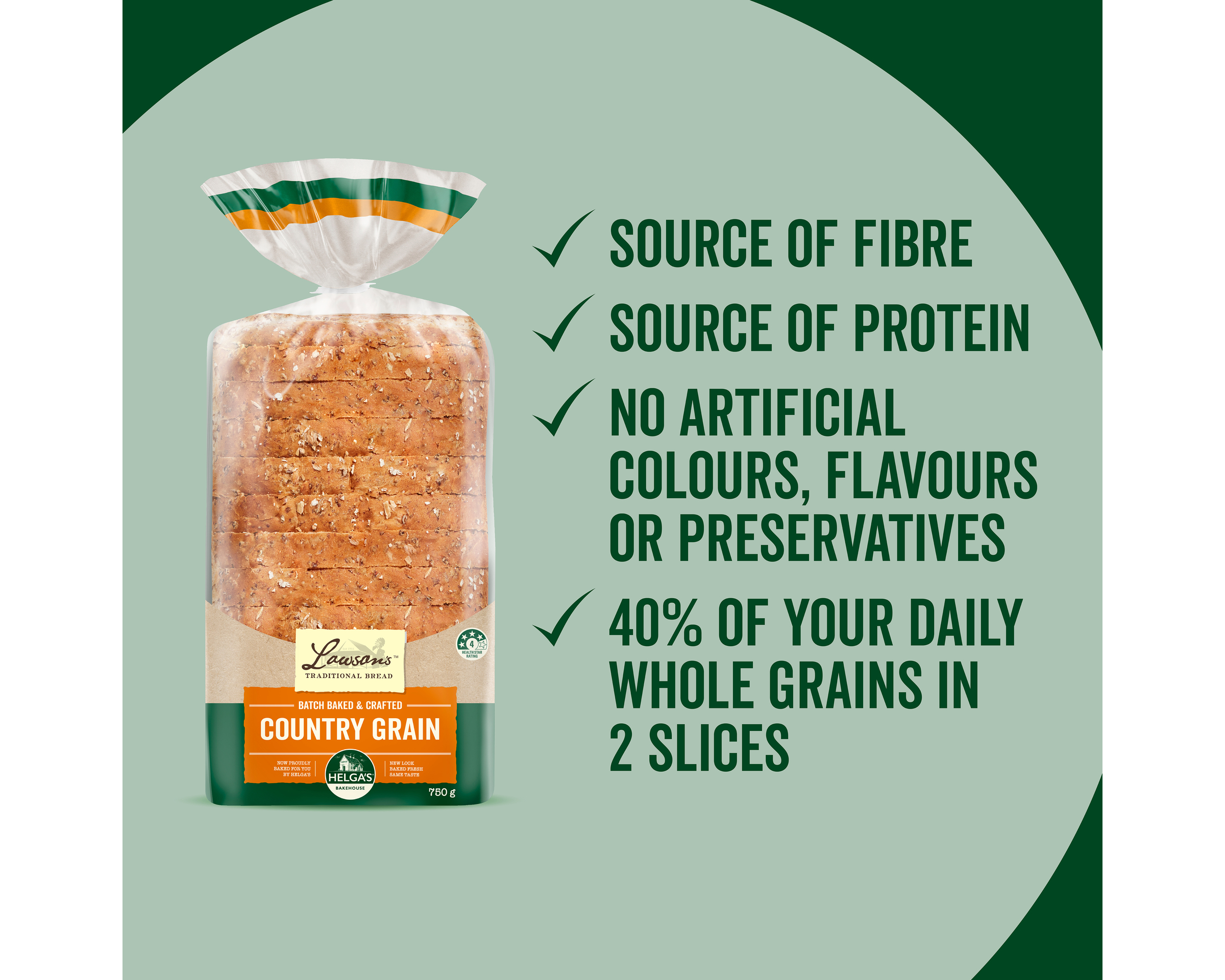 - One serve (2 slices) of Helga's Crafted Country Grain contributes 40% towards the Grains and Legumes Nutrition Council 48g Whole Grain Daily Target Intake.