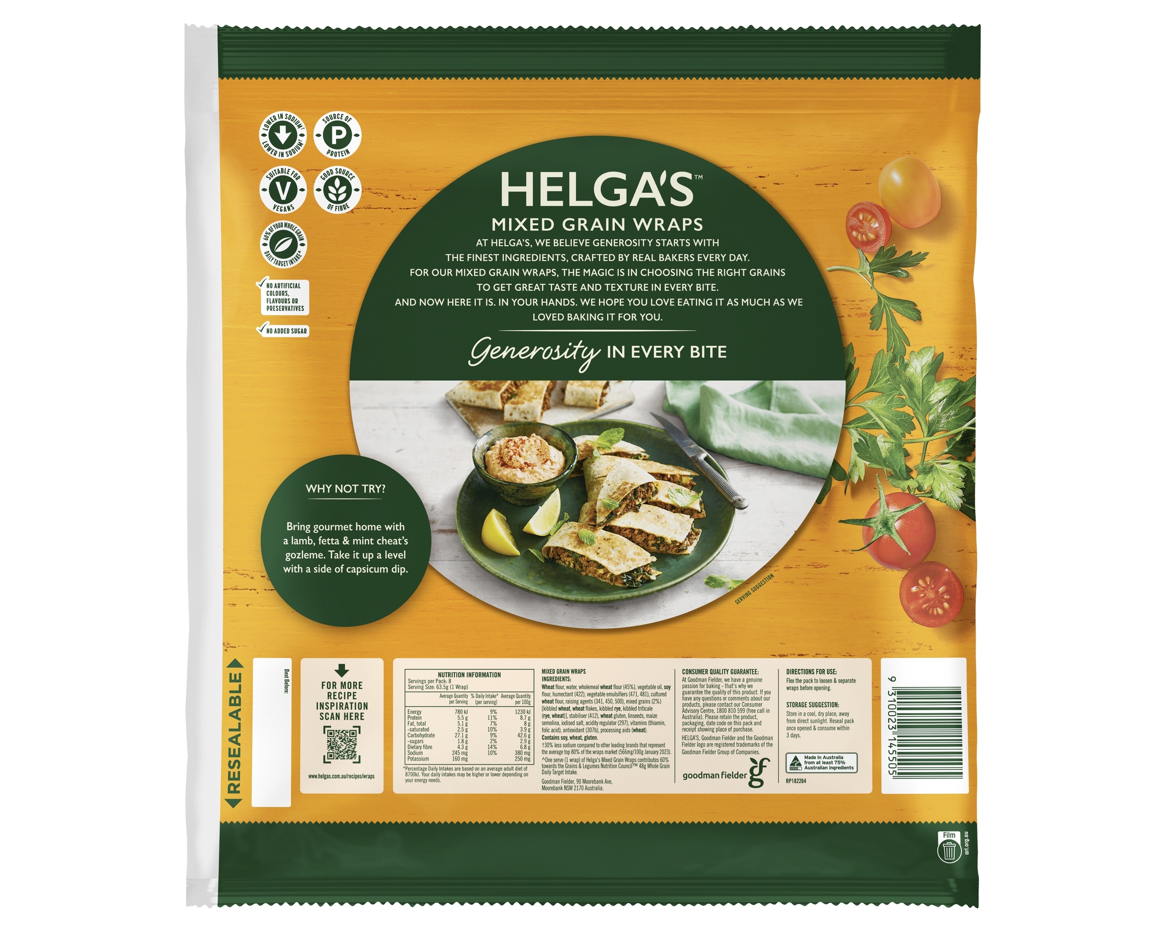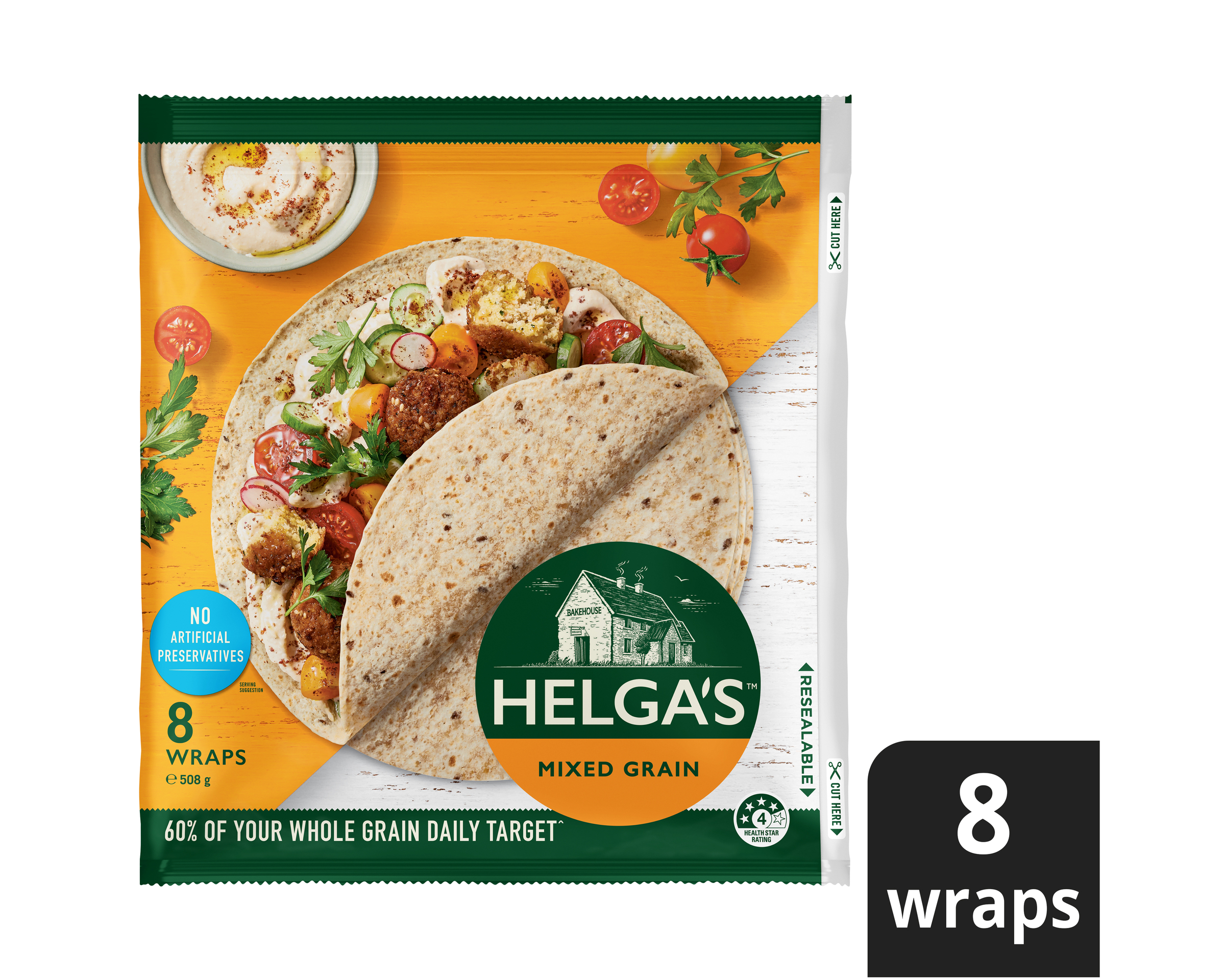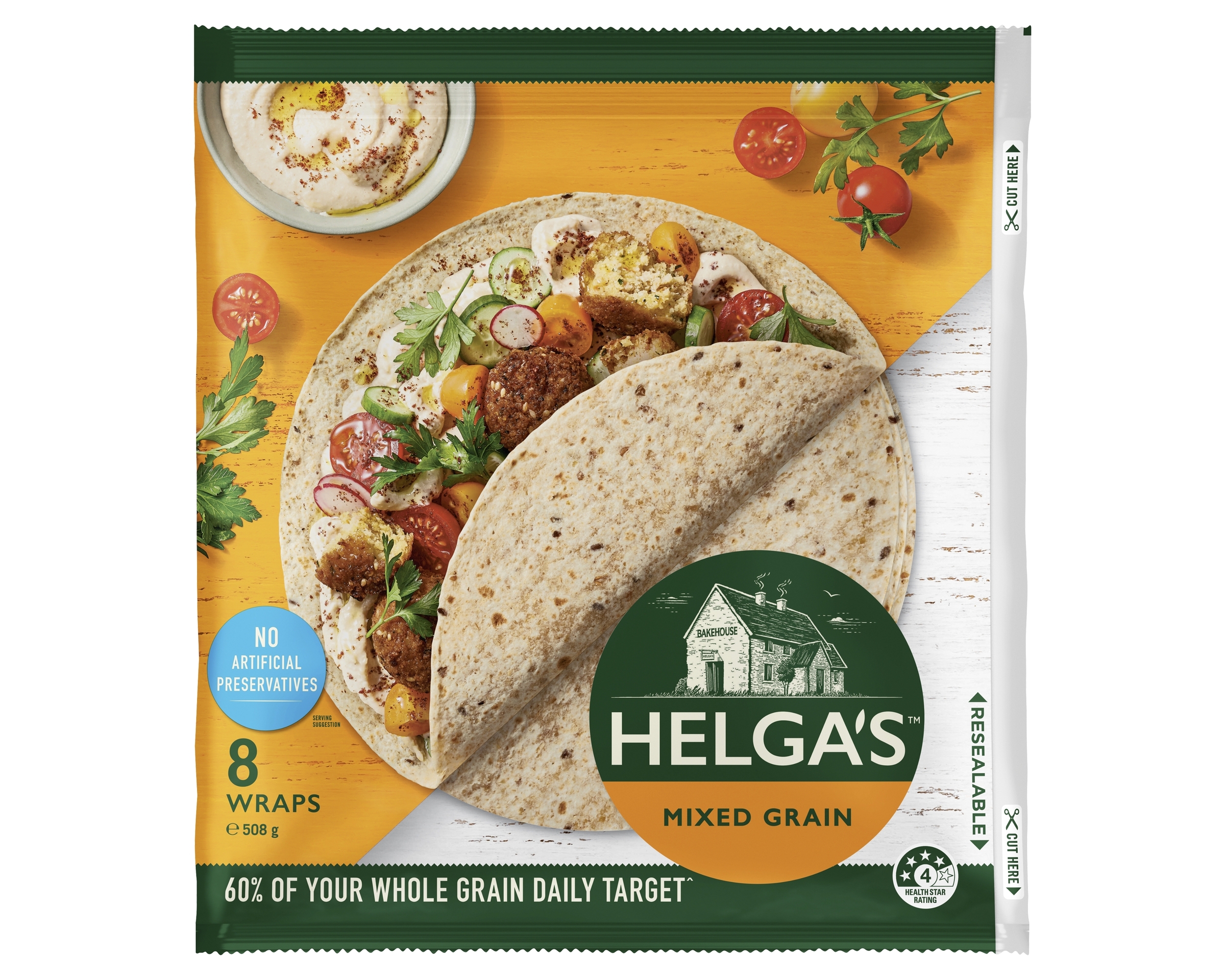 ^One serve (1 wrap) of Helga’s Mixed Grain Wraps contributes 60% towards the Grains & Legumes Nutrition Councilâ„¢ 48g Whole Grain Daily Target Intake.