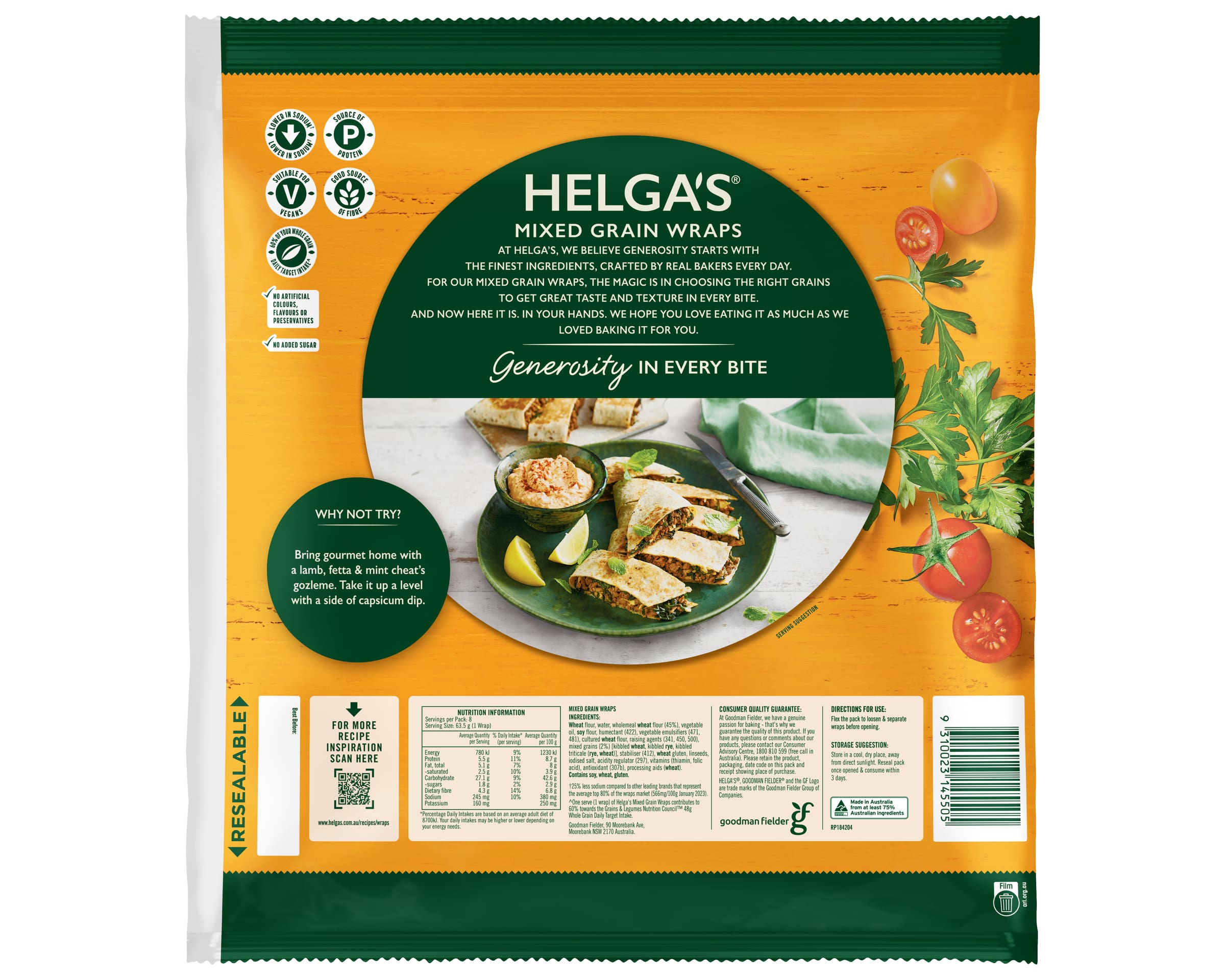 ^One serve (1 wrap) of Helga’s Mixed Grain Wraps contributes 60% towards the Grains & Legumes Nutrition Council™ 48g Whole Grain Daily Target Intake.