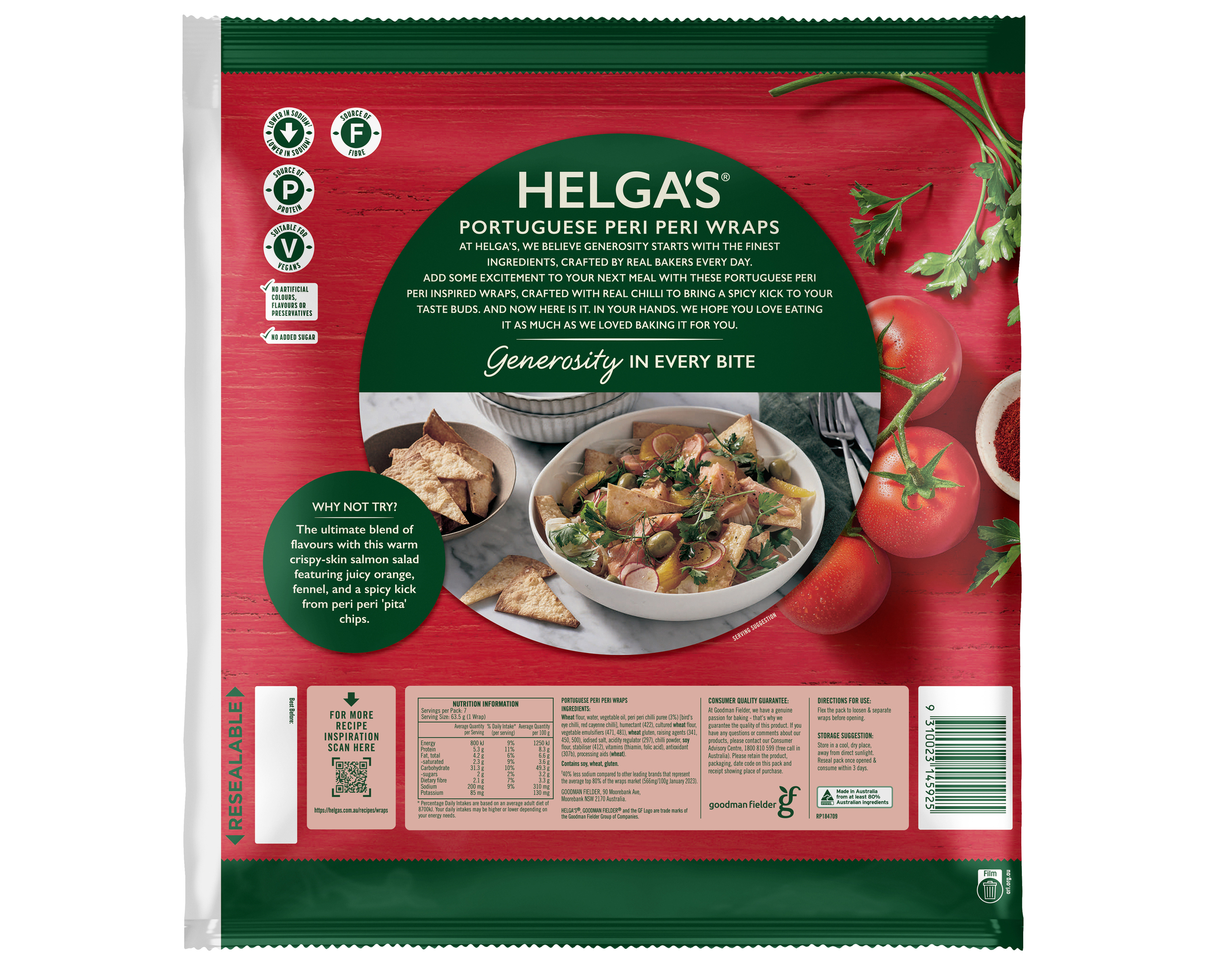Wheat Flour, Water, Vegetable Oil, Peri Peri Chilli Puree (2.5%) (Bird’s Eye Chilli, Red Cayenne Chilli), Humectant (422), Cultured Wheat Flour, Vegetable Emulsifiers (471, 481), Wheat Gluten, Raising Agents (341, 450, 500), Iodised Salt, Acidity Regulator (297), Chilli Powder, Soy Flour, Stabiliser (412), Vitamins (Thiamin, Folic Acid), Antioxidant (307b), Processing Aids (Wheat)