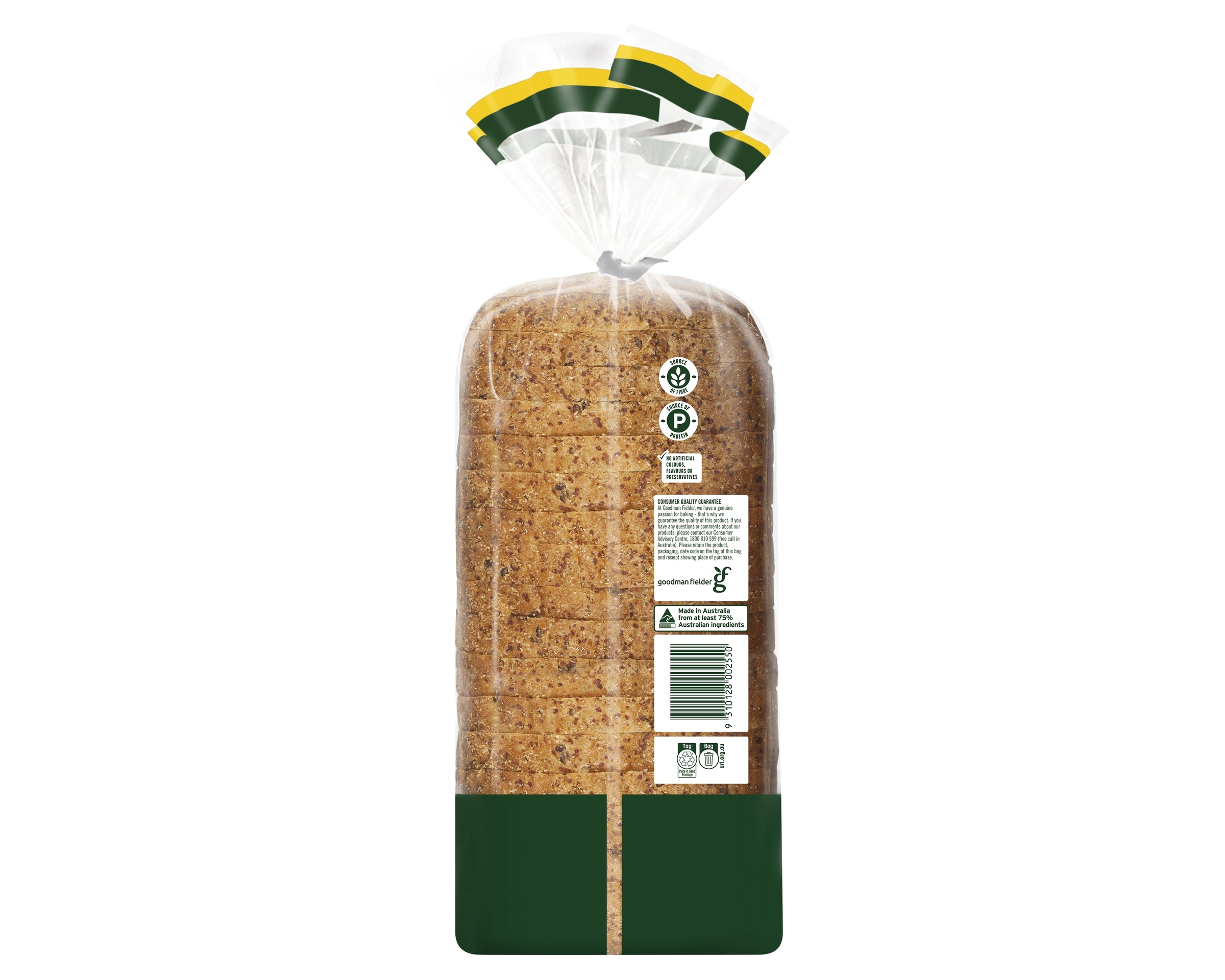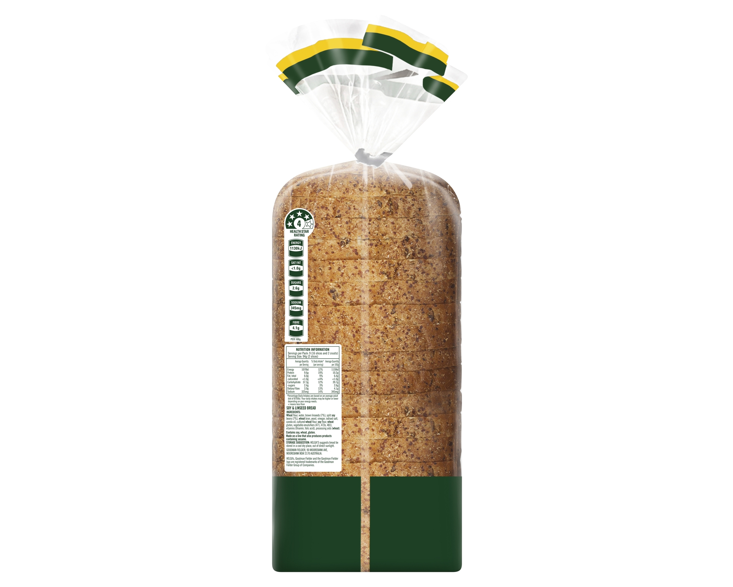 Wheat Flour, Water, Brown Linseeds (7%), Split Soy Beans (7%), Wheat Bran, Yeast, Vinegar, Iodised Salt, Canola Oil, Cultured Wheat Flour, Soy Flour, Wheat Gluten, Vegetable Emulsifiers (471, 472e, 481), Vitamins (Thiamin, Folic Acid), Processing Aids (Wheat)