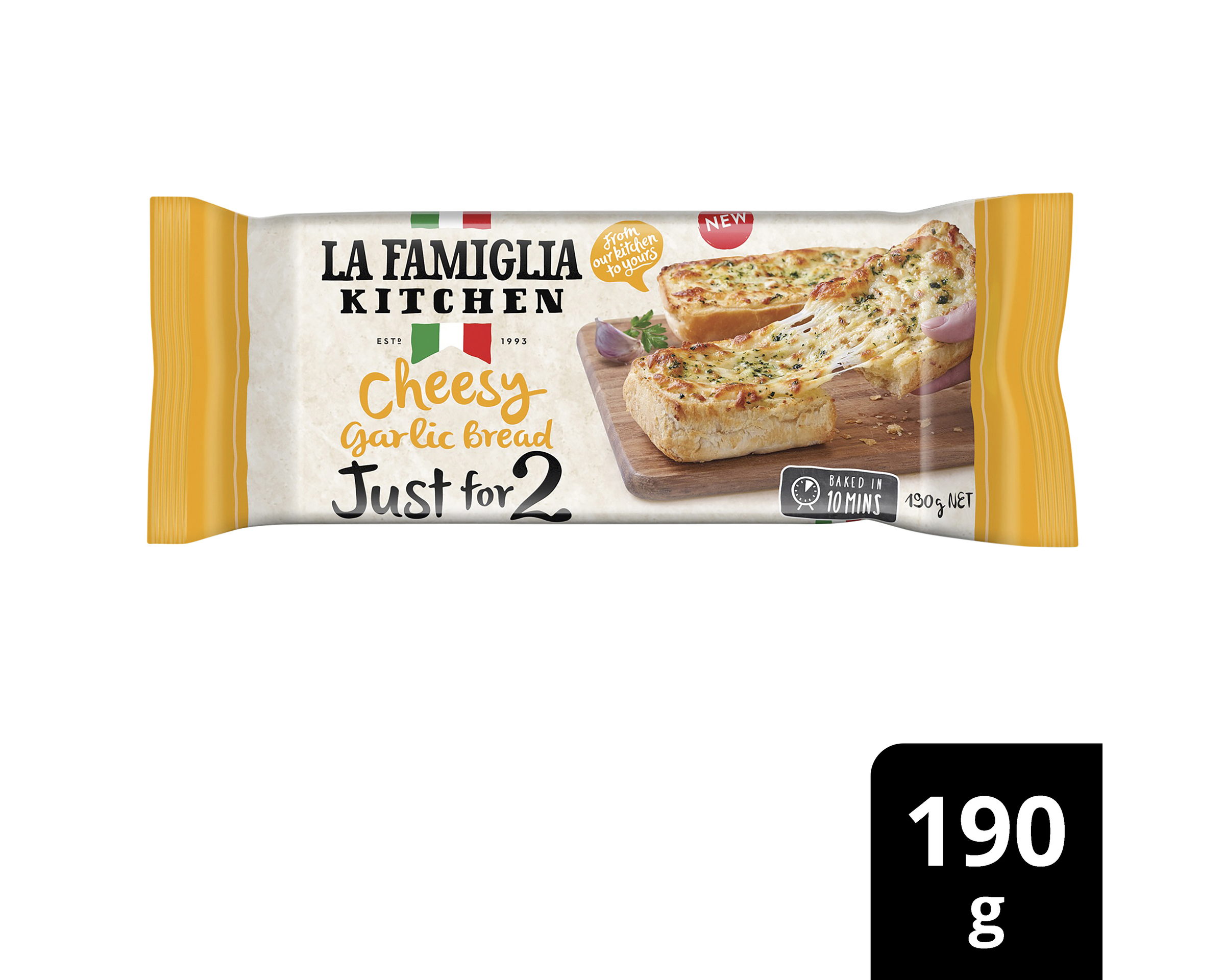 La Famiglia Kitchen Cheesy Garlic Bread contains fresh garlic, fresh parsley and mozzarella cheese. Baked in 10 mins. Just for 2. From our kitchen to yours.