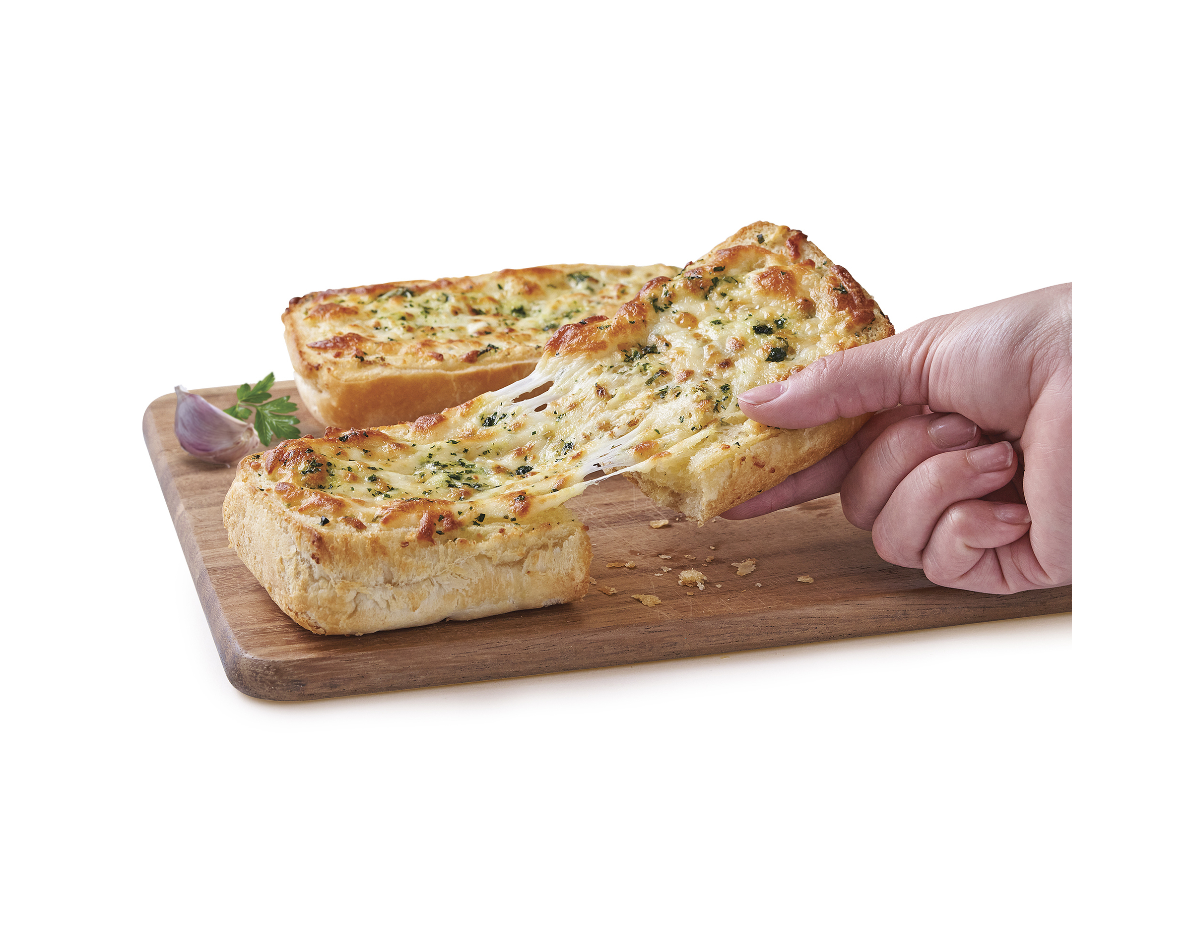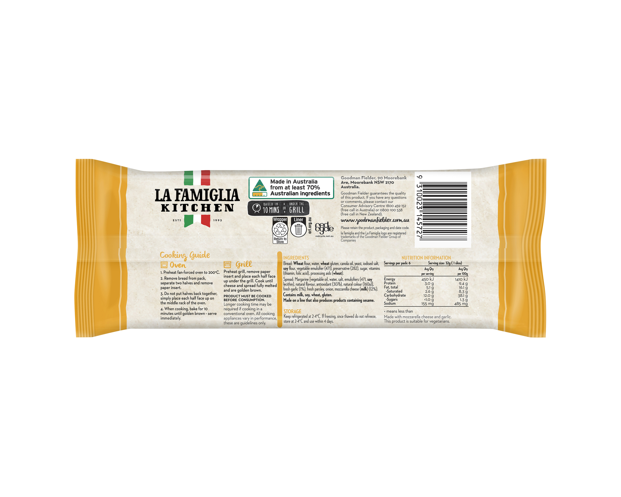 Bread (Wheat flour, water, wheat gluten, canola oil, yeast, iodised salt, soy flour, vegetable emulsifier (471), preservative (282), sugar, vitamins (thiamin, folic acid), processing aids (wheat)). Spread (Margarine (vegetable oil, water, salt, emulsifiers (471, soy lecithin), natural flavor, antioxidant (307b), natural color (160a)), fresh garlic (1%), fresh parsley, onion, mozzarella cheese (milk) (12%)).