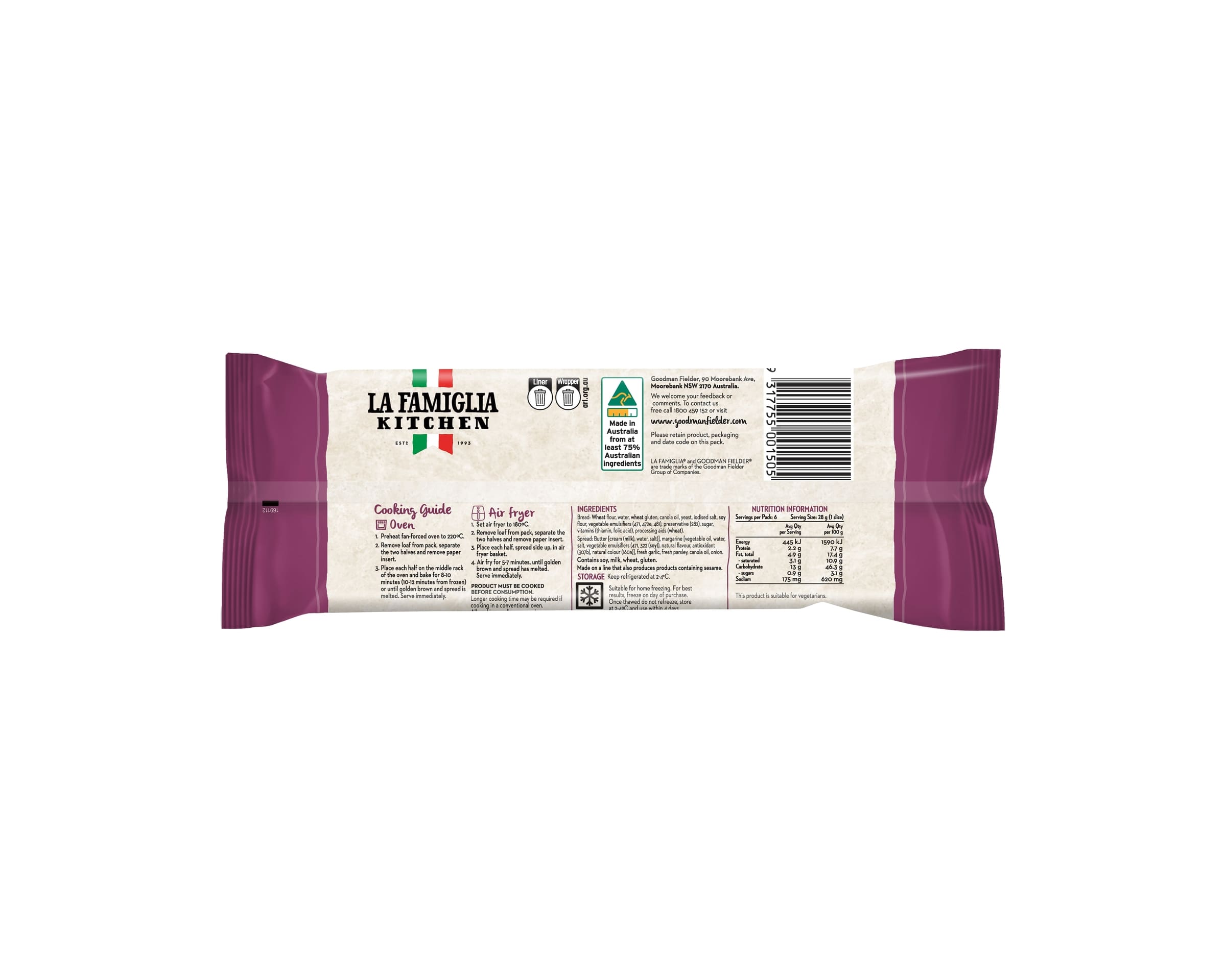 Bread: Wheat Flour, Water, Wheat Gluten, Canola Oil, Yeast, Iodised Salt, Soy Flour, Vegetable Emulsifiers (471, 472E, 481), Preservative (282), Sugar, Vitamins (Thiamin, Folic Acid), Processing Aids (Wheat), Spread: Butter [Cream (Milk), Water, Salt)], Margarine [Vegetable Oil, Water, Salt, Vegetable Emulsifiers (471, 322 (Soy)), Natural Flavour, Antioxidant (307b), Natural Colour (160a)], Fresh Garlic, Fresh Parsley, Canola Oil, Onion