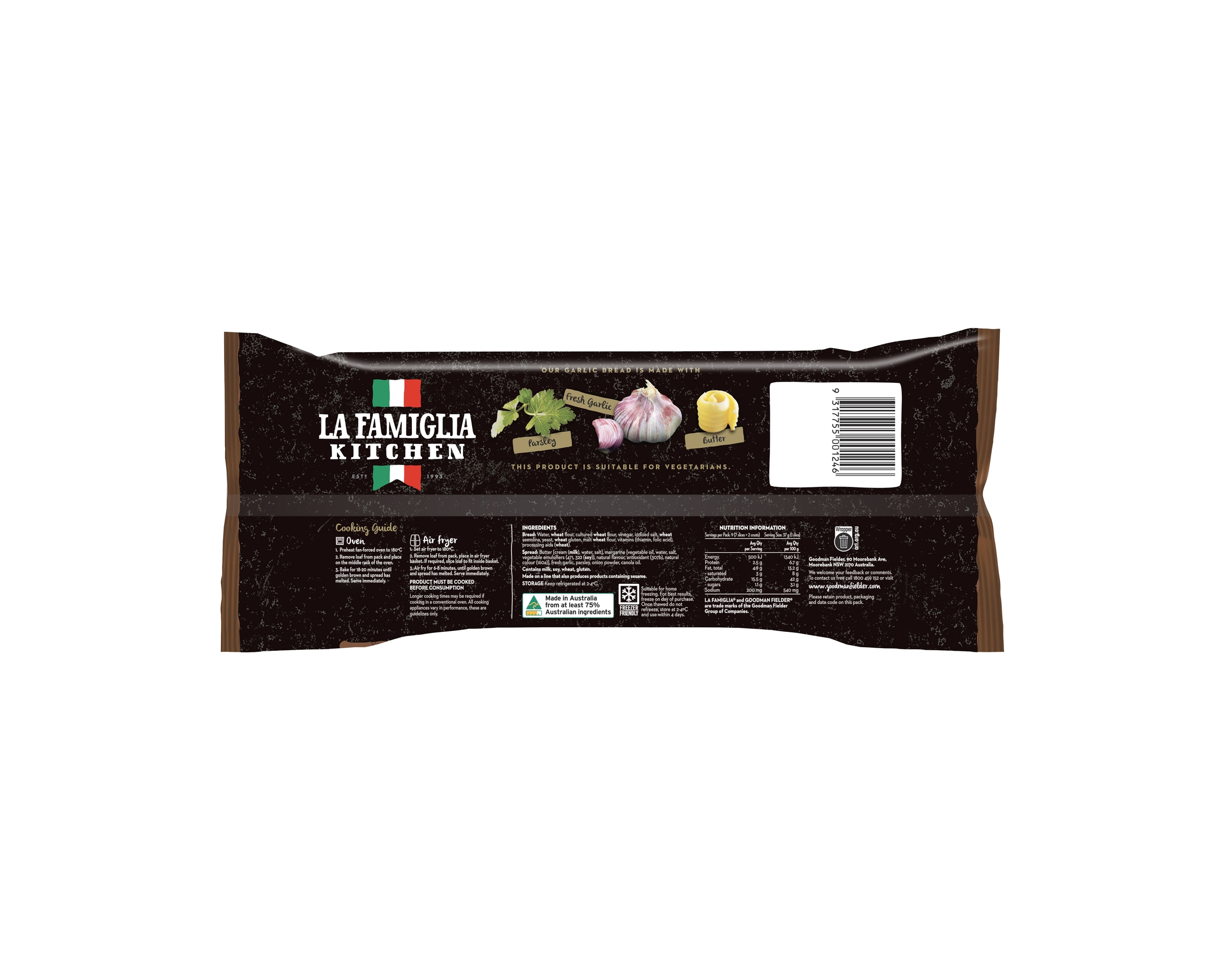 Bread: Water, Wheat Flour, Cultured Wheat Flour, Vinegar, Iodised Salt, Wheat Semolina, Yeast, Wheat Gluten, Malt Wheat Flour, Vitamins (Thiamin, Folic Acid), Processing Aids (Wheat), Spread: Butter [Cream (Milk), Water, Salt], Margarine [Vegetable Oil, Water, Salt, Vegetable Emulsifiers (471, 322 (Soy)), Natural Flavour, Antioxidant (307b), Natural Colour (160a)], Fresh Garlic, Parsley, Onion Powder, Canola Oil