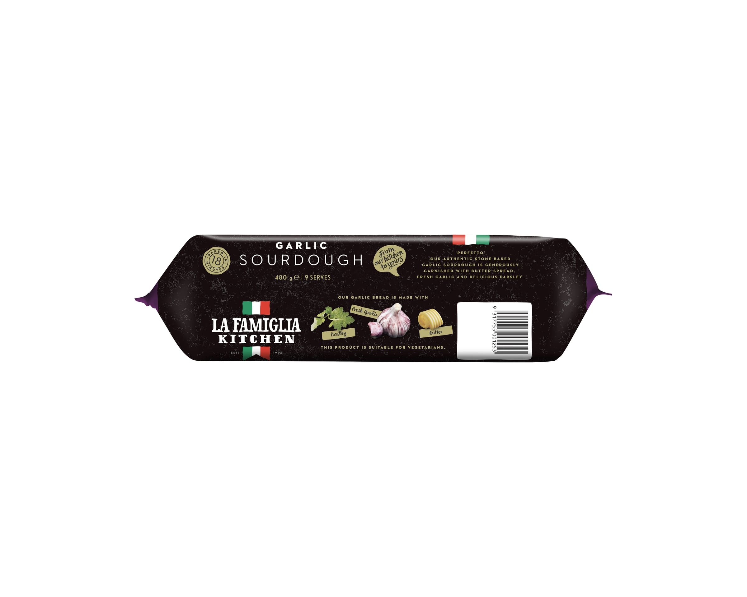 Bread: Water, Wheat Flour, Cultured Wheat Flour, Iodised Salt, Vinegar, Yeast, Sourdough (2%) (Fermented Wheat Flour), Wheat Semolina, Wheat Gluten, Malt Wheat Flour, Vitamins (Thiamin, Folic Acid), Processing Aids (Wheat), Spread: Butter [Cream (Milk), Water, Salt], Margarine [Vegetable Oil, Water, Salt, Vegetable Emulsifiers (471, 322 (Soy)), Natural Flavour, Antioxidant (307b), Natural Colour (160a)], Fresh Garlic, Parsley, Onion Powder, Canola Oil
