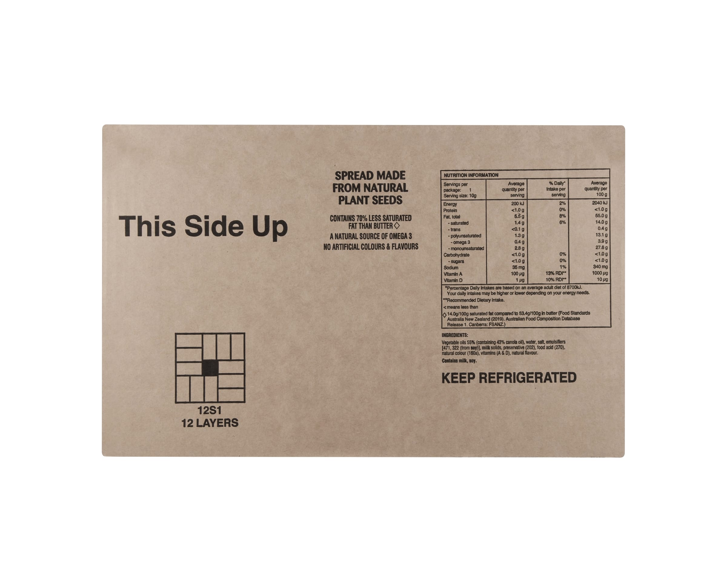 Vegetable Oils 55% (containing 43% Canola Oil), Water, Salt, Emulsifiers (471, 322 (from Soy)), Milk Solids, Preservative (202), Food Acid (270), Natural Colour (160a), Vitamins (A & D), Natural Flavour