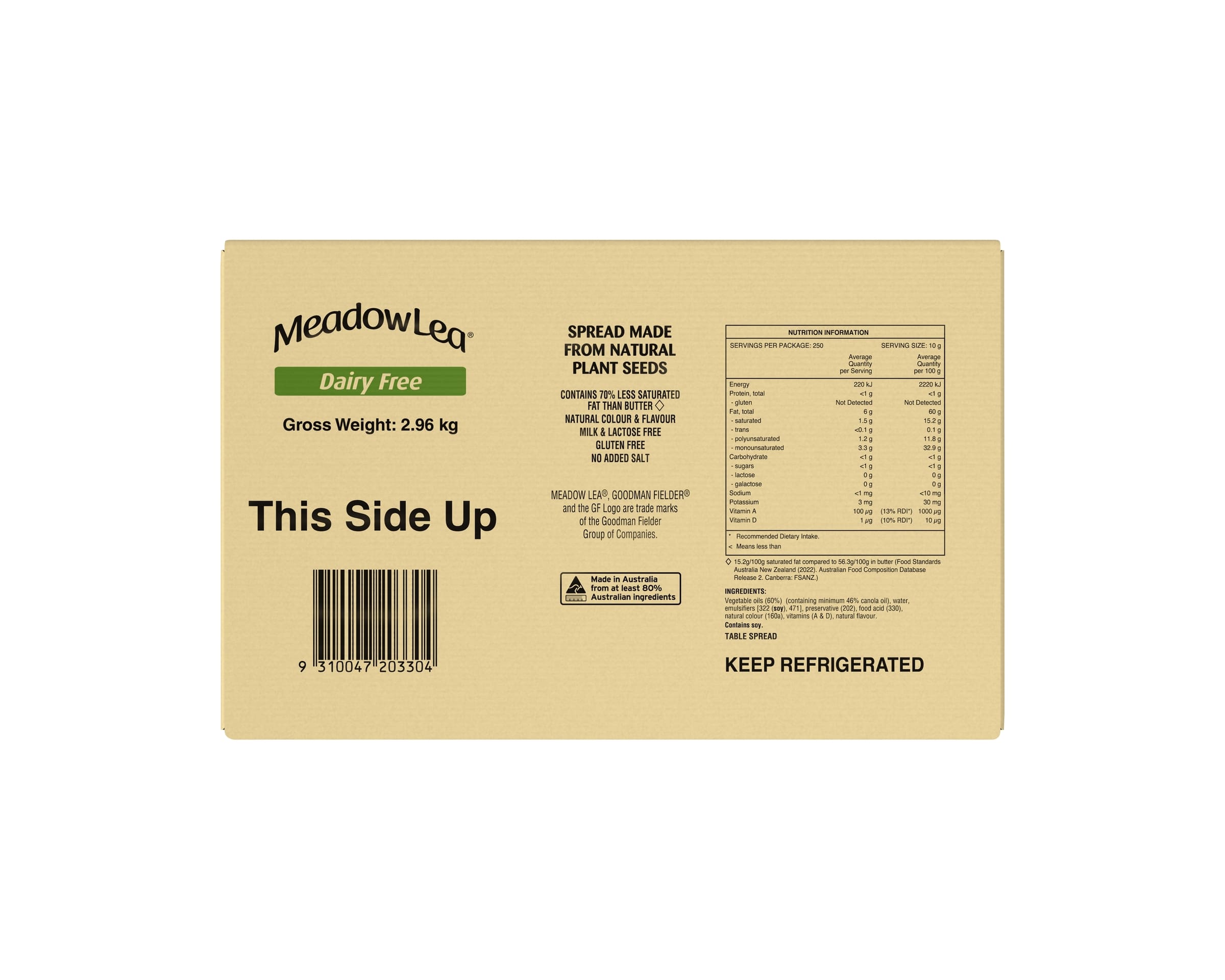 Vegetable Oils (60%) (containing minimum 46% Canola Oil), Water, Emulsifiers (322 (Soy), 471), Preservative (202), Food Acid (330), Natural Colour (160a), Vitamins (A & D), Natural Flavour