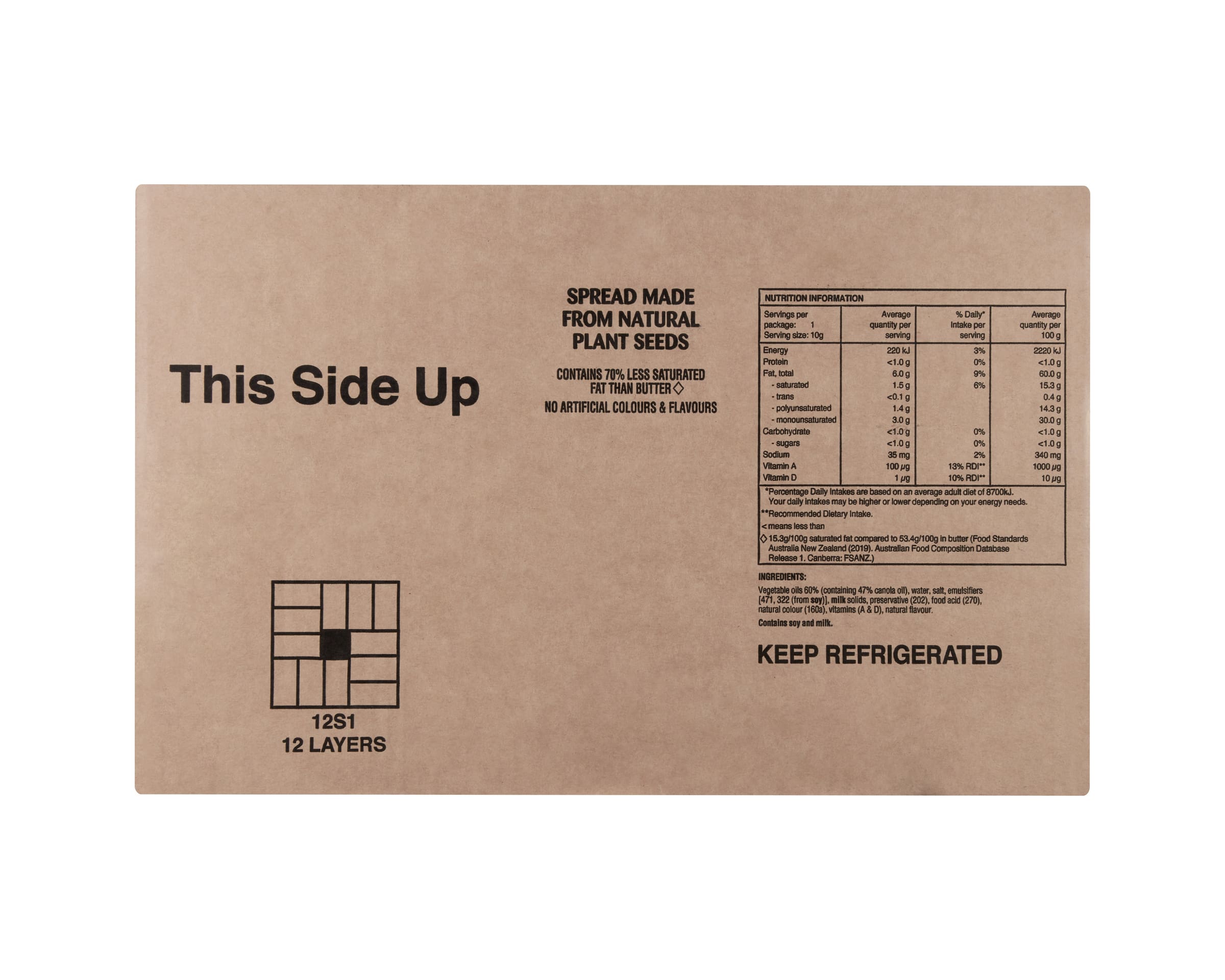Vegetable Oils 60% (containing 47% Canola Oil), Water, Salt, Emulsifiers [471, 322 (from Soy)], Milk Solids, Preservative (202), Food Acid (270), Natural Colour (160a), Vitamins (A & D), Natural Flavour