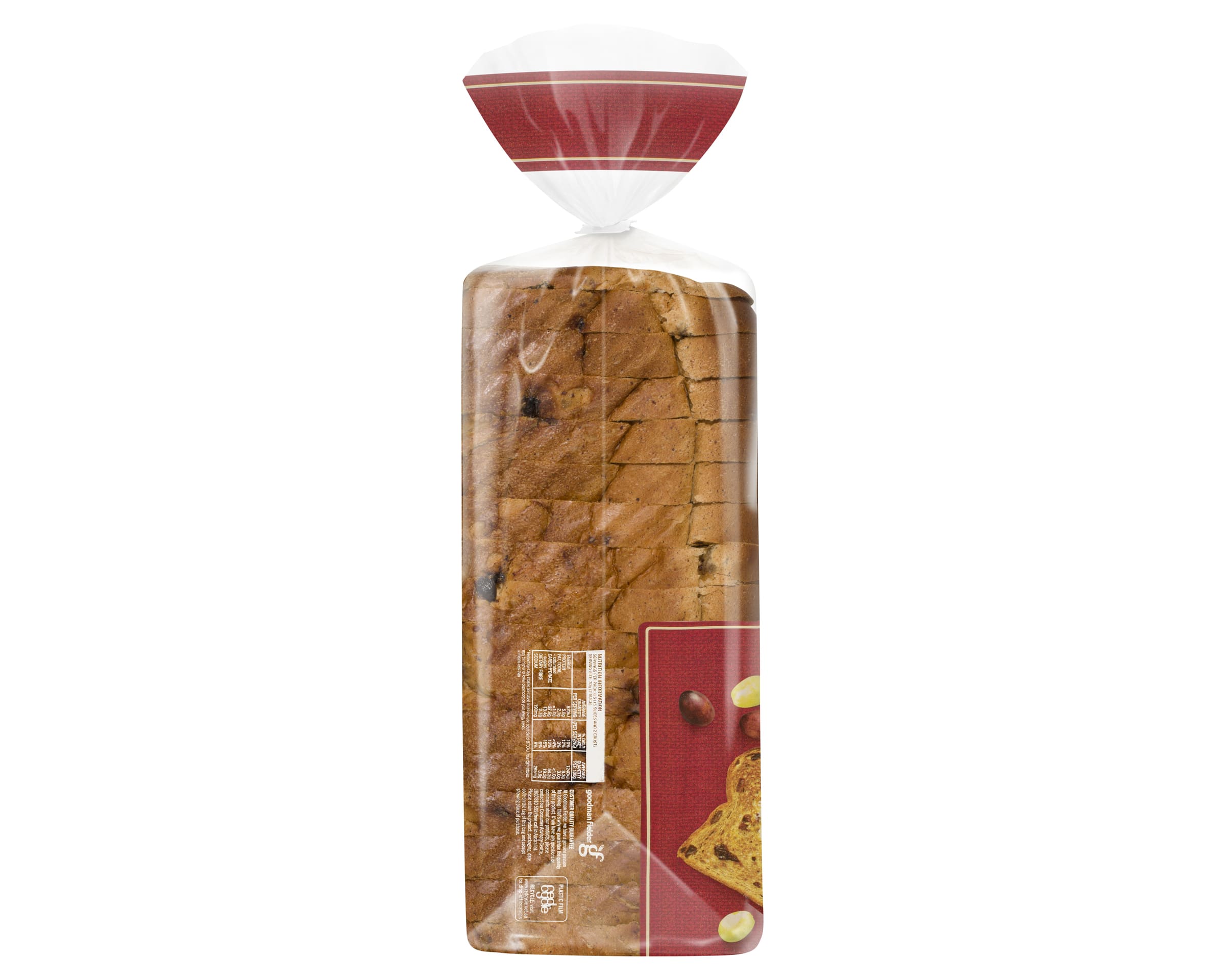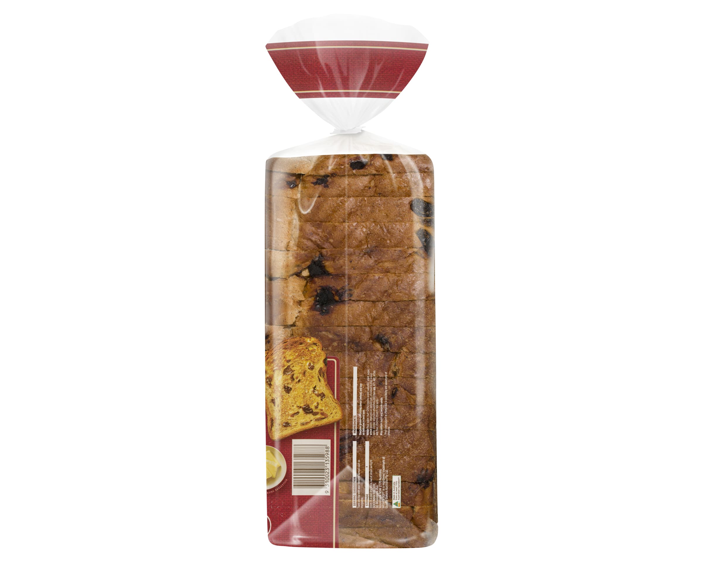 Wheat Flour, Water, Fruit^(25%) (Raisins and/or Sultanas), Yeast, Sugar, Wheat Gluten, Vegetable Oil, Iodised Salt, Cinnamon (0.5%), Mixed Spice, Vinegar, Vegetable Emulsifiers (322 from Soy, 471, 481, 472e), Soy Flour, Vitamins (Thiamin, Folic Acid).