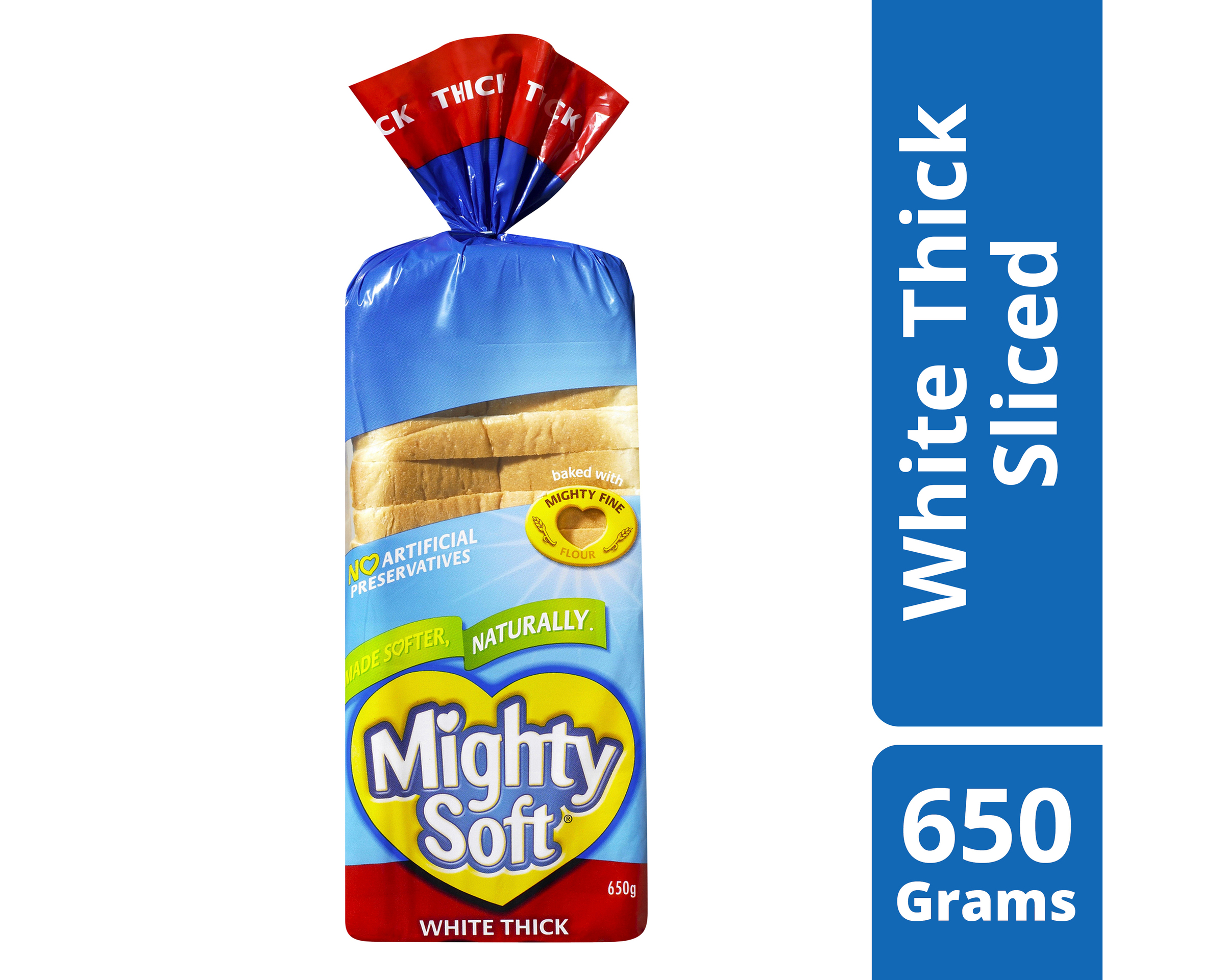 Made softer, naturally. Mighty Soft Thick Sliced White Bread takes your breakfast to the next level with it’s soft texture and extra thick slices. This sliced bread contains no artificial preservatives. Baked with mighty fine flour, this white bread is made naturally and contains no artificial preservatives.