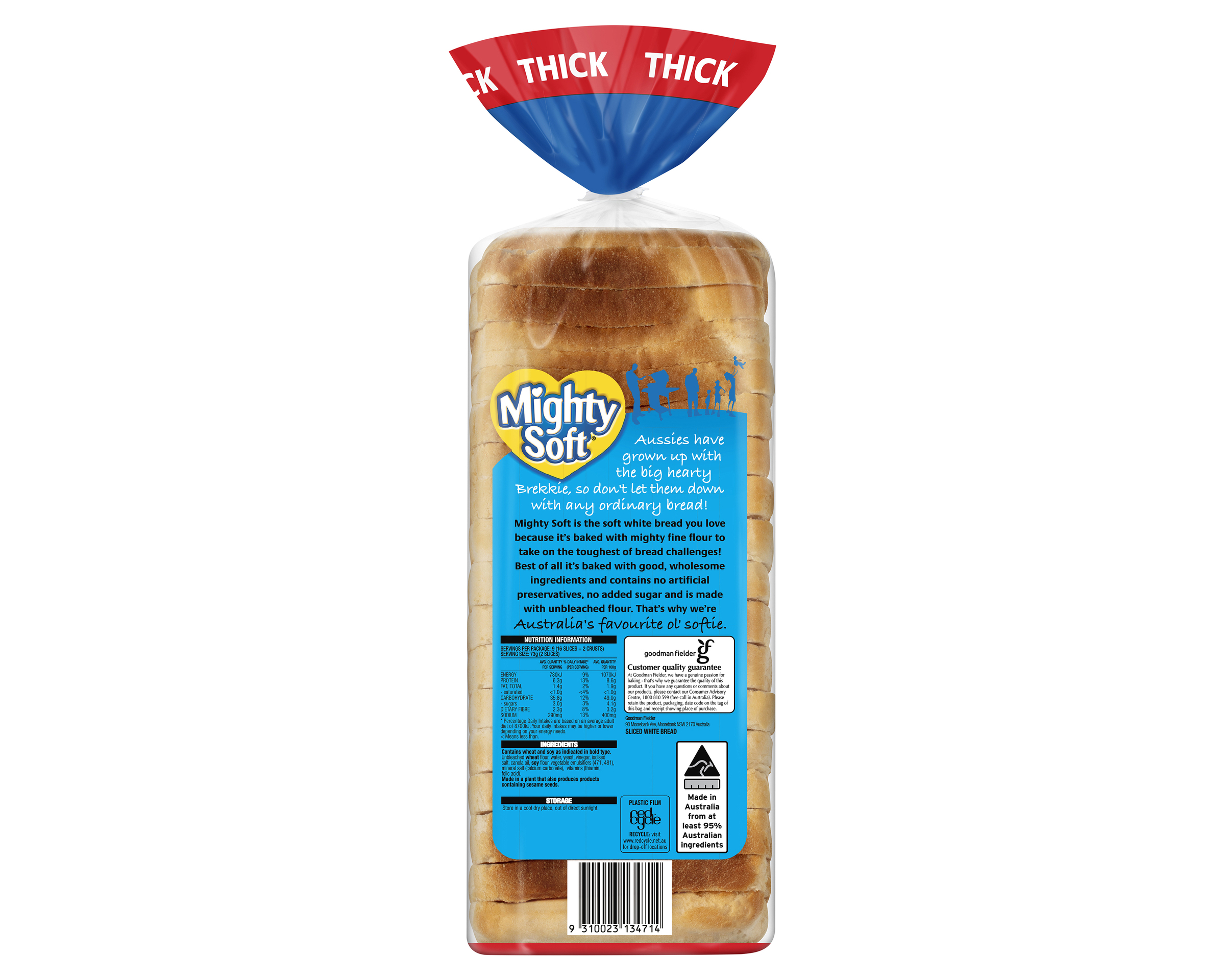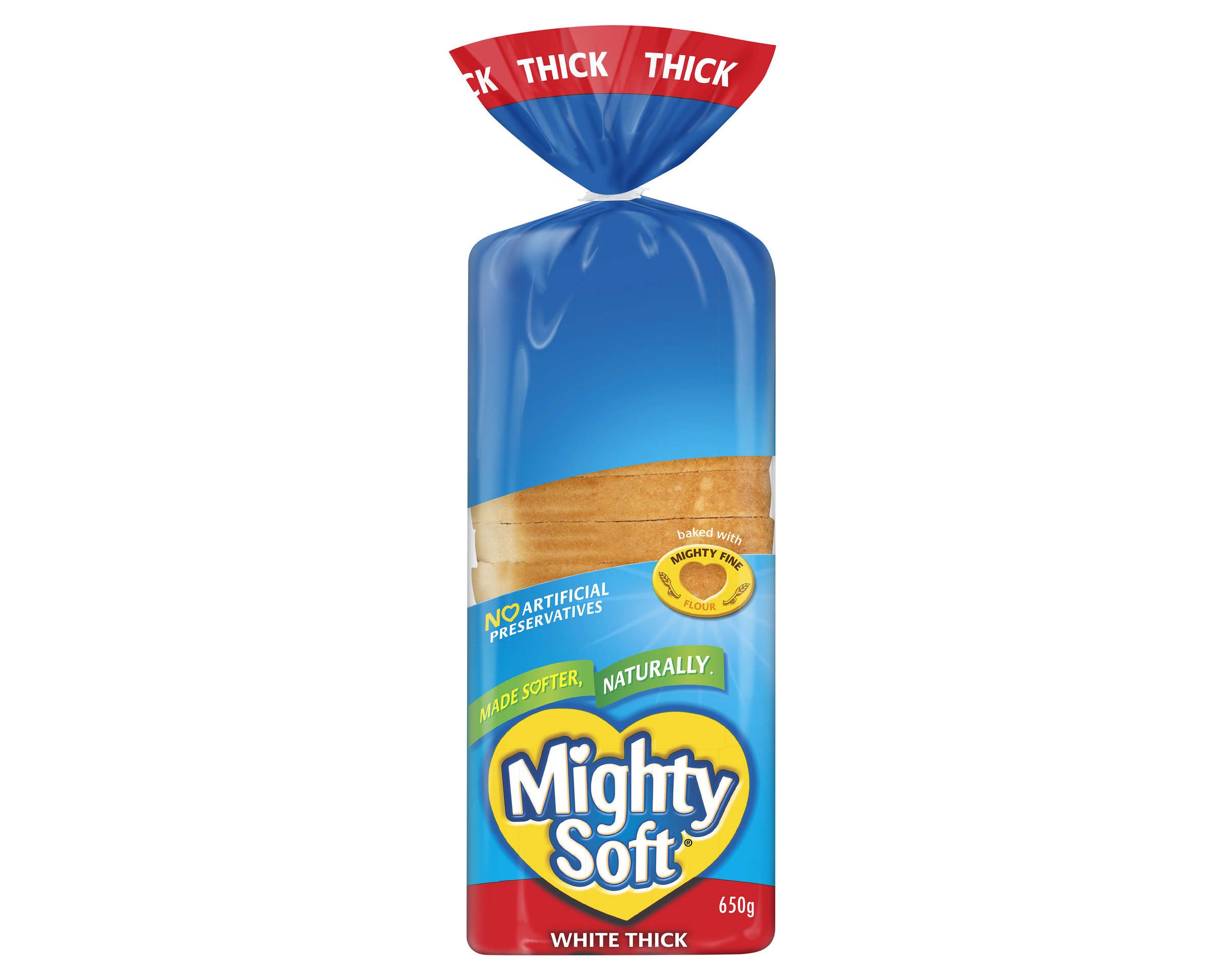 Made softer, naturally. Mighty Soft Thick Sliced White Bread takes your breakfast to the next level with it’s soft texture and extra thick slices. This sliced bread contains no artificial preservatives. Baked with mighty fine flour, this white bread is made naturally and contains no artificial preservatives.