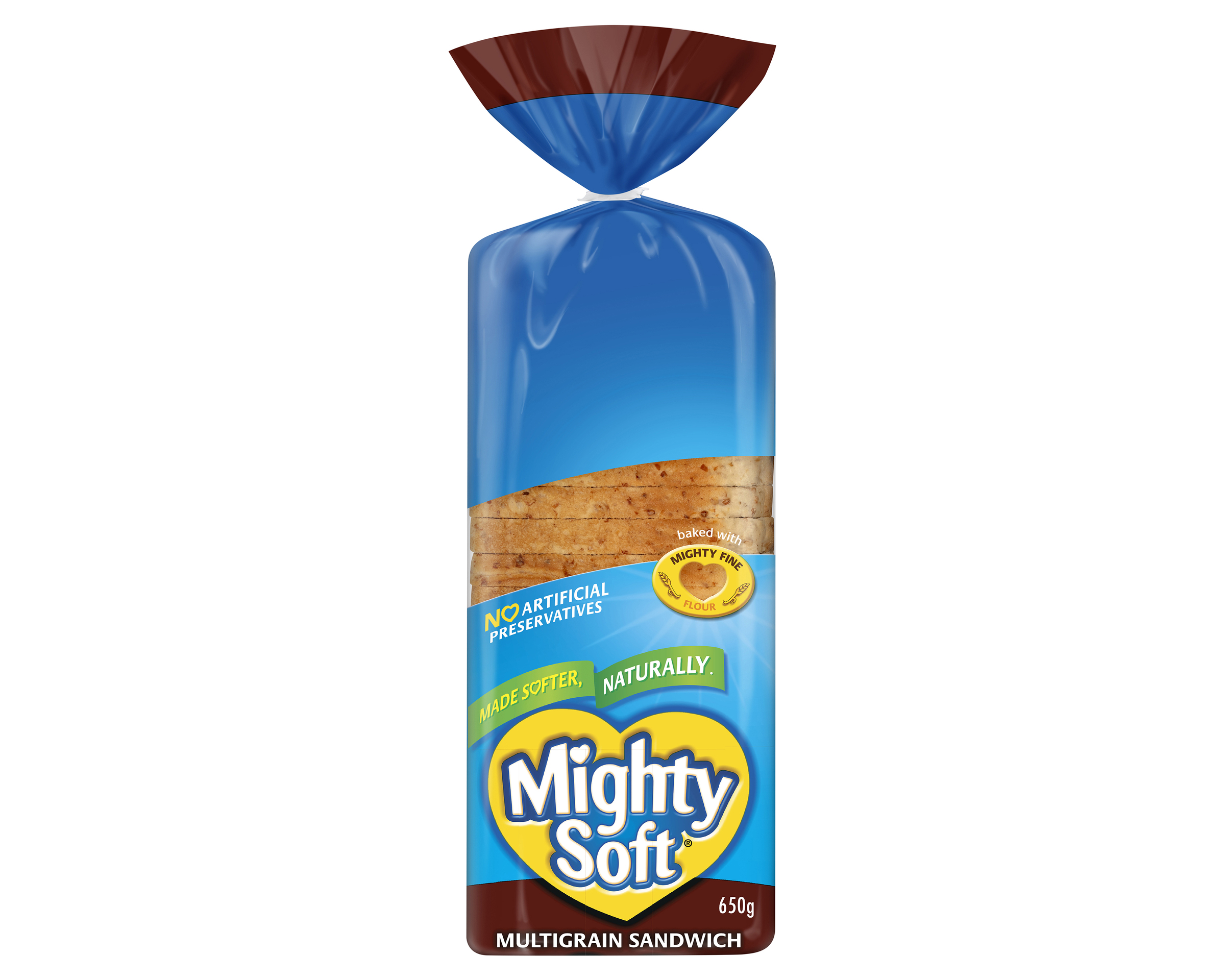 - • Multigrain sandwich loaf • Made with mighty fine flour • Contains no artificial preservatives • Made softer, naturally • Great for sandwiches and toasts