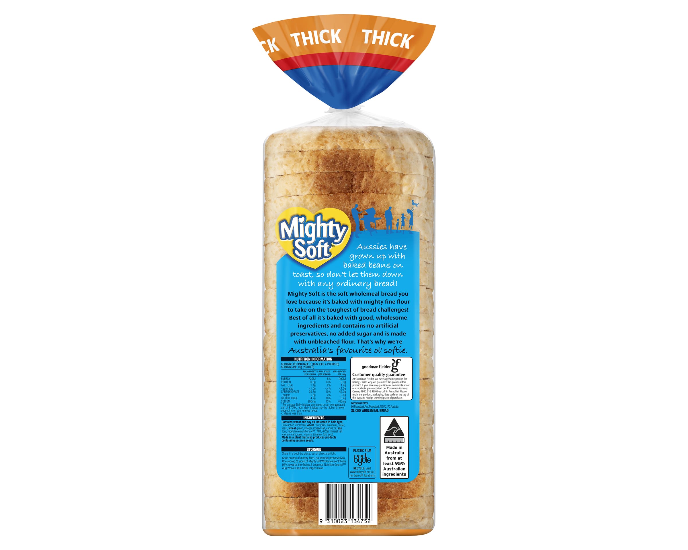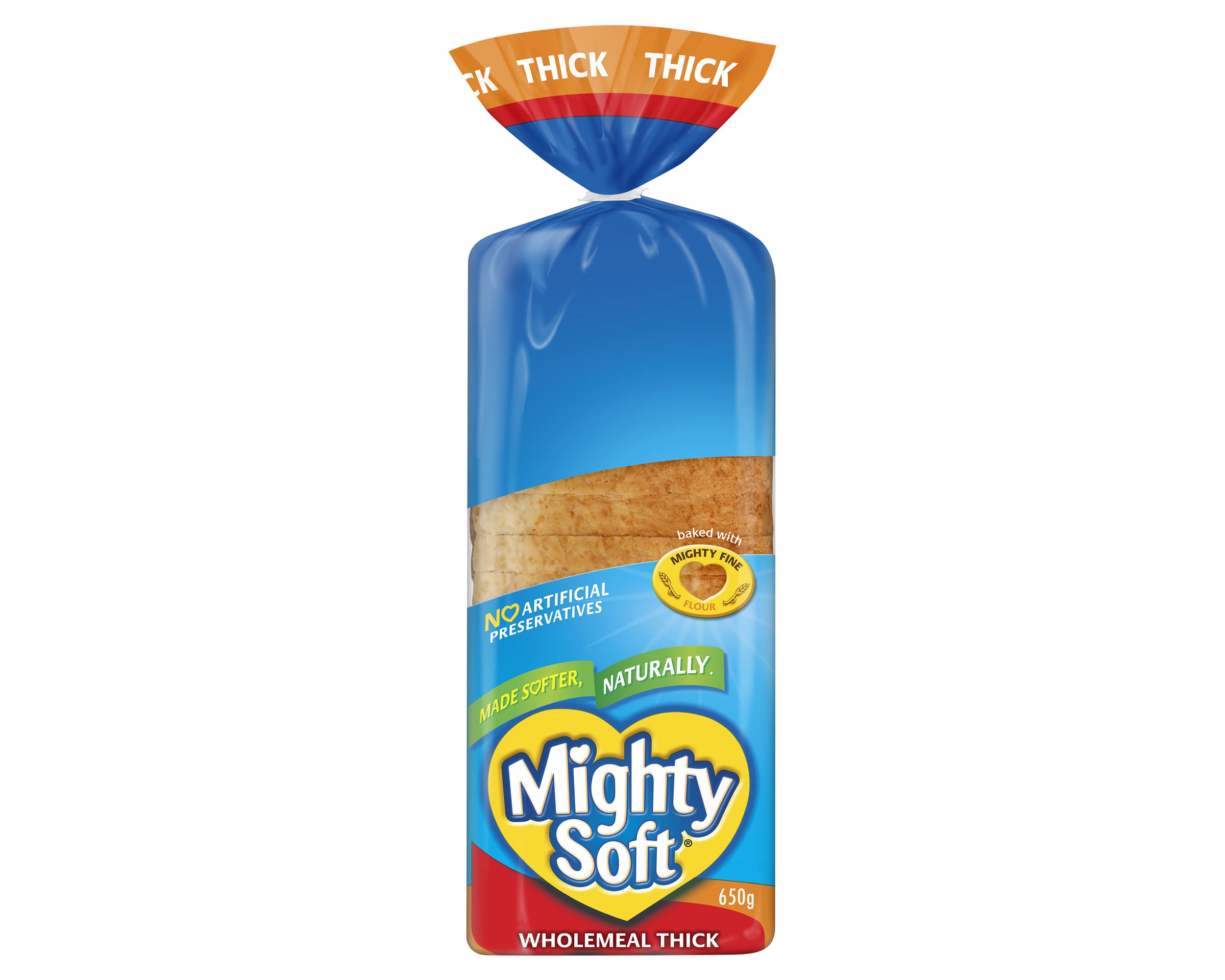 Made softer, naturally. Mighty Soft Thick Sliced Wholemeal Bread is baked with mighty fine flour so it is made softer, naturally. Great for sandwiches and breakfast toast. Made with no artificial preservatives, Mighty Soft Thick Sliced Wholemeal Bread is great for the whole family.