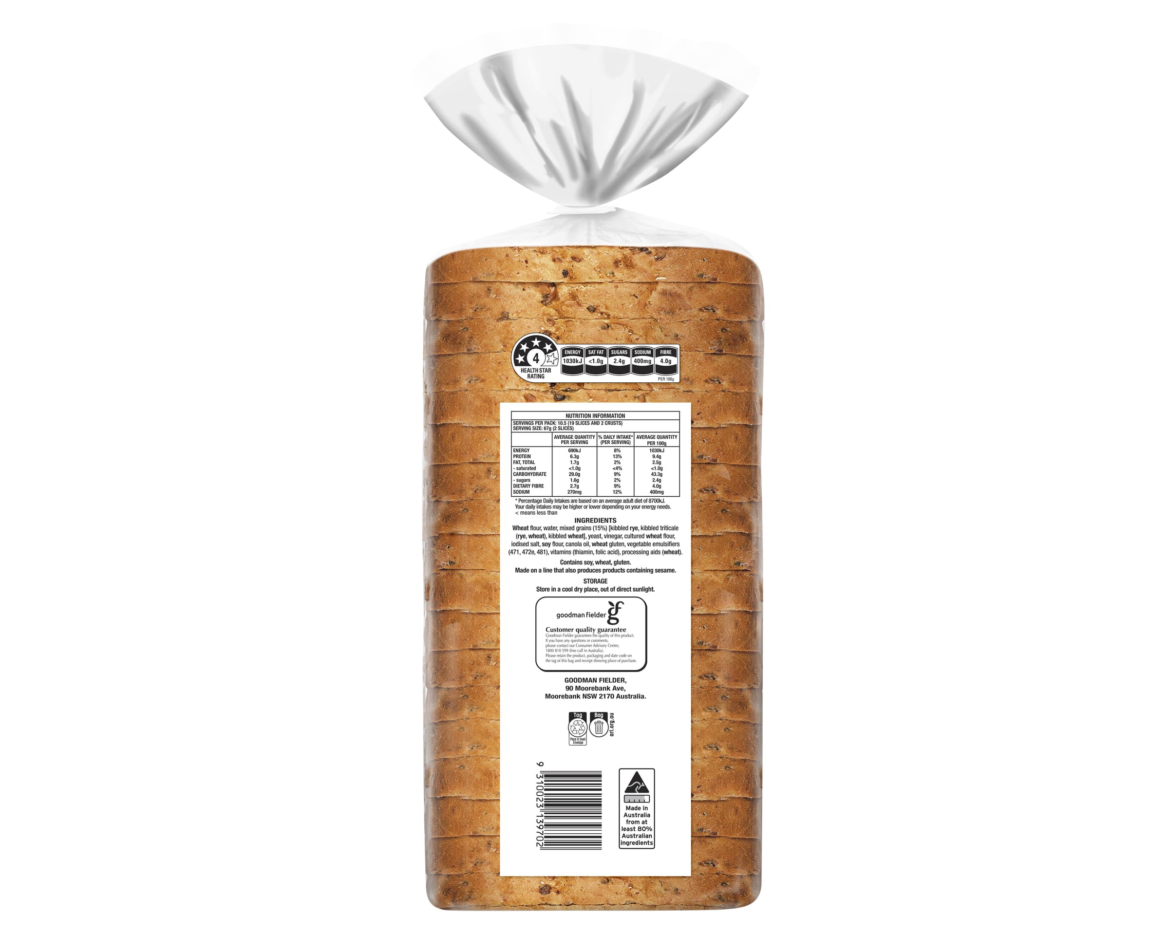 Wheat Flour, Water, Mixed Grains (15%) [Kibbled Rye, Kibbled Triticale (Rye, Wheat), Kibbled Wheat], Yeast, Vinegar, Cultured Wheat Flour, Iodised Salt, Soy Flour, Canola Oil, Wheat Gluten, Vegetable Emulsifiers (471, 472e, 481), Vitamins (Thiamin, Folic Acid), Processing Aids (Wheat)