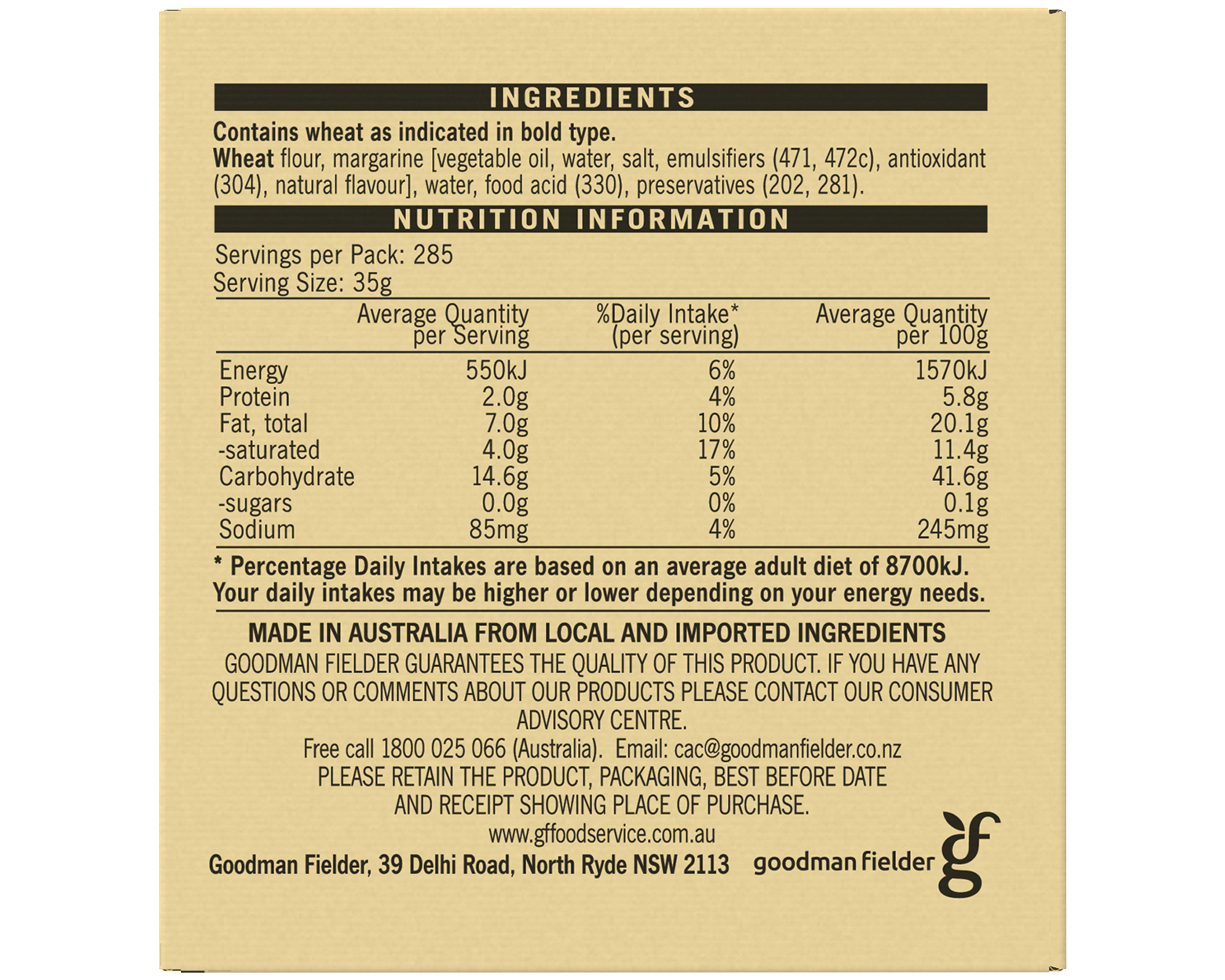 Wheat Flour, Margarine [Vegetable Oil, Water, Salt, Emulsifiers (471, 472c), Antioxidant (304), Natural Flavour], Water, Food Acid (330), Preservatives (202, 281)