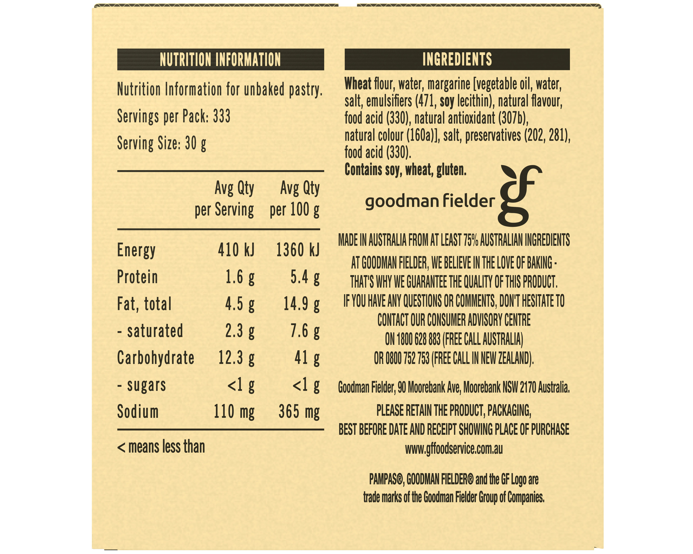 Wheat Flour, Water, Margarine [Vegetable Oil, Water, Salt, Emulsifiers (471, Soy Lecithin), Natural Flavour, Food Acid (330), Natural Antioxidant (307b), Natural Colour (160a)], Salt, Preservatives (202, 281), Food Acid (330)