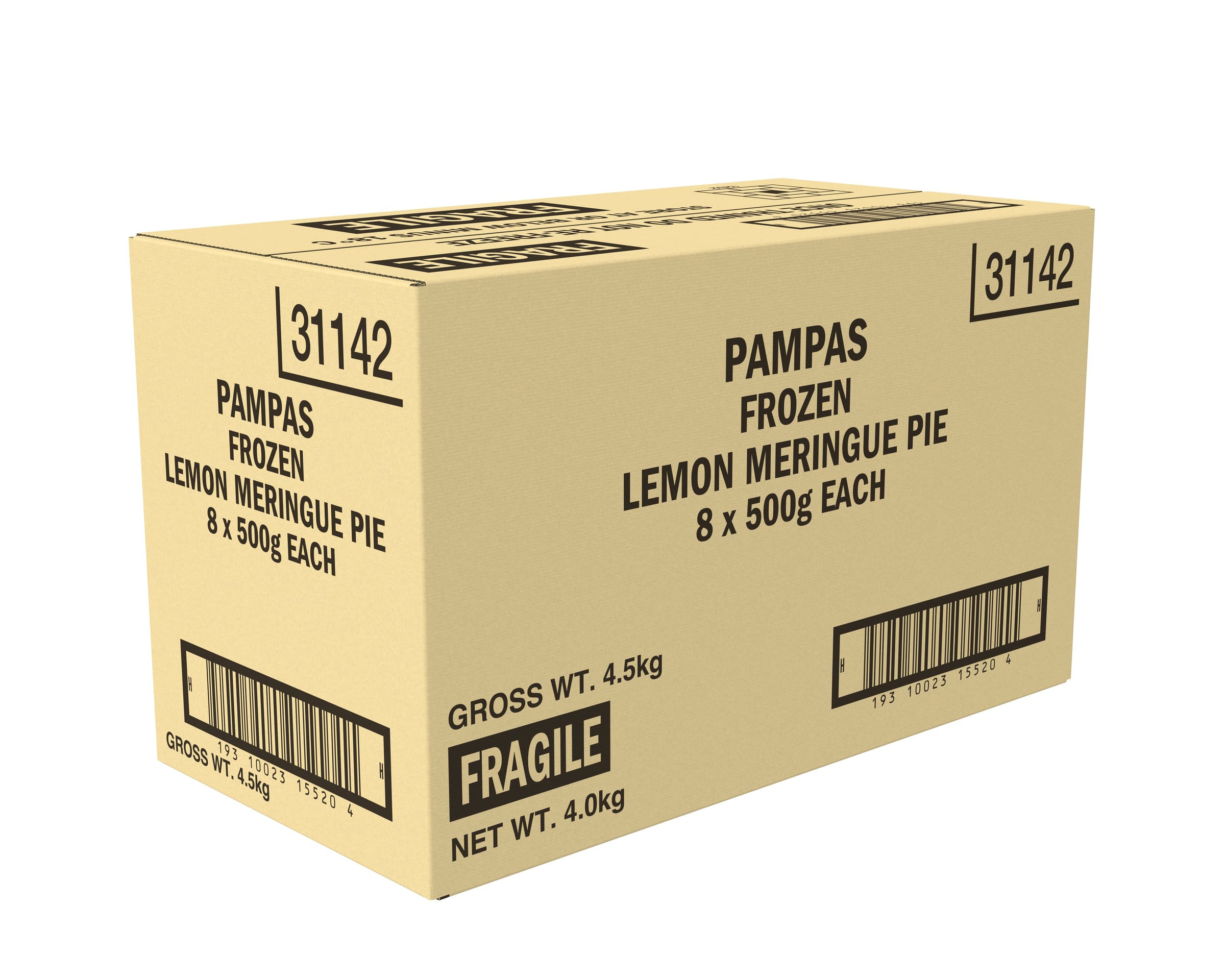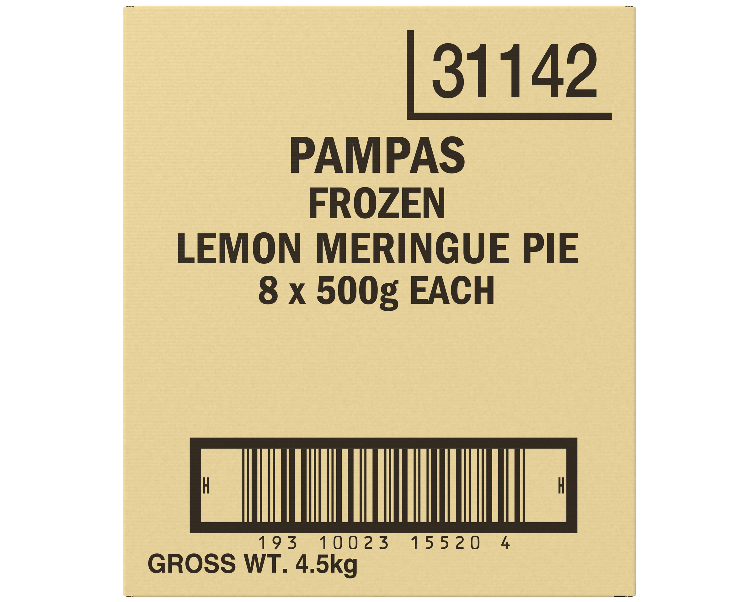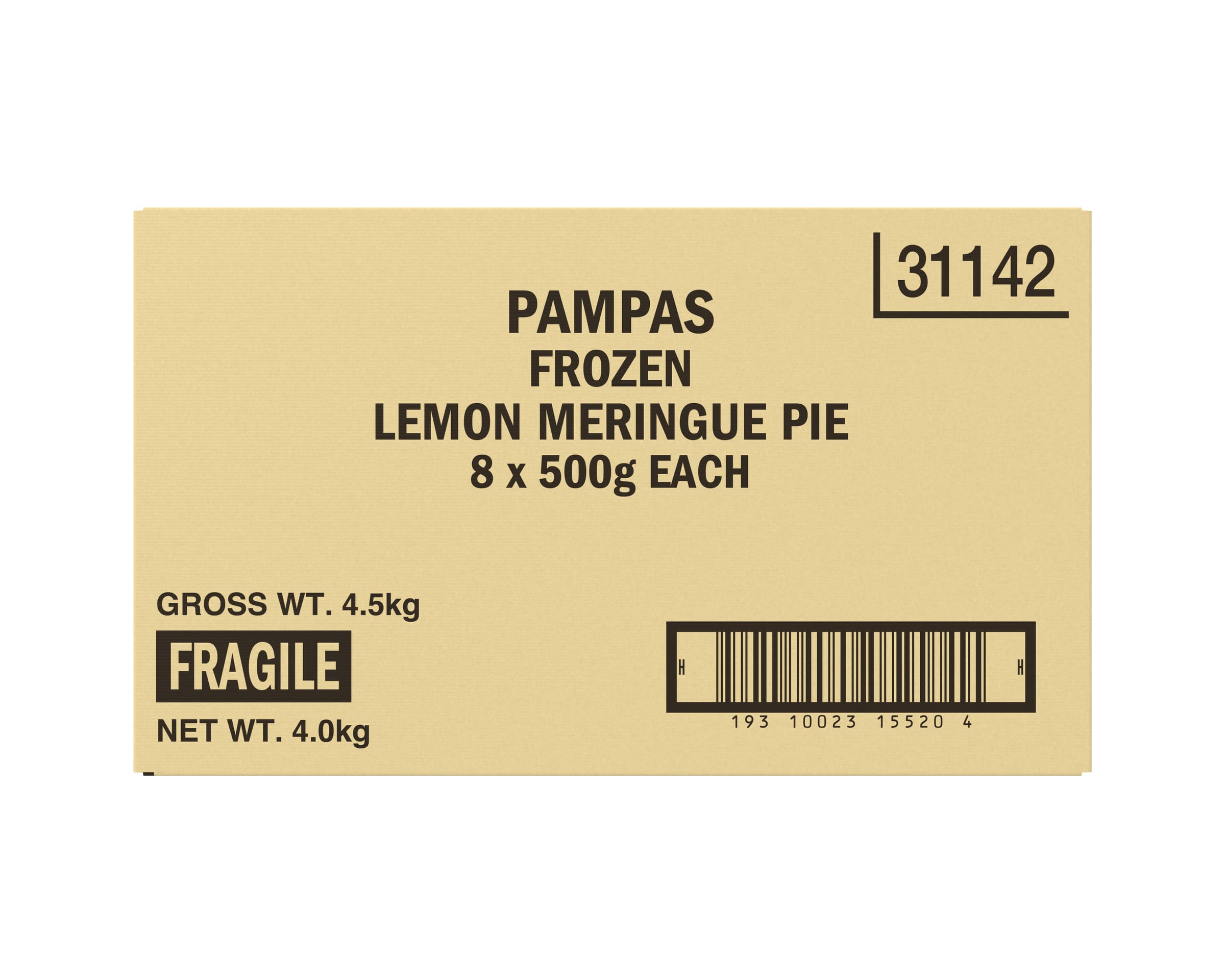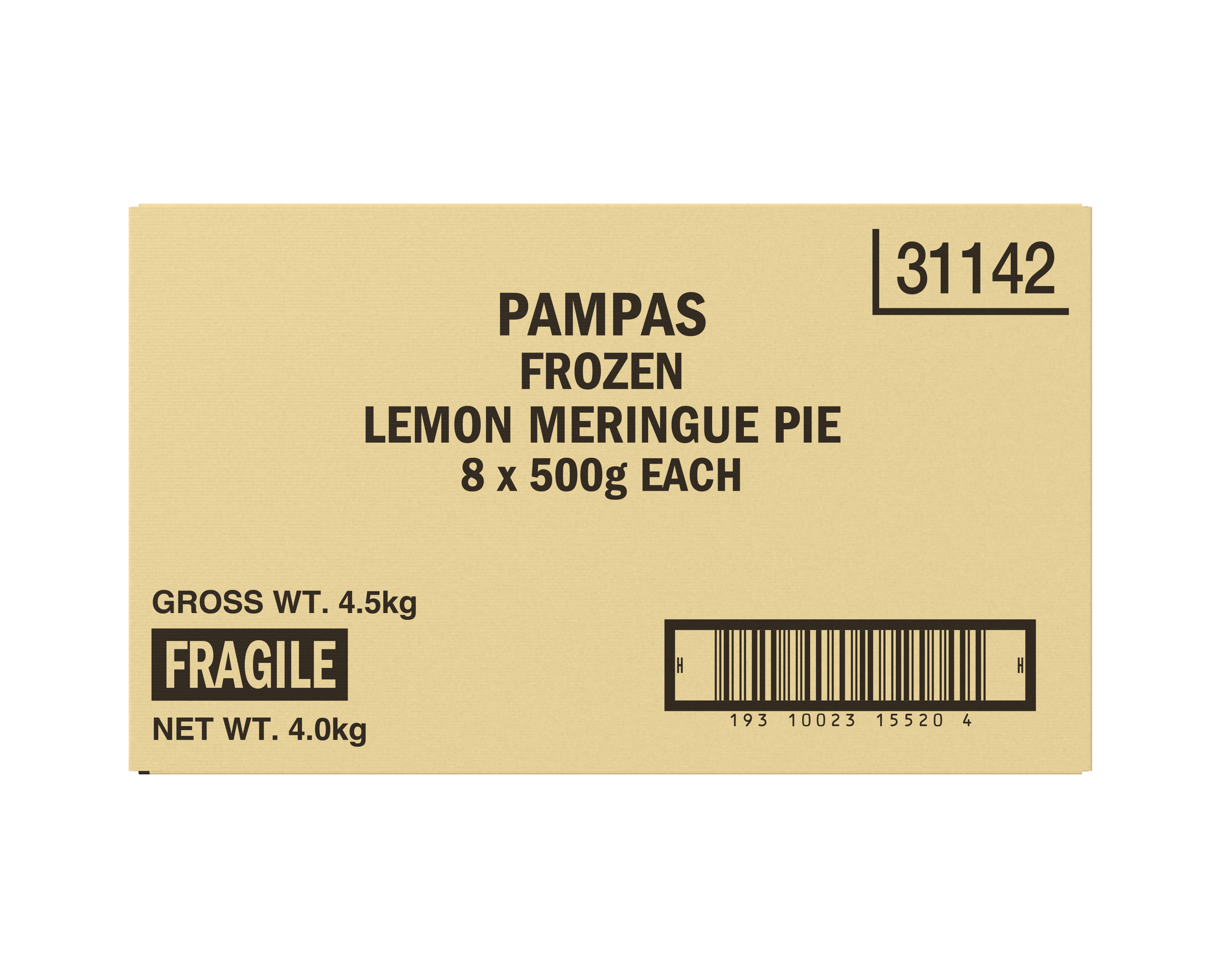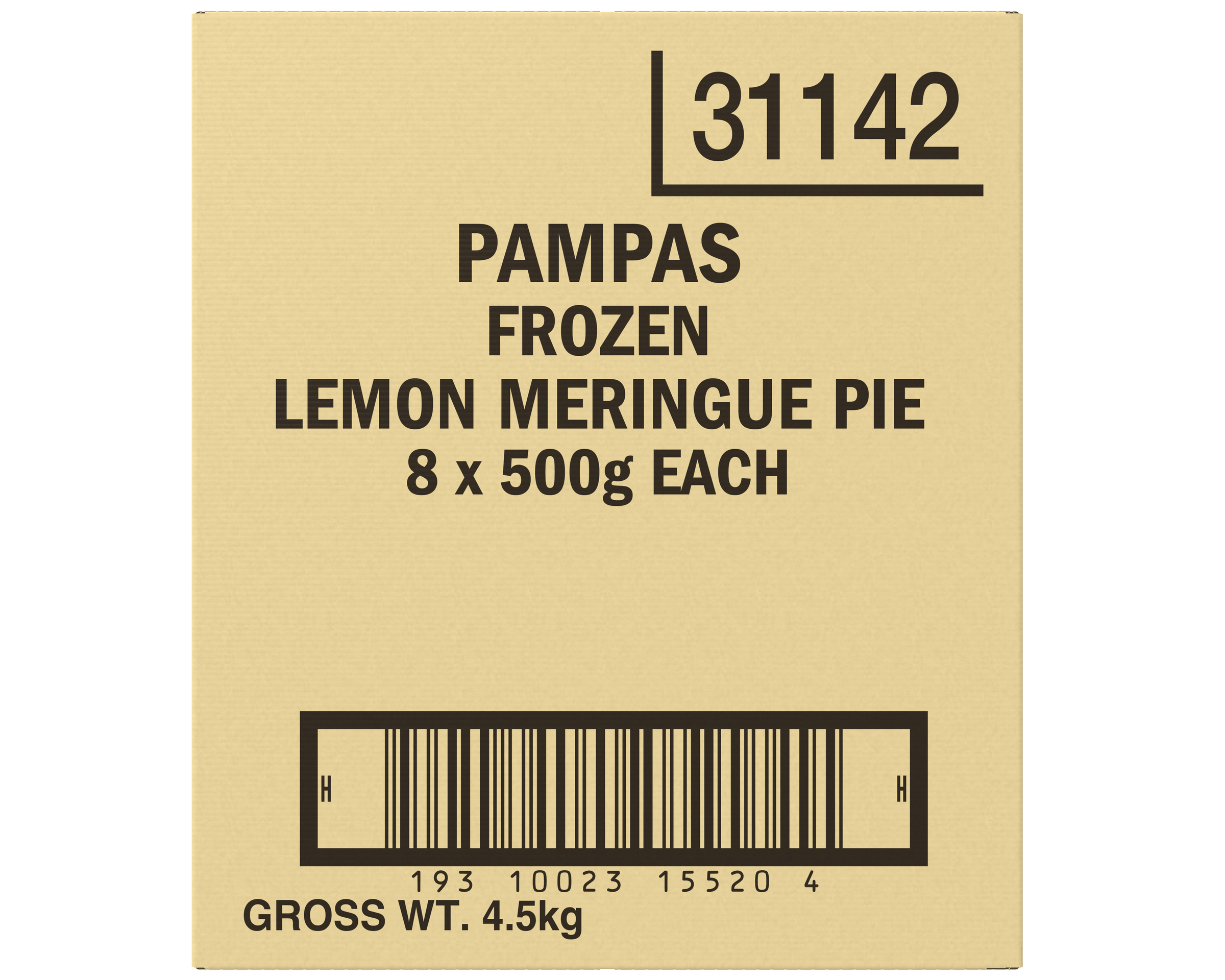 Baked and frozen family sized pie with a sweet, shortcrust shell, soft, yellow lemon filling and topped with white, aerated meringue in a piped design. .