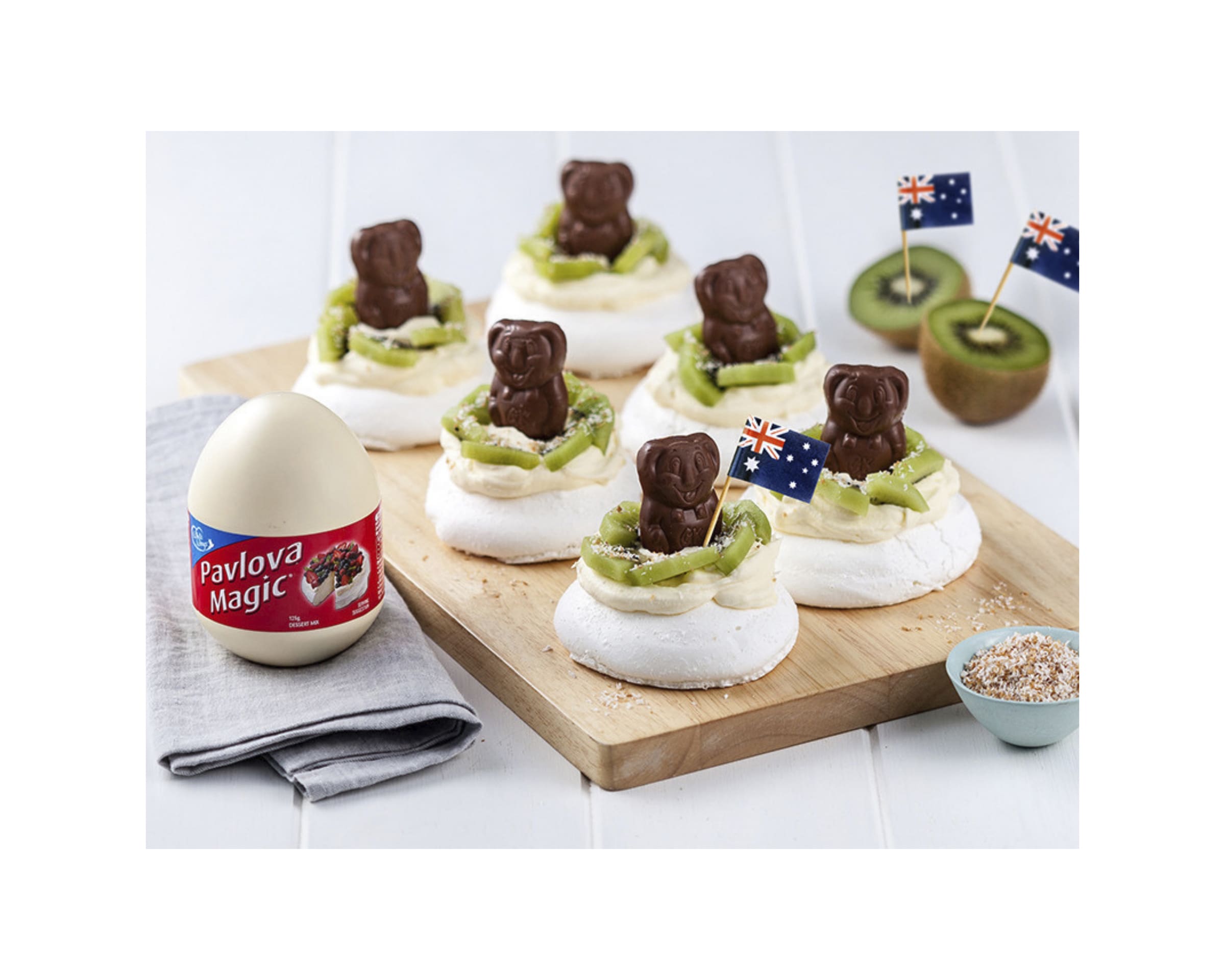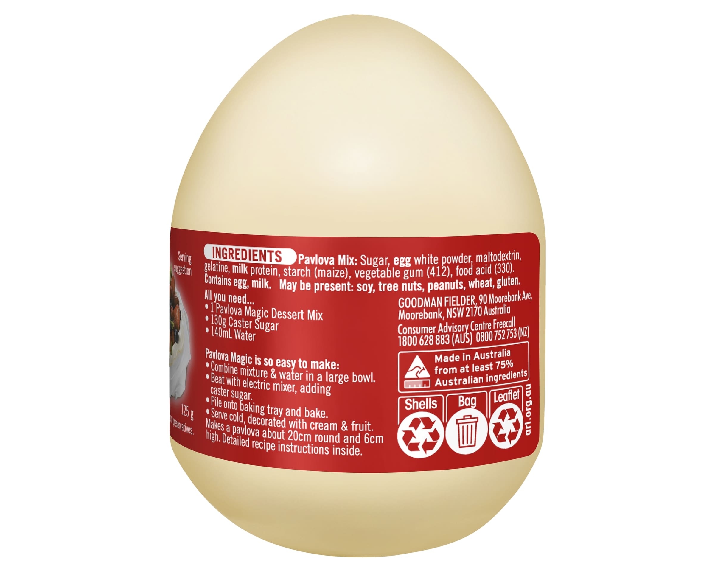Pavlova Mix: Sugar, Egg White Powder, Maltodextrin, Gelatine, Milk Protein, Starch (Maize), Vegetable Gum (412), Food Acid (330)