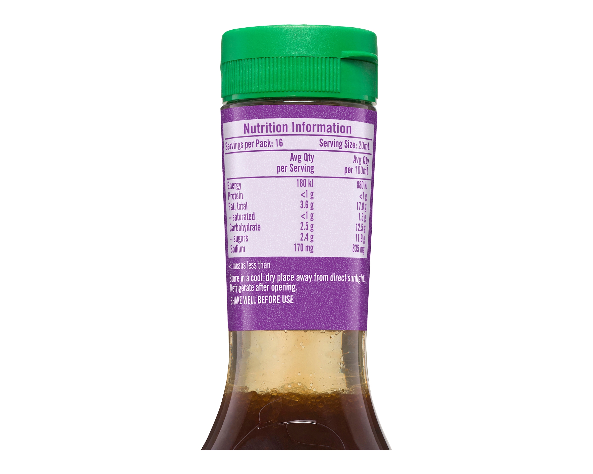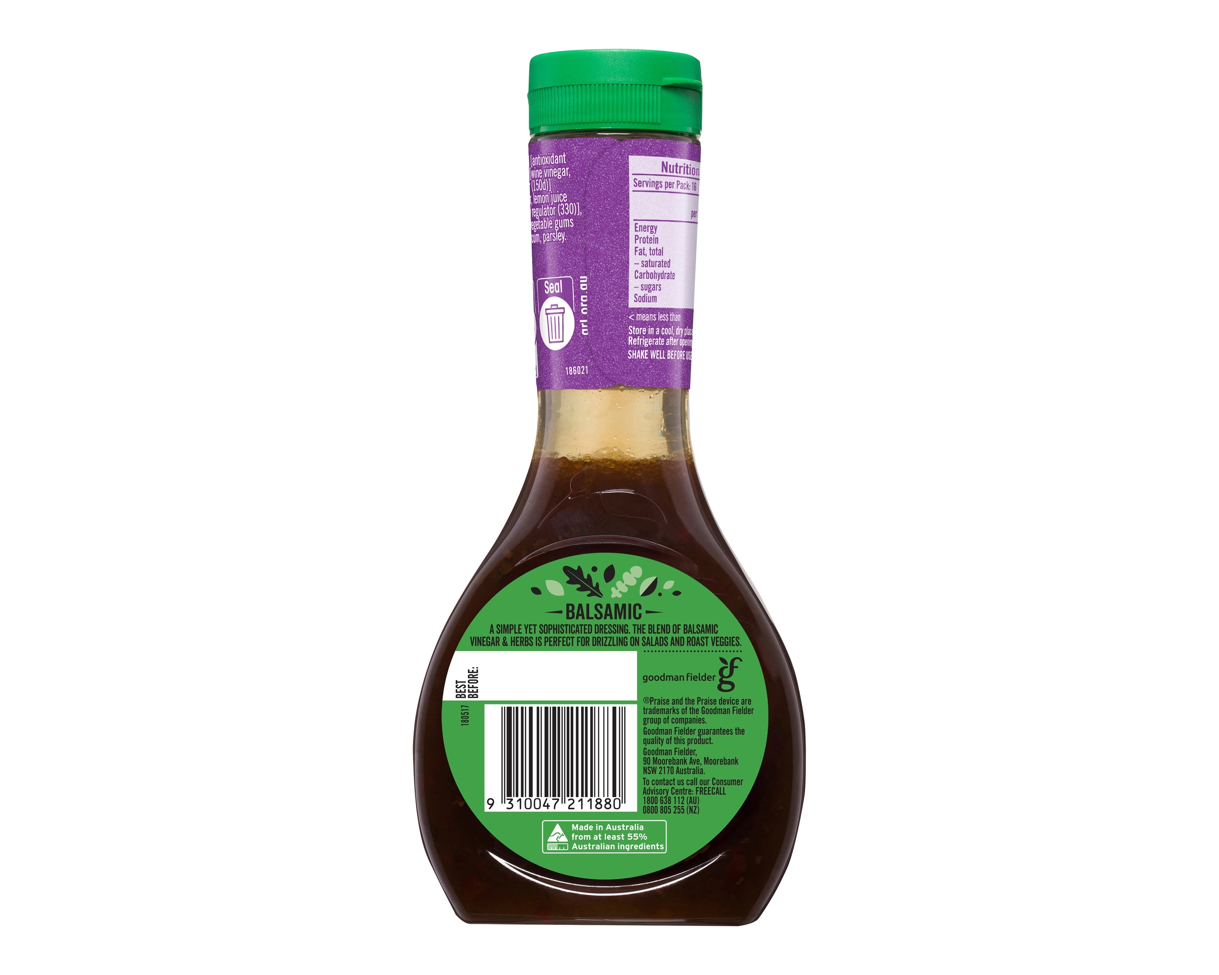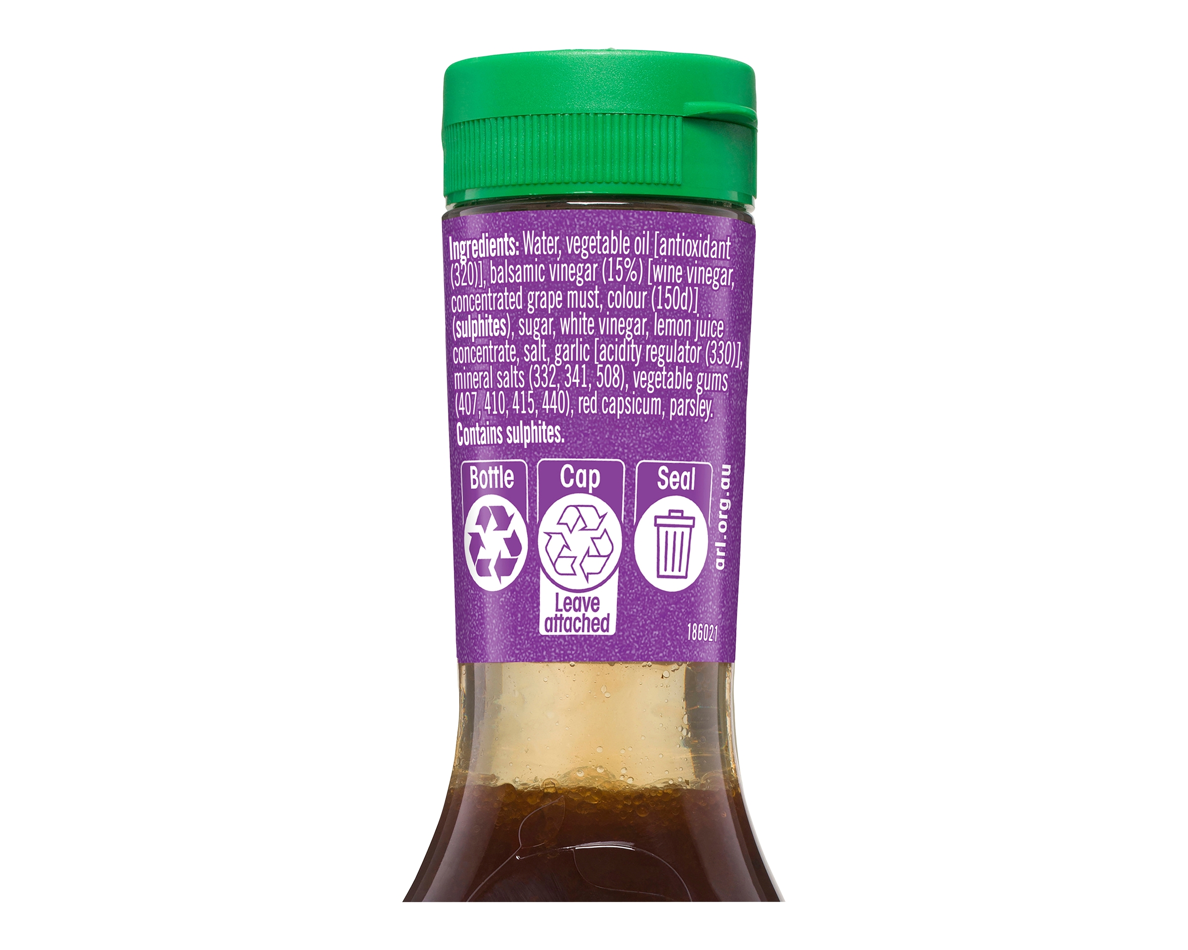 Water, Vegetable Oil (Antioxidant (320)), Balsamic Vinegar (15%) (Wine Vinegar, Concentrated Grape Must, Colour (150d)) (Sulphites), Sugar, White Vinegar, Lemon Juice Concentrate, Salt, Garlic (Acidity Regulator (330)), Mineral Salts (332, 341, 508), Vegetable Gums (407, 410, 415, 440), Red Capsicum, Parsley
