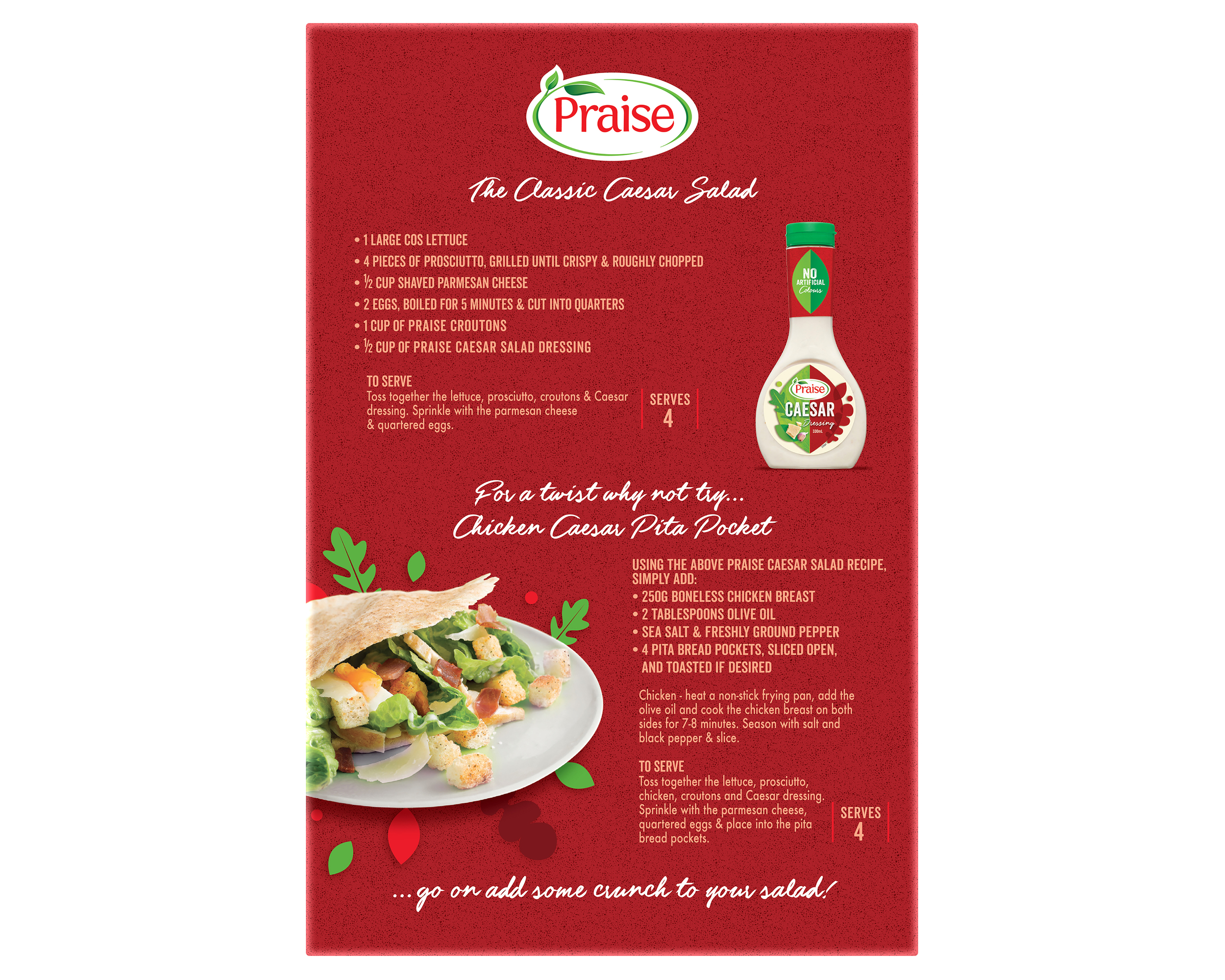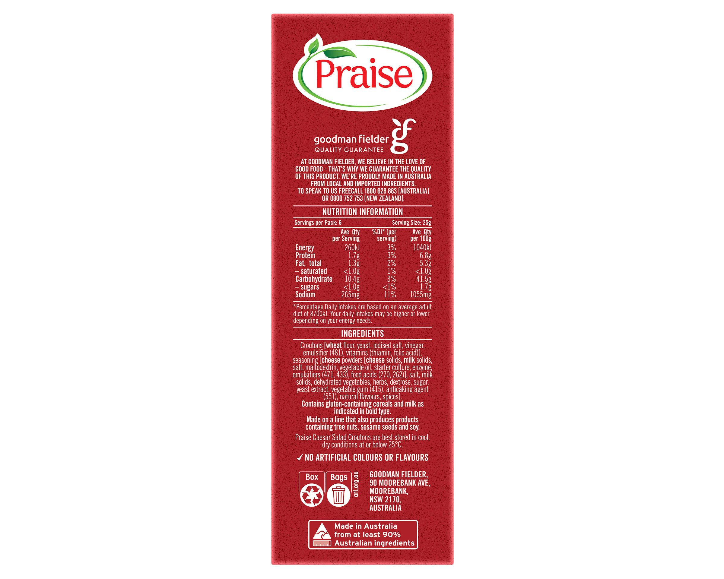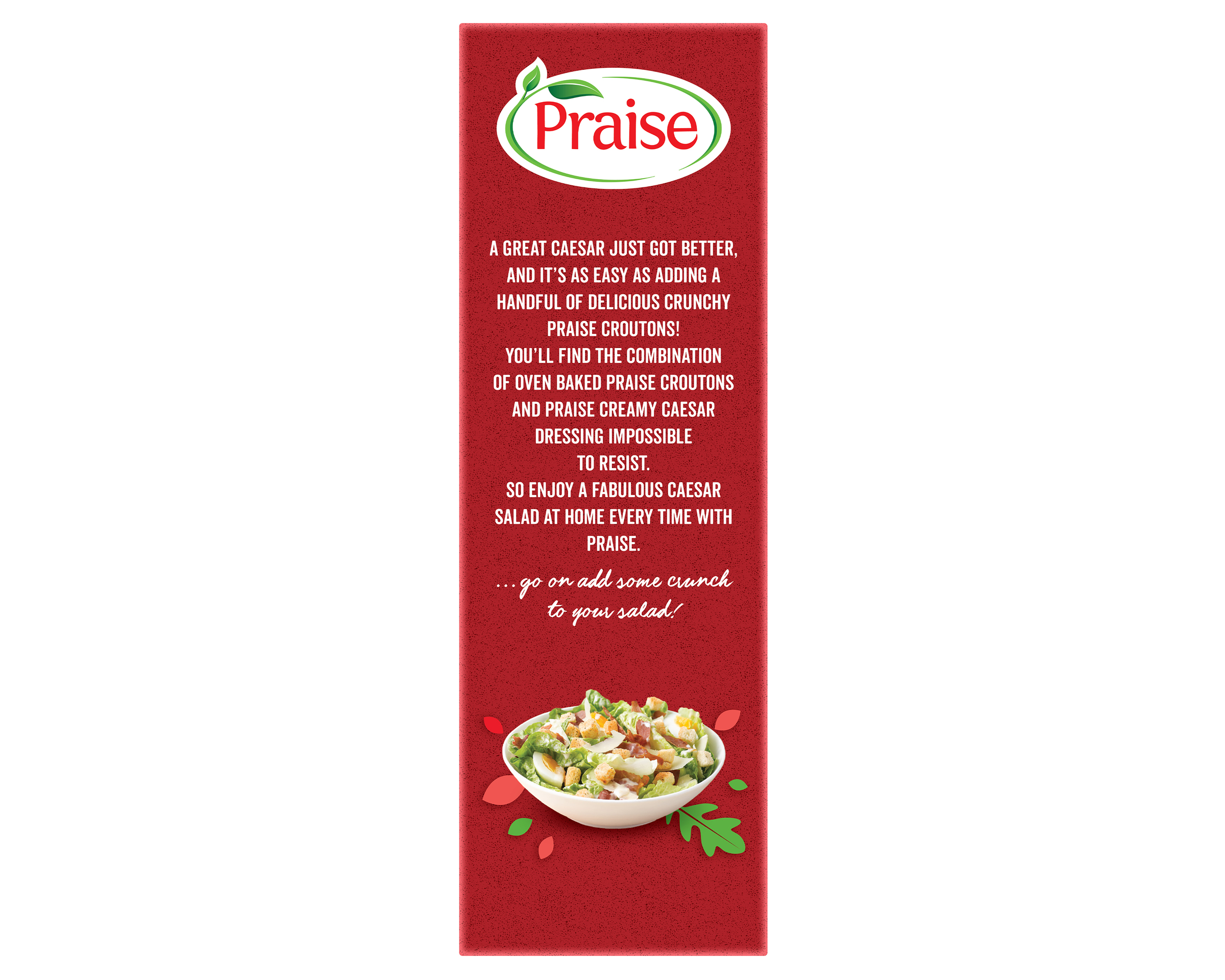 Praise Caesar Salad Croutons are best stored in cool, dry conditions at or below 25°C. Store between 15°C and 25°C.
