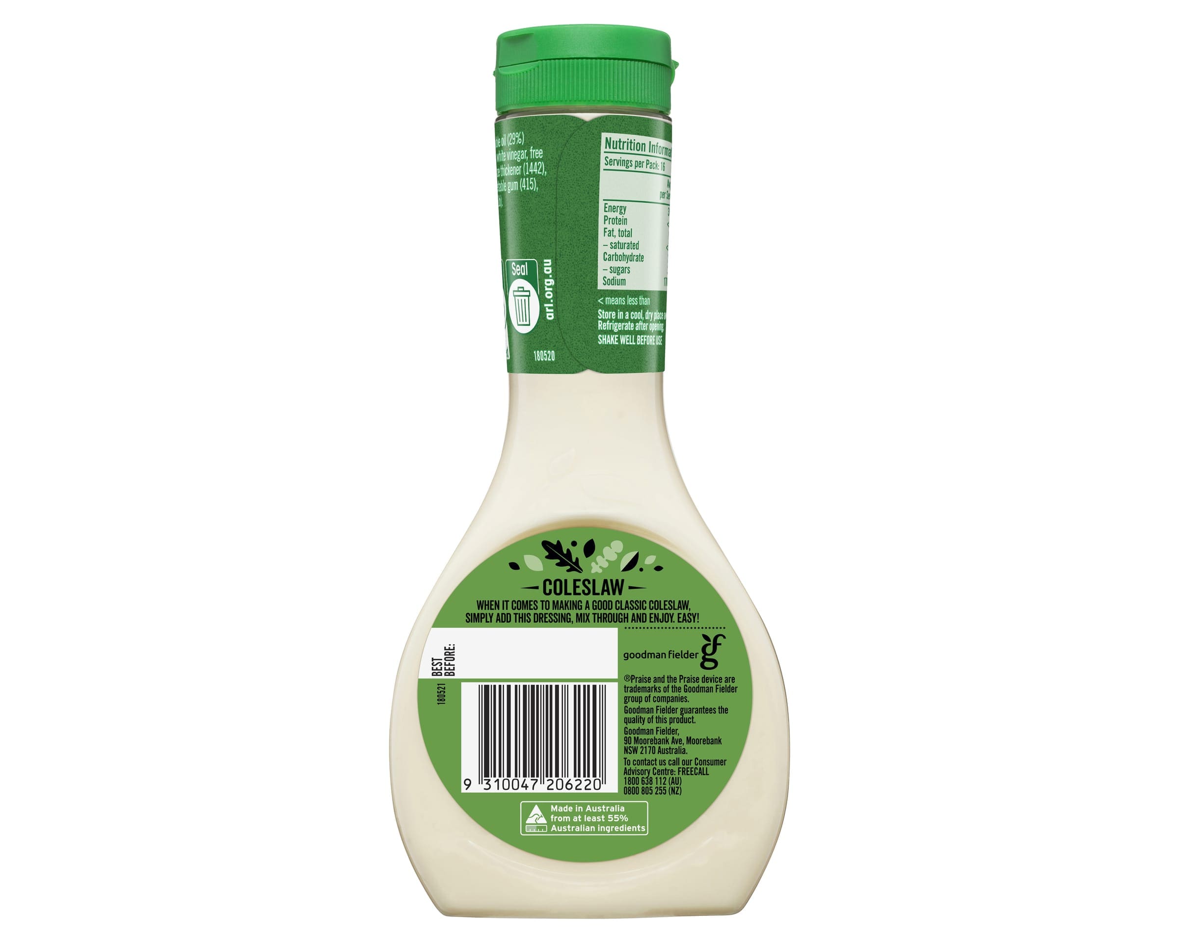 When it comes to making a classic coleslaw, simply add Praise Coleslaw Dressing, mix through and enjoy. Easy! Make your coleslaw more exciting with Praise Coleslaw Dressing. it’s super easy to prepare, simply drizzle through your salad and enjoy. This dressing is made from at least 55% Australian ingredients, and is free from artificial colours or preservatives.