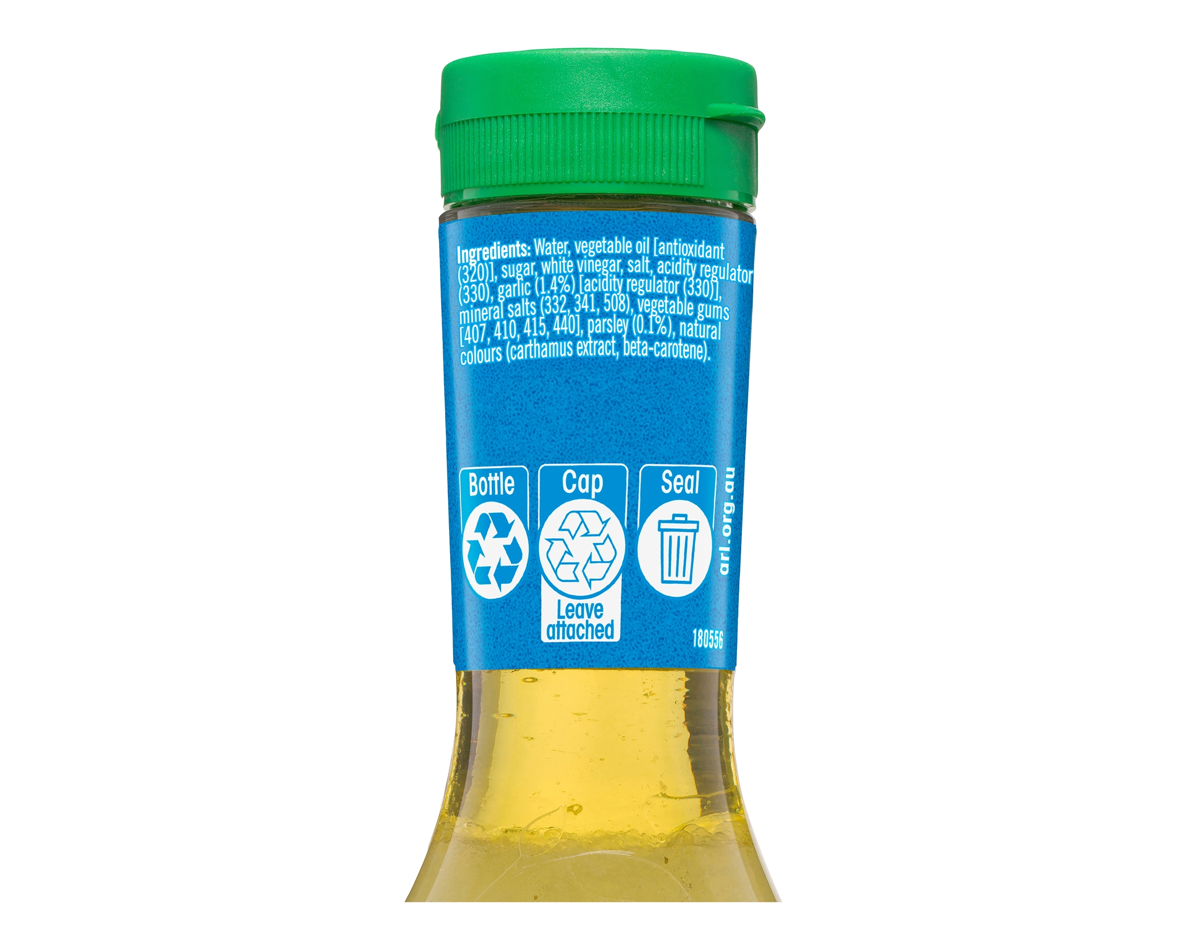 Water, Vegetable Oil [Antioxidant (320)], Sugar, White Vinegar, Salt, Acidity Regulator (330), Garlic (1.4%) [Acidity Regulator (330)], Mineral Salts (332, 341, 508), Vegetable Gums [407, 410, 415, 440], Parsley (0.1%), Natural Colours (Carthamus Extract, Beta-Carotene)
