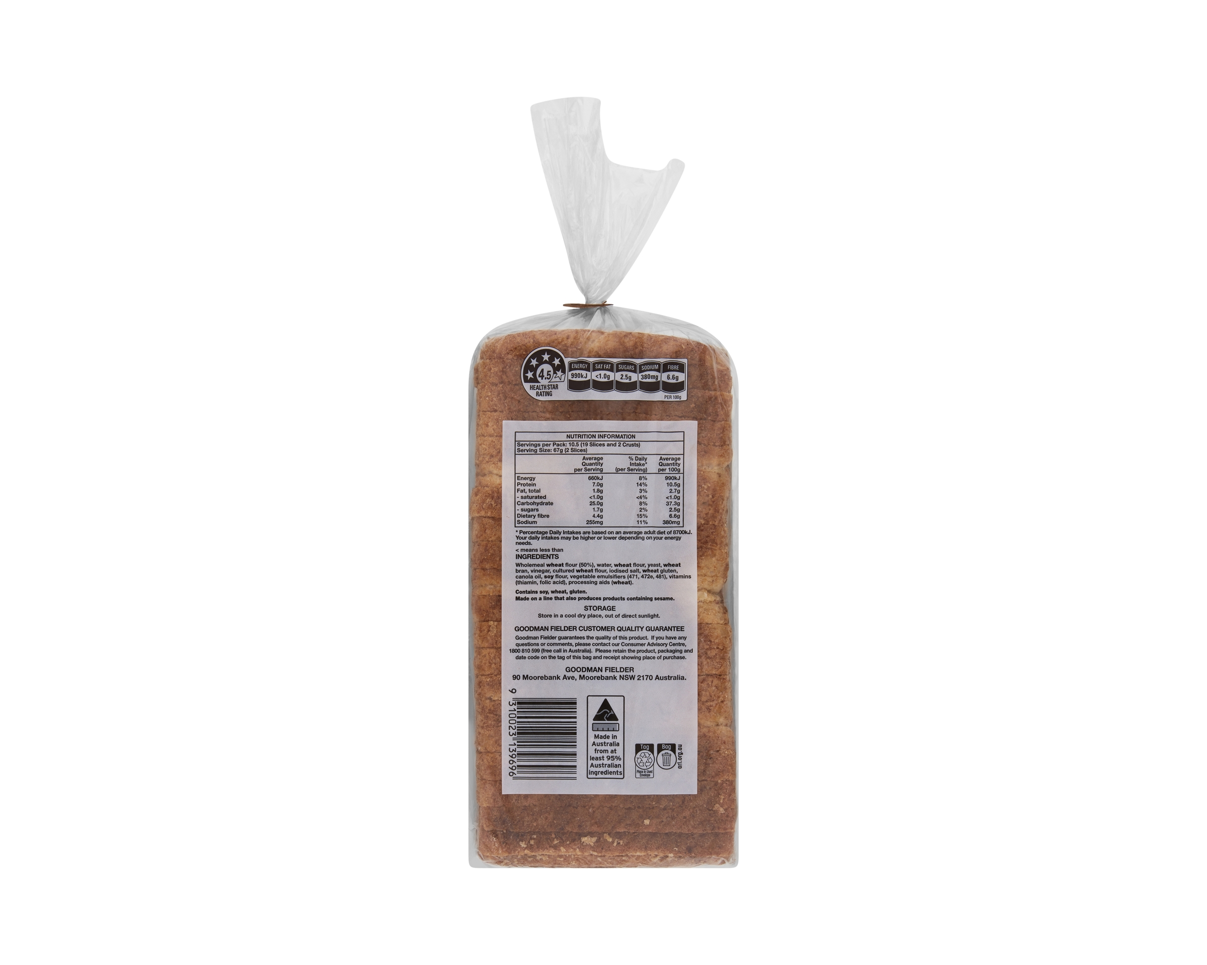 Wholemeal Wheat Flour (50%), Water, Wheat Flour, Yeast, Wheat Bran, Vinegar, Cultured Wheat Flour, Iodised Salt, Wheat Gluten, Canola Oil, Soy Flour, Vegetable Emulsifiers (471, 472e, 481), Vitamins (Thiamin, Folic Acid), Processing Aids (Wheat)