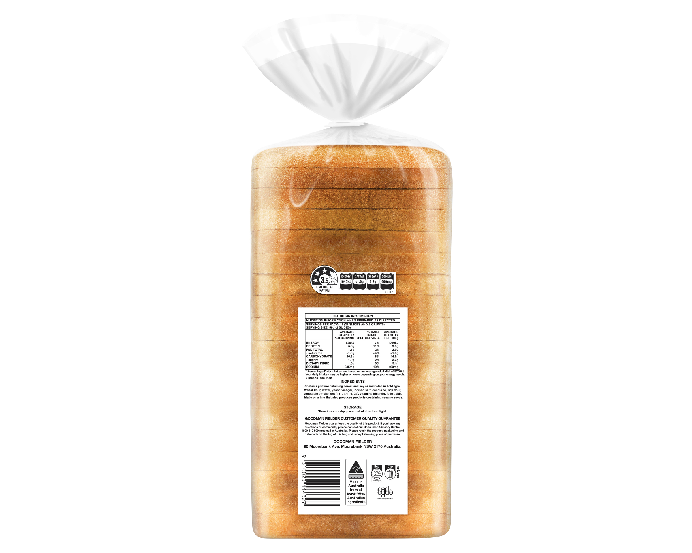 Wheat Flour, Water, Yeast, Vinegar, Iodised Salt, Canola Oil, Soy Flour, Vegetable Emulsifiers (481, 471, 472e), Vitamins (Thiamin, Folic Acid)