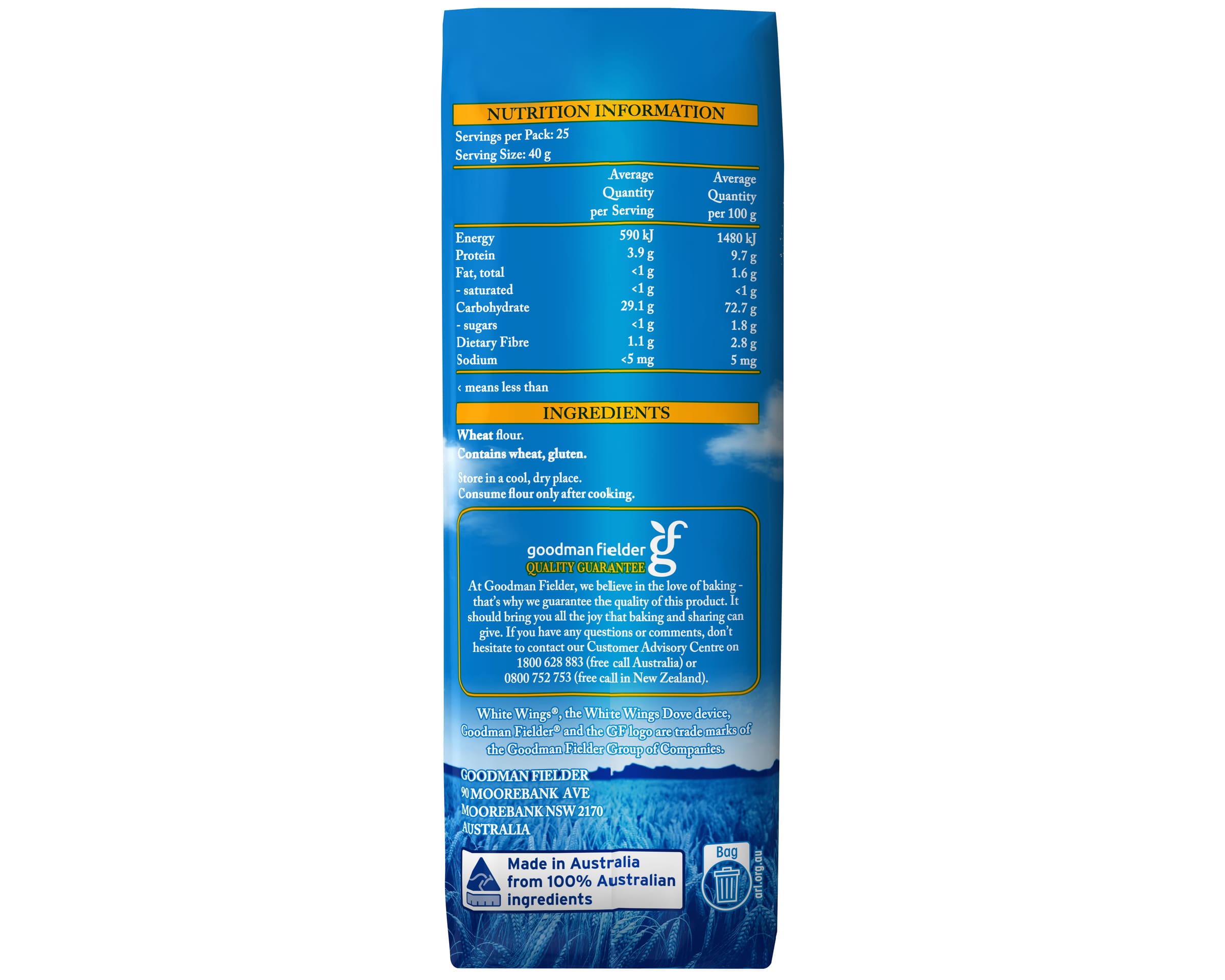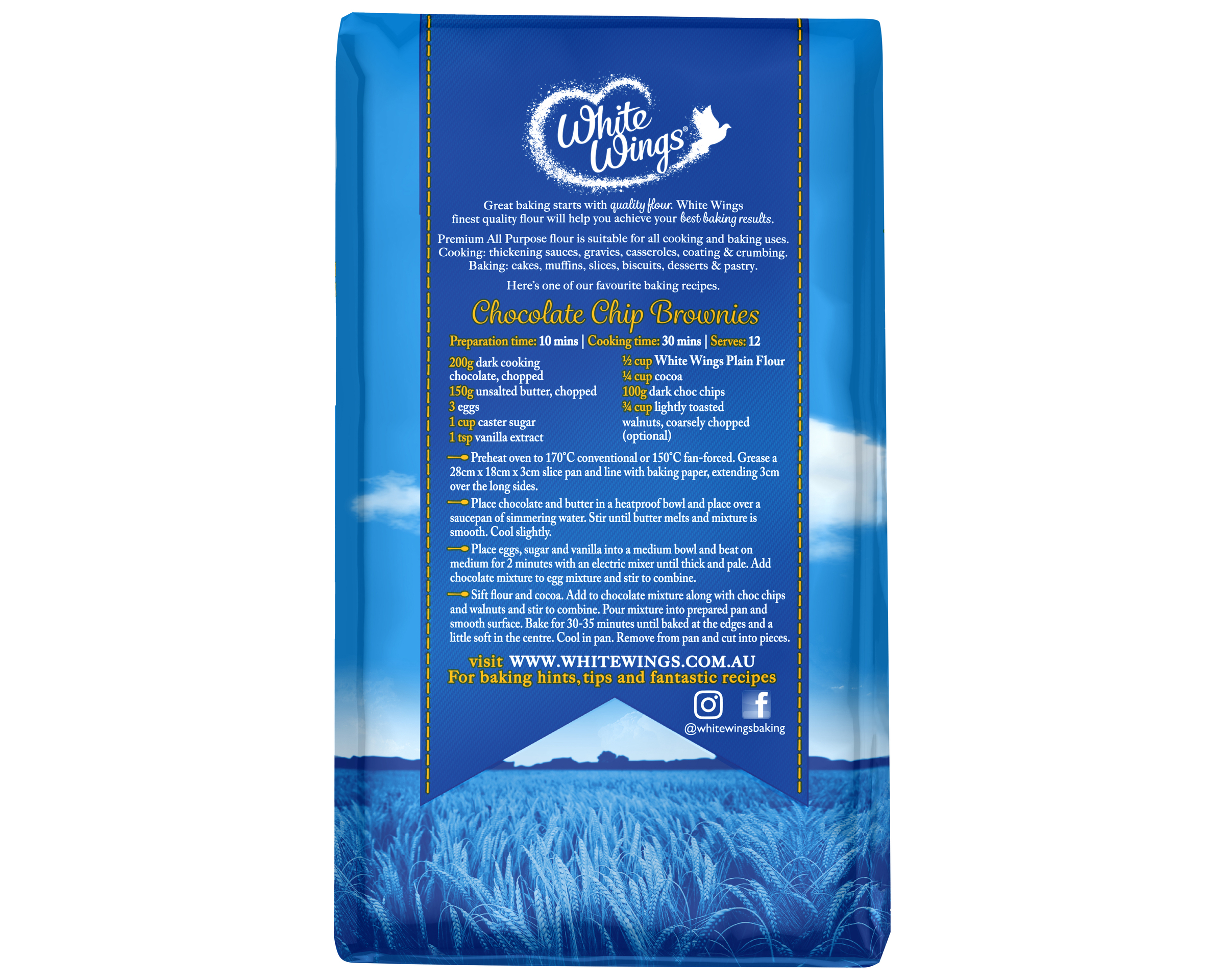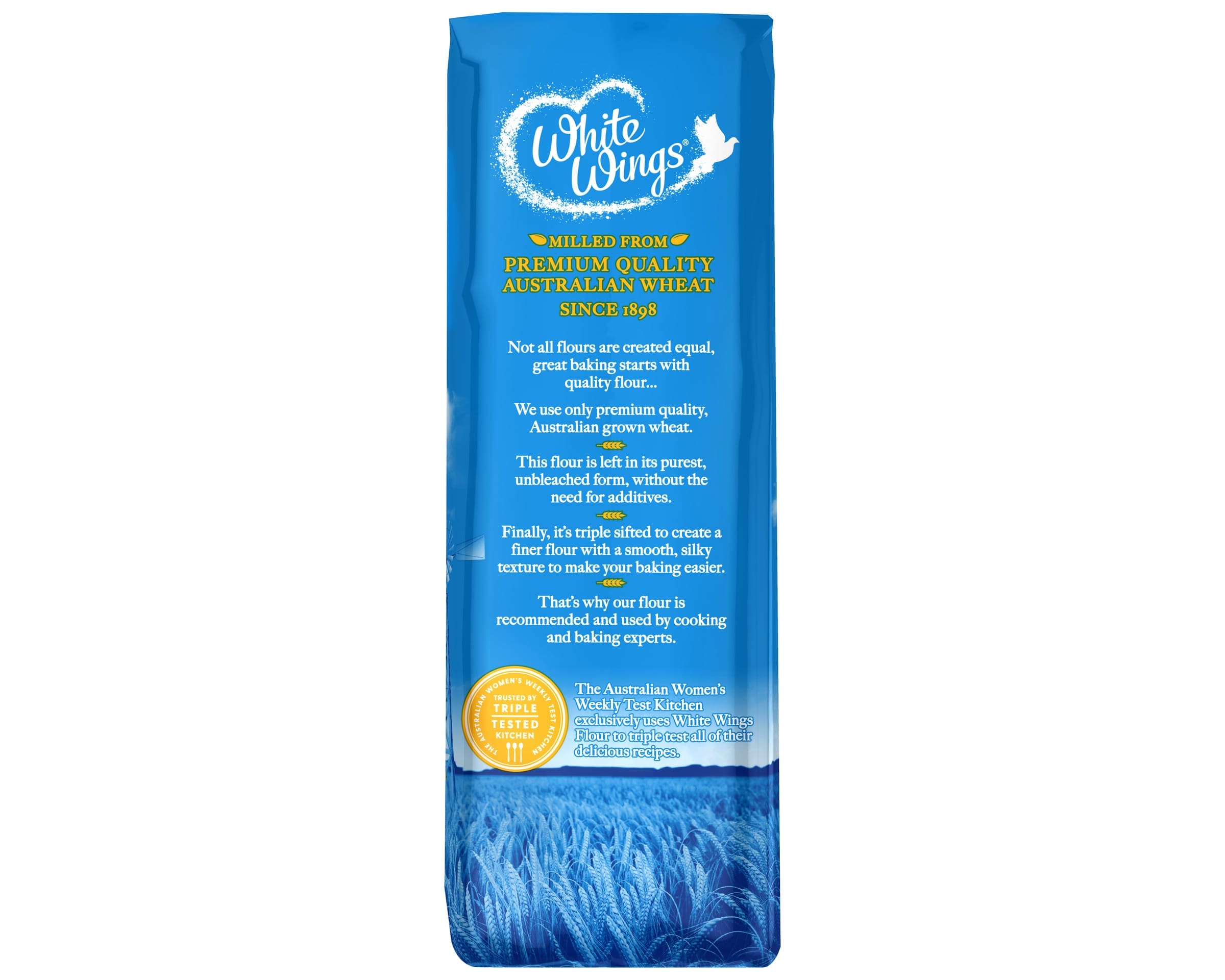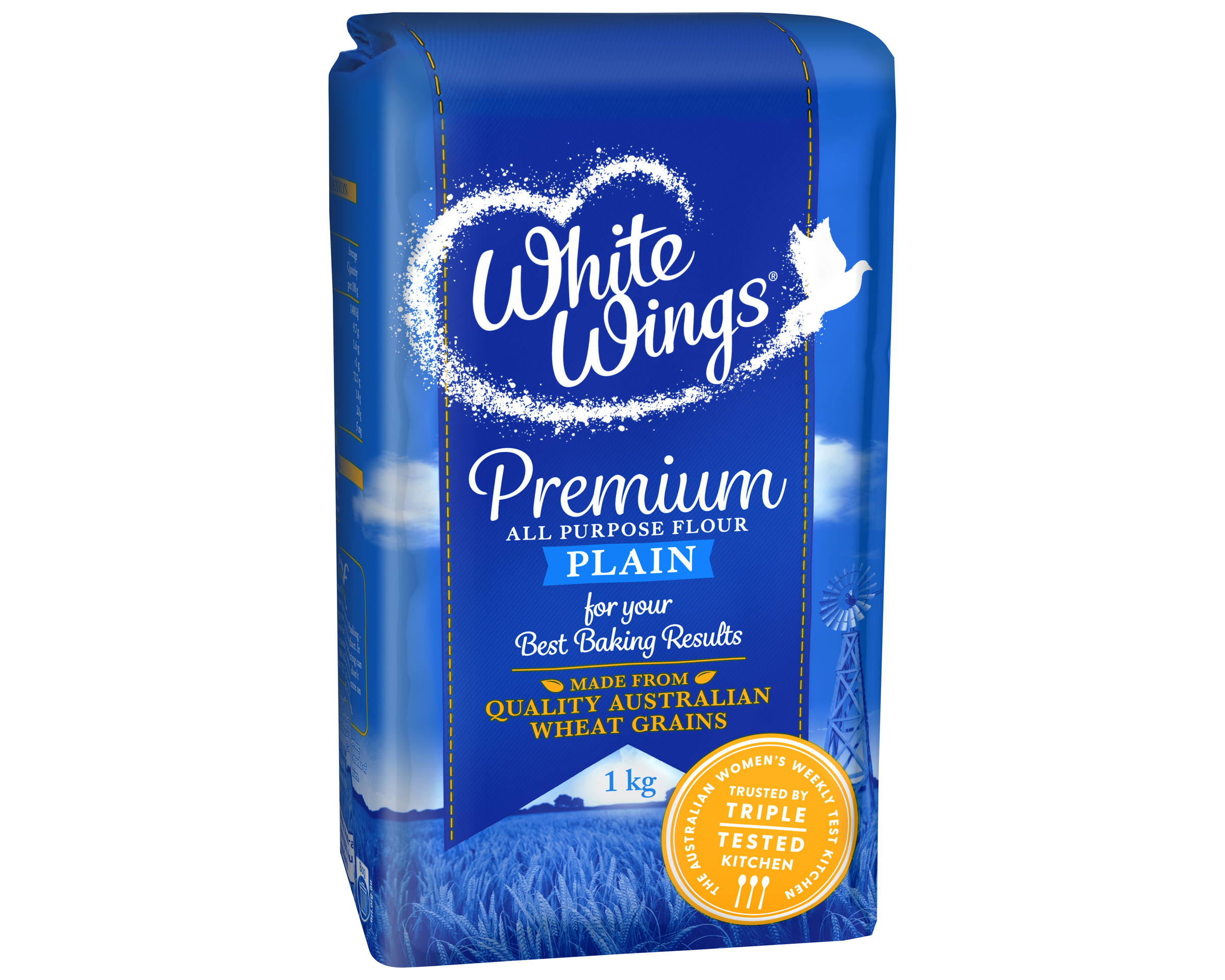 There's Magic inside White Wings Premium All Purpose Plain Flour is made from quality Australian wheat grains to make sure you get the best cooking and baking results. it's a versatile kitchen staple. Great baking starts with quality flour. White Wings Premium All Purpose Plain Flour is crafted from premium quality Australian grown wheat, leaving it in it's purest form without the need for additives.