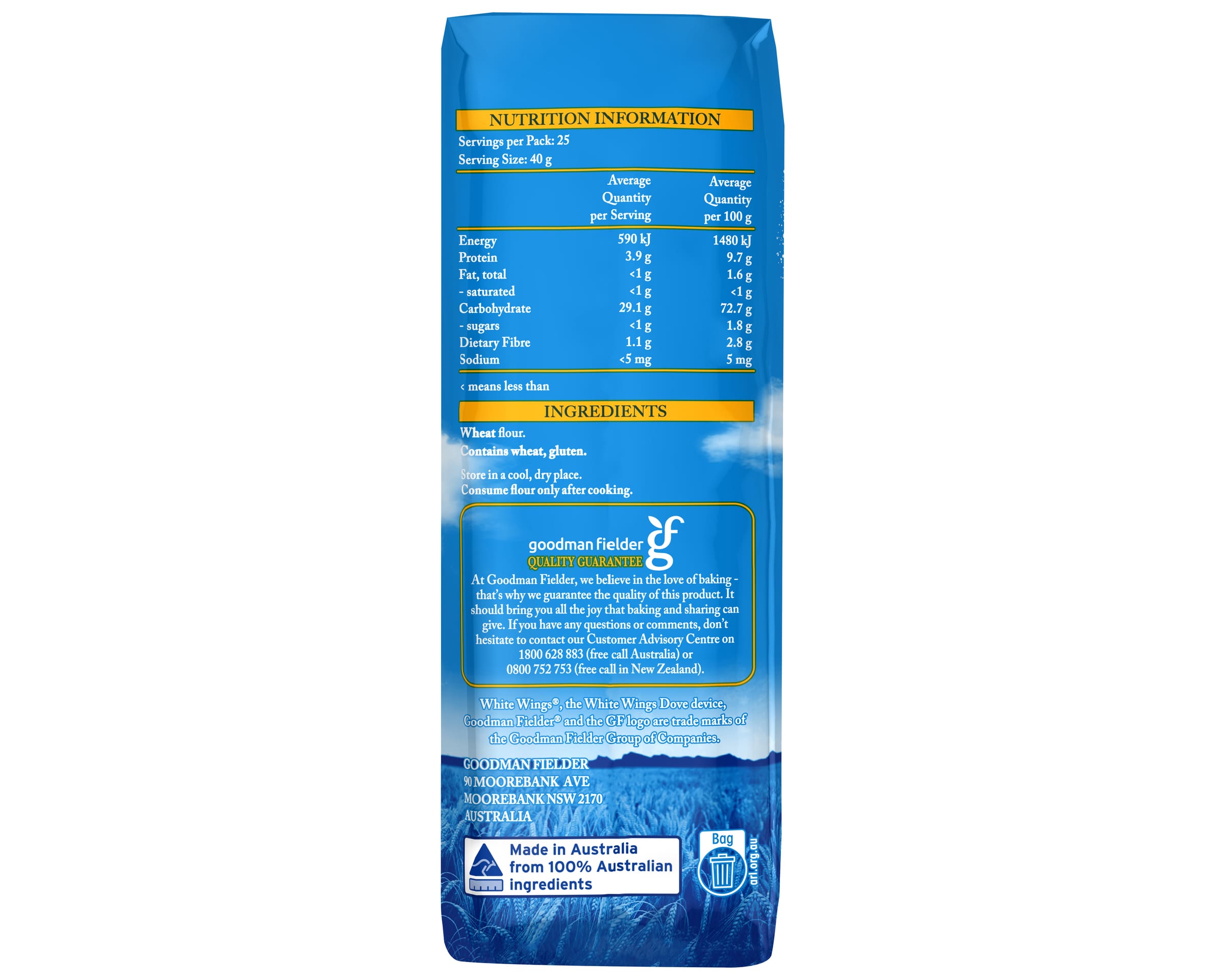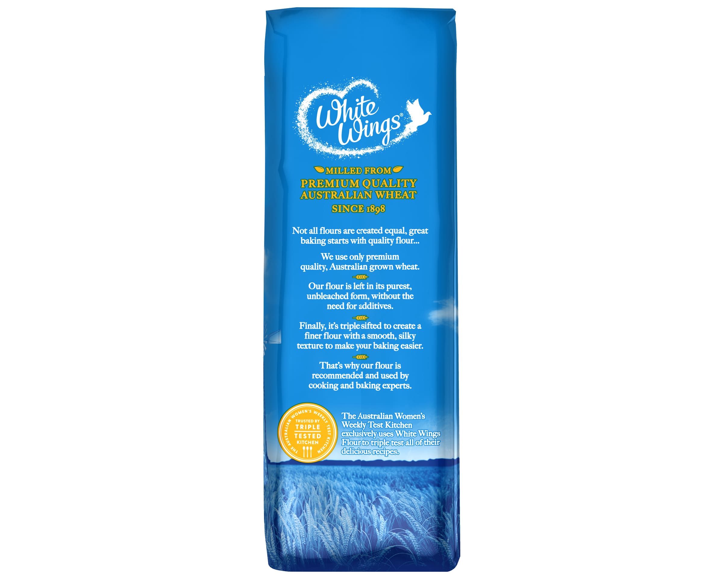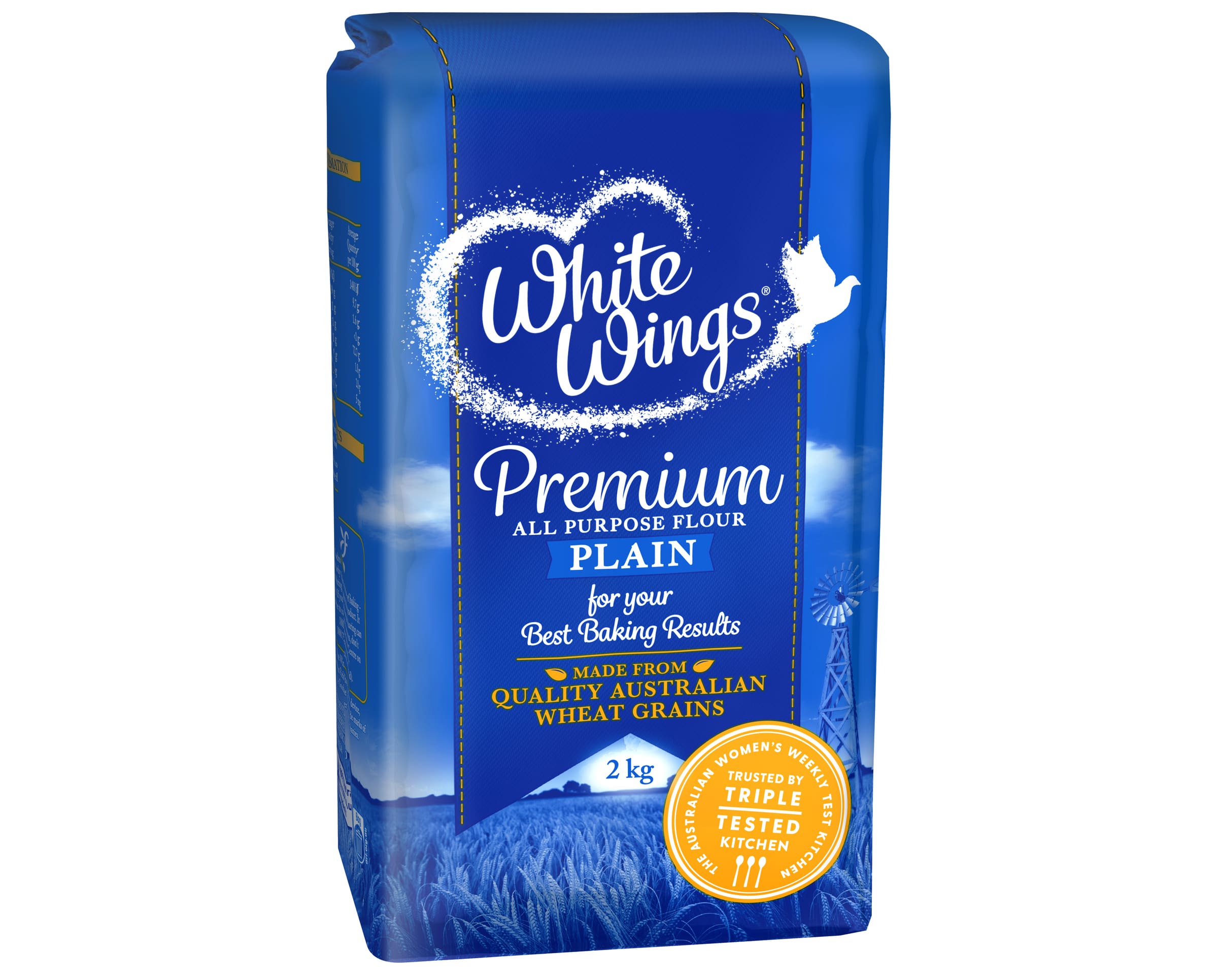 White Wings Premium All Purpose Plain Flour is made from quality Australian wheat grains to make sure you get the best cooking and baking results. it's a versatile kitchen staple. Great baking starts with quality flour. White Wings Premium All Purpose Plain Flour is crafted from premium quality Australian grown wheat, leaving it in it's purest form without the need for additives.