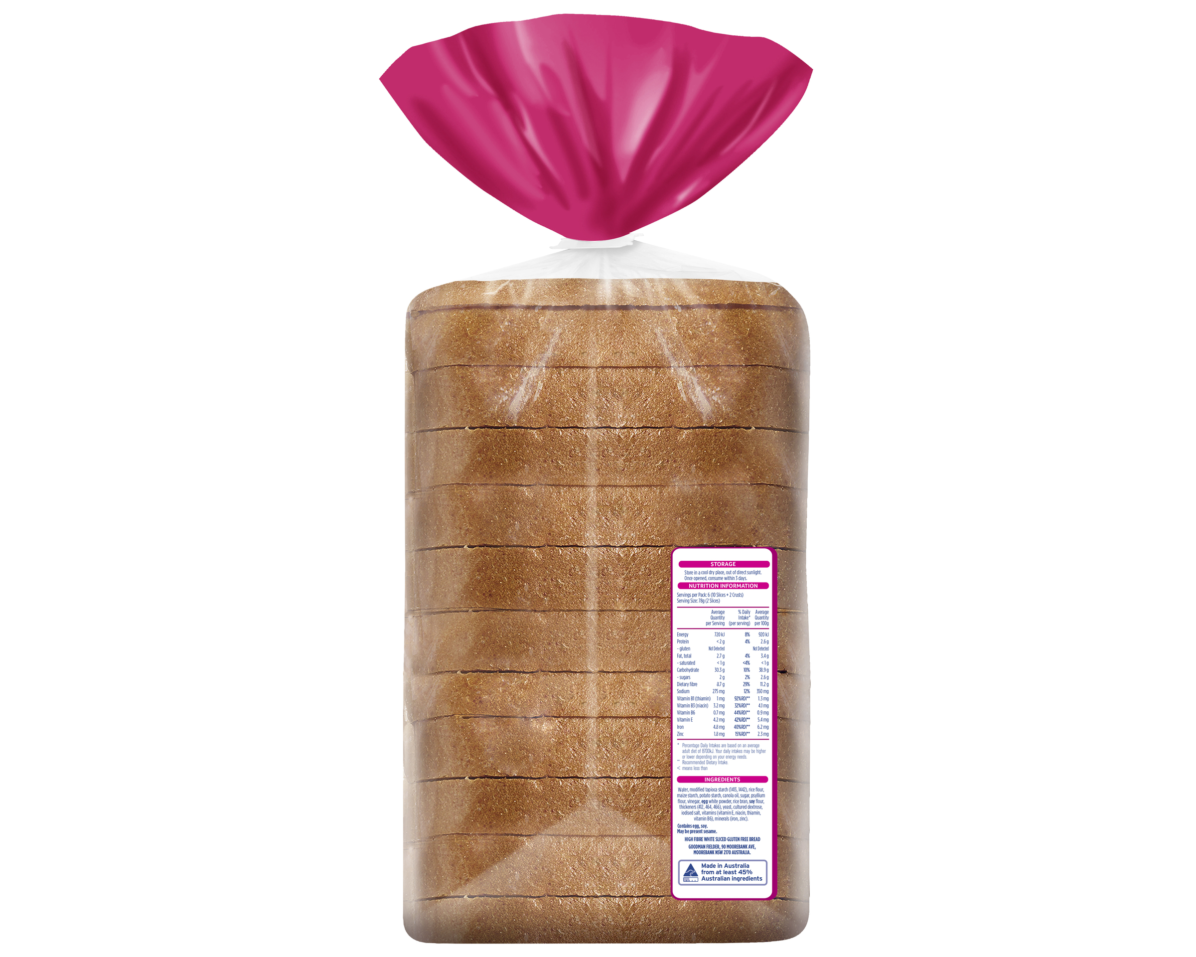 Water, Modified Tapioca Starch (1413, 1442), Rice Flour, Maize Starch, Potato Starch, Canola Oil, Sugar, Psyllium Flour, Vinegar, Egg White Powder, Rice Bran, Soy Flour, Thickeners (412, 464, 466), Yeast, Cultured Dextrose, Iodised Salt, Vitamins (Vitamin E, Niacin, Thiamin, Vitamin B6), Minerals (Iron, Zinc)