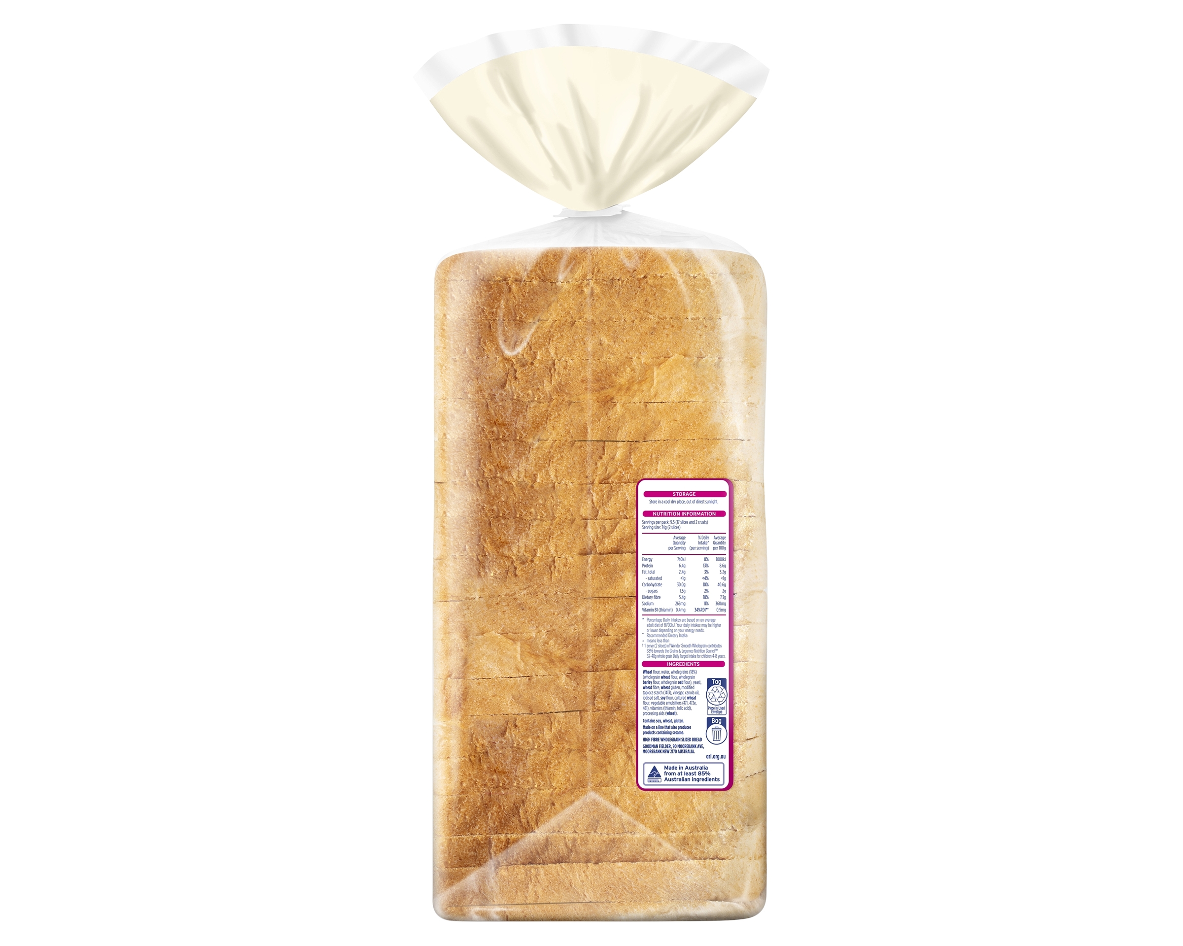 Wheat Flour, Water, Wholegrains (18%) (Wholegrain Wheat Flour, Wholegrain Barley Flour, Wholegrain Oat Flour), Yeast, Wheat Fibre, Wheat Gluten, Modified Tapioca Starch (1413), Vinegar, Canola Oil, Iodised Salt, Soy Flour, Cultured Wheat Flour, Vegetable Emulsifiers (471, 472e, 481), Vitamins (Thiamin, Folic Acid), Processing Aids (Wheat)