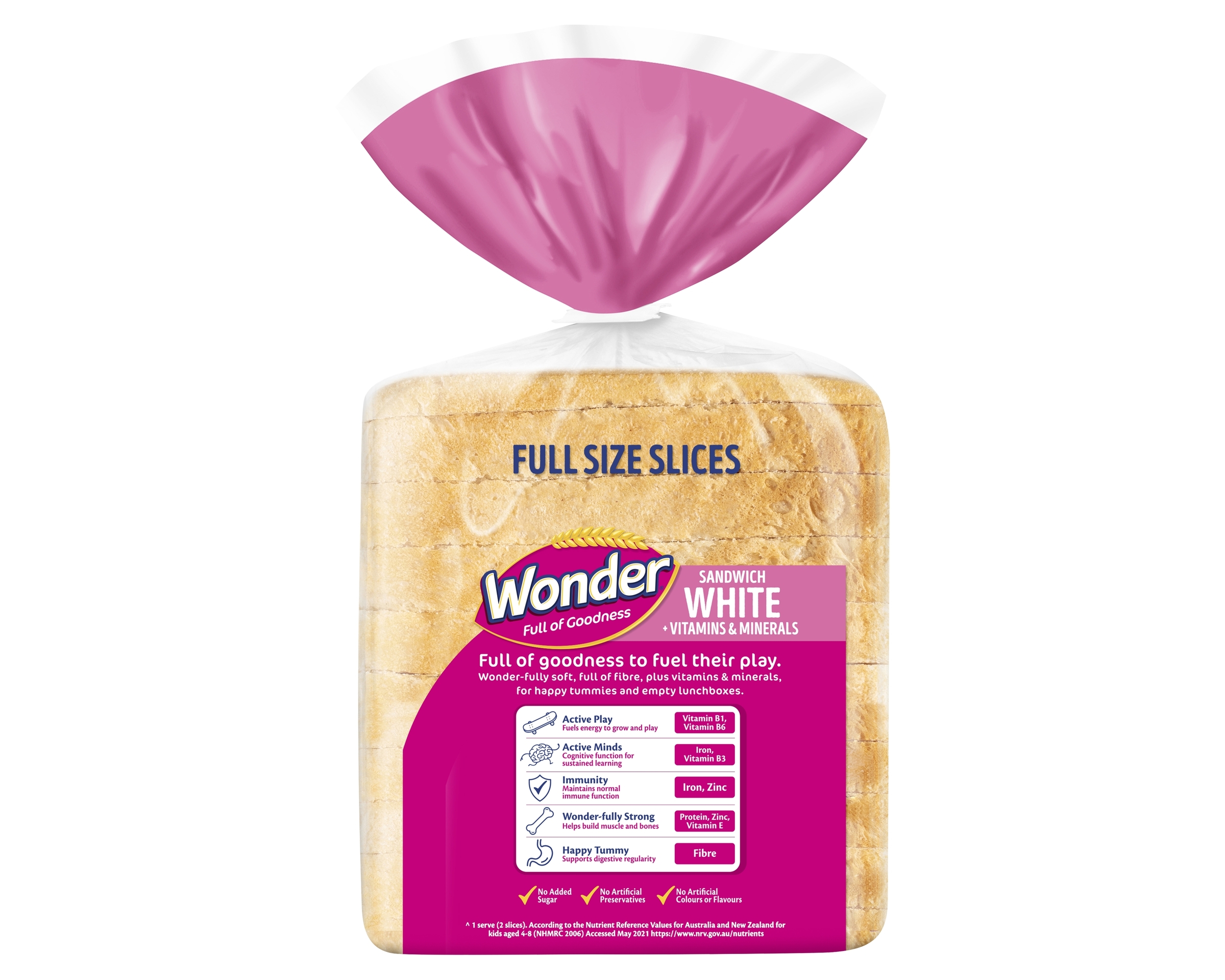 ^ 1 serve (2 slices). According to the Nutrient Reference Values for Australia and New Zealand for kids aged 4-8 (NHMRC 2006) Accessed May 2021 https://www. nrv. gov.