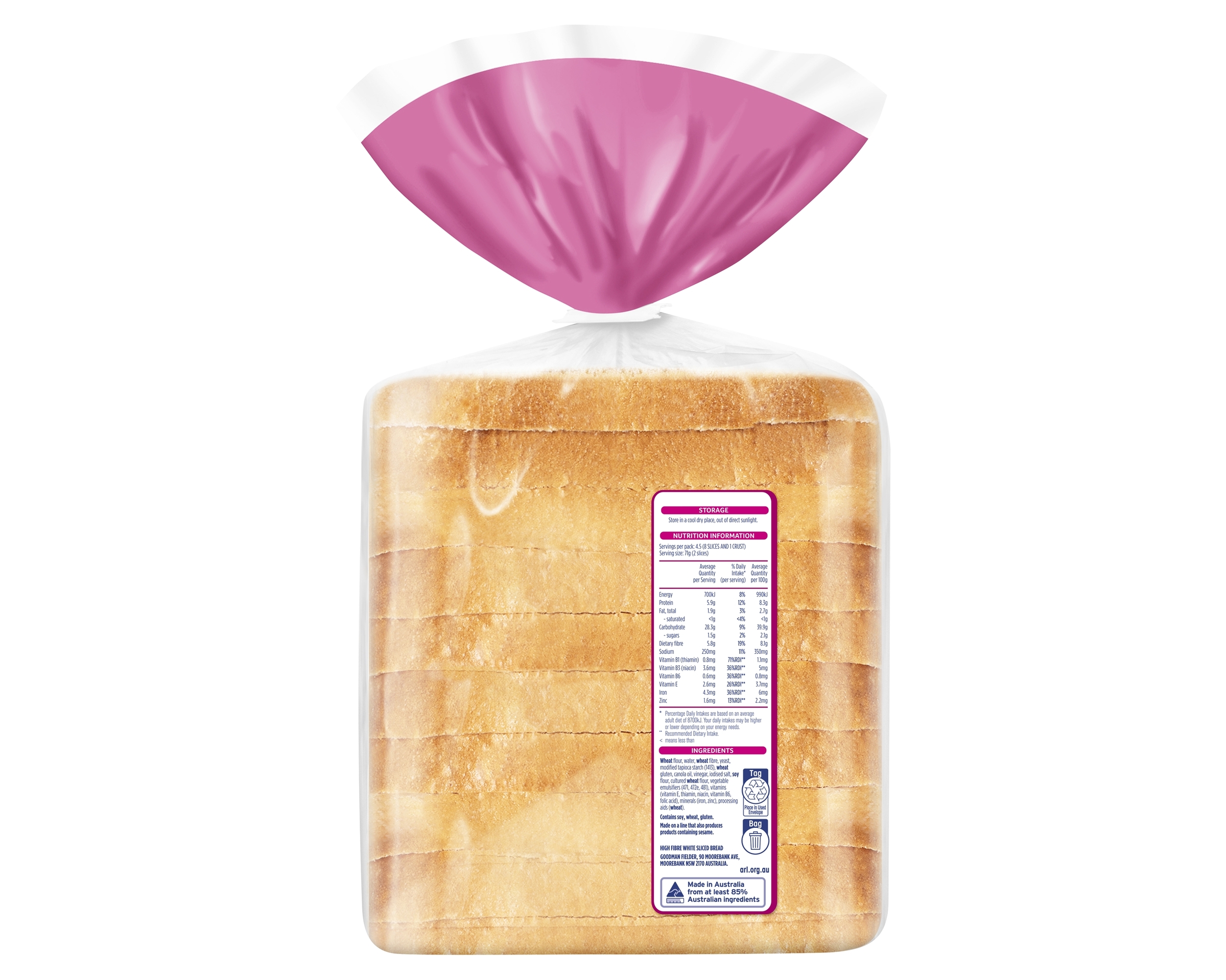 Wheat Flour, Water, Wheat Fibre, Yeast, Modified Tapioca Starch (1413), Wheat Gluten, Canola Oil, Vinegar, Iodised Salt, Soy Flour, Cultured Wheat Flour, Vegetable Emulsifiers (471, 472e, 481), Vitamins (Vitamin E, Thiamin, Niacin, Vitamin B6, Folic Acid), Minerals (Iron, Zinc), Processing Aids (Wheat)