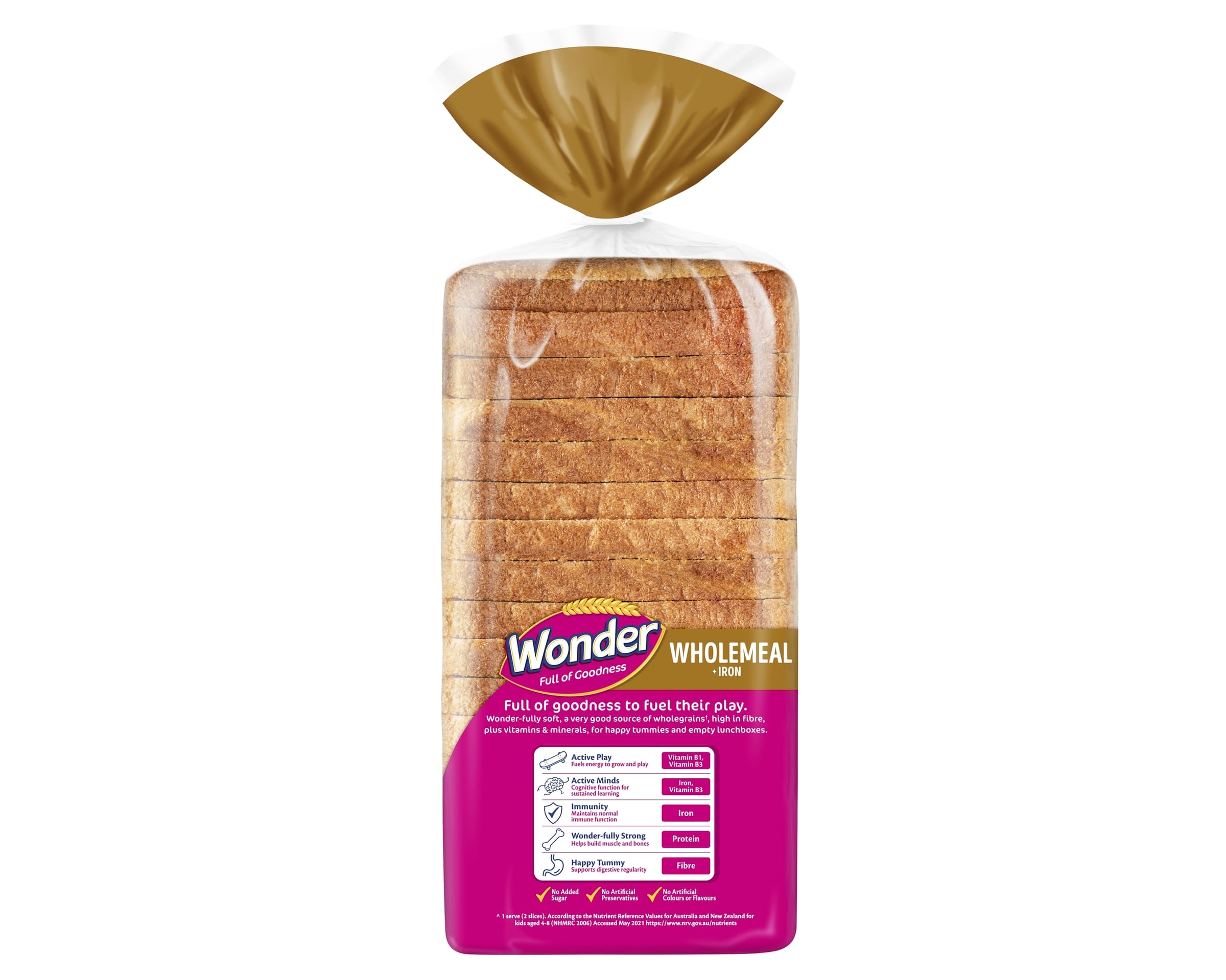 ^ 1 serve (2 slices). According to the Nutrient Reference Values for Australia and New Zealand for kids aged 4-8 (NHMRC 2006) Accessed May 2021 https://www. nrv. gov.