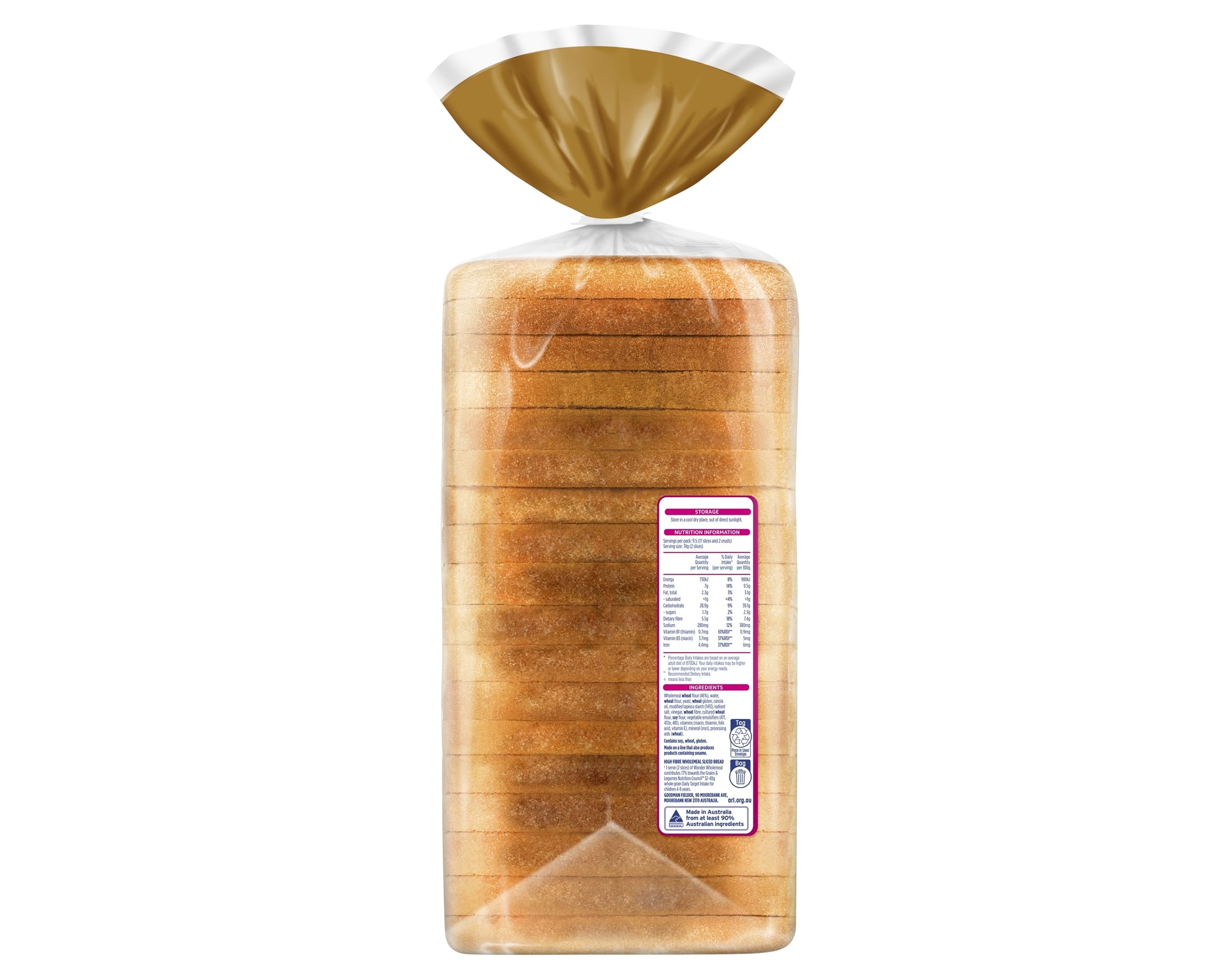 Wholemeal Wheat Flour (46%), Water, Wheat Flour, Yeast, Wheat Gluten, Canola Oil, Modified Tapioca Starch (1413), Iodised Salt, Vinegar, Wheat Fibre, Cultured Wheat Flour, Soy Flour, Vegetable Emulsifiers (471, 472e, 481), Vitamins (Niacin, Thiamin, Folic Acid, Vitamin E), Mineral (Iron), Processing Aids (Wheat)